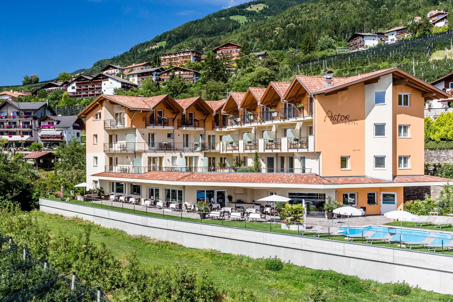 Das Hotel Astor liegt in sonniger Panoramalage oberhalb von Schenna und bietet einen einzigartigen Blick über das Meraner Land und die umliegende Bergwelt, einschließlich der eindrucksvollen Texelgruppe. Moderne, liebevoll gestaltete Zimmer und Suiten, authentische Südtiroler Gastfreundschaft und eine Genussküche mit regionalen Spezialitäten prägen das Haus. Im Wellnessbereich mit Pool und gemütlichen Ruhebereichen steht wohltuende Entspannung im Mittelpunkt. Ein besonderes Highlight ist der hauseigene Weinkeller: Er hält eine sorgfältig ausgewählte Kollektion erlesener Tropfen bereit, die das kulinarische Angebot abrunden. Direkt vor der Tür des Hotel Astor verlaufen zahlreiche Wander- und Bikewege – ideal für Aktivurlauber und Naturliebhaber. Ein Ort für erholsame Tage in Südtirol.