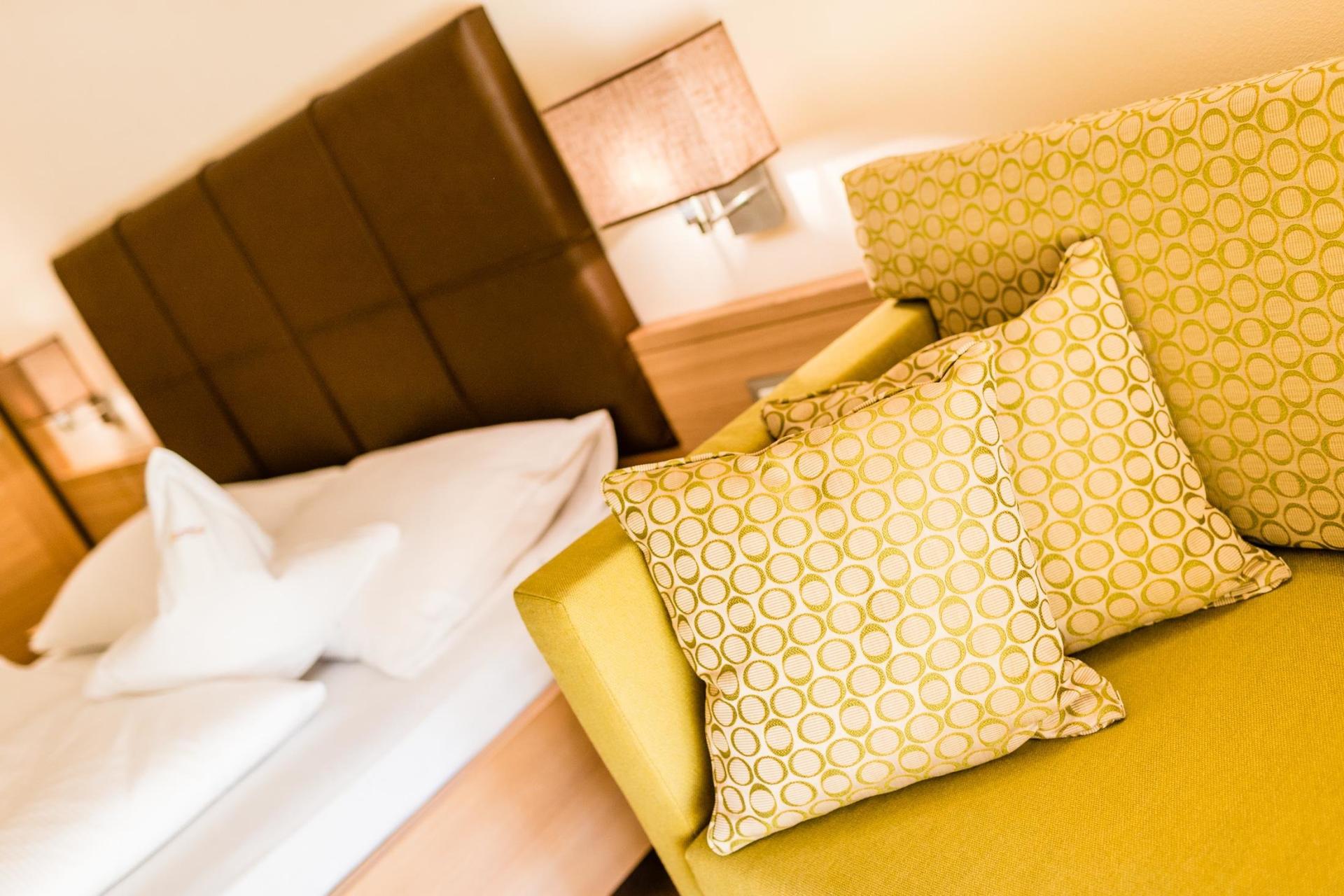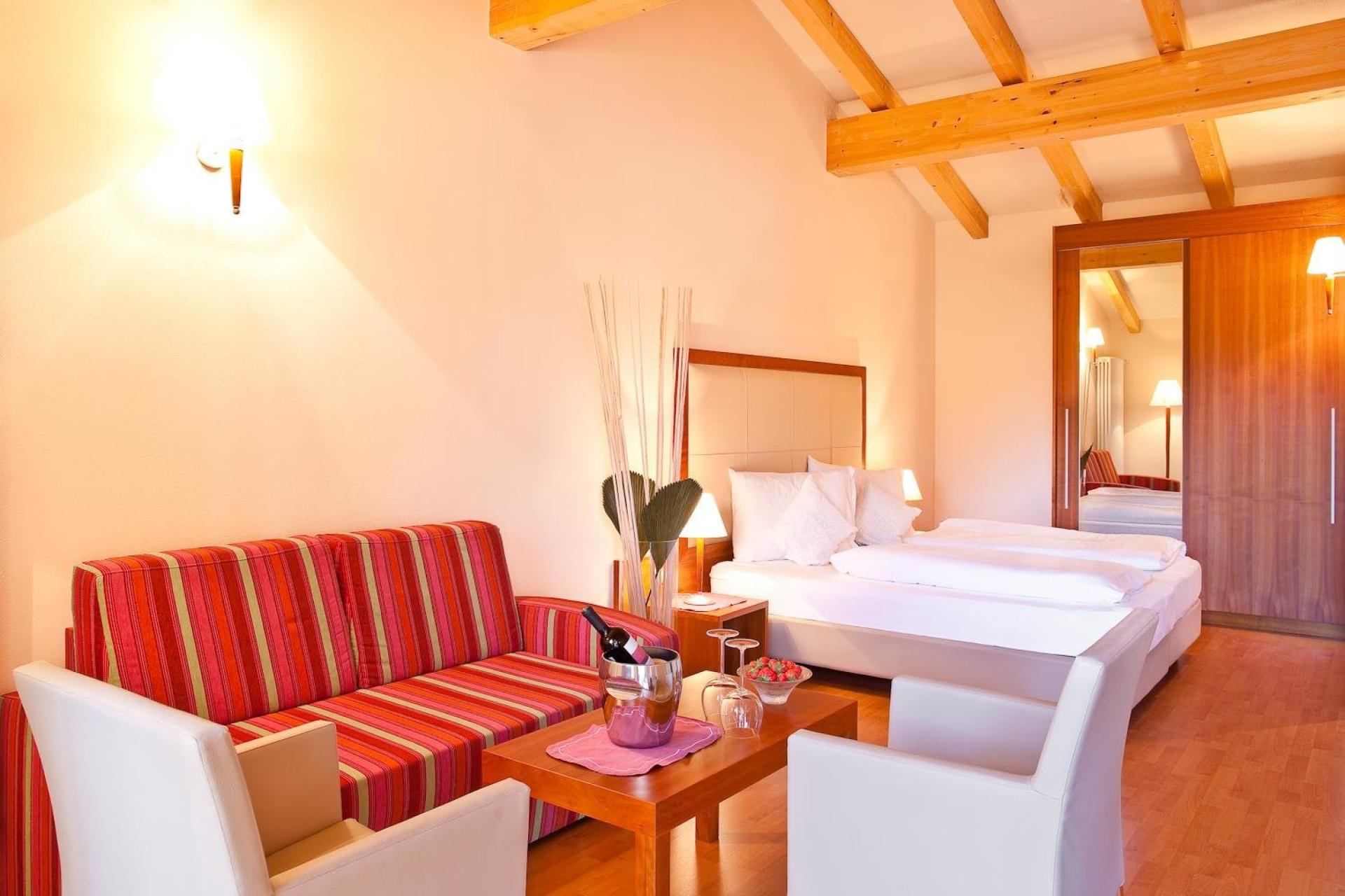 Der separate Wohn/Schlafraum, welcher für Kinder genutzt werden kann, sorgt dafür, dass alle Familienmitglieder ausreichend Platz und Raum haben. Flachbildschirm mit Sat-TV und Radio, Minibar, Telefon, Safe und Balkon mit Blick auf das Meranerland. Badezimmer mit Badewanne und/oder Dusche, WC, Bidet und Fön. Teilweise mit getrennten WC.