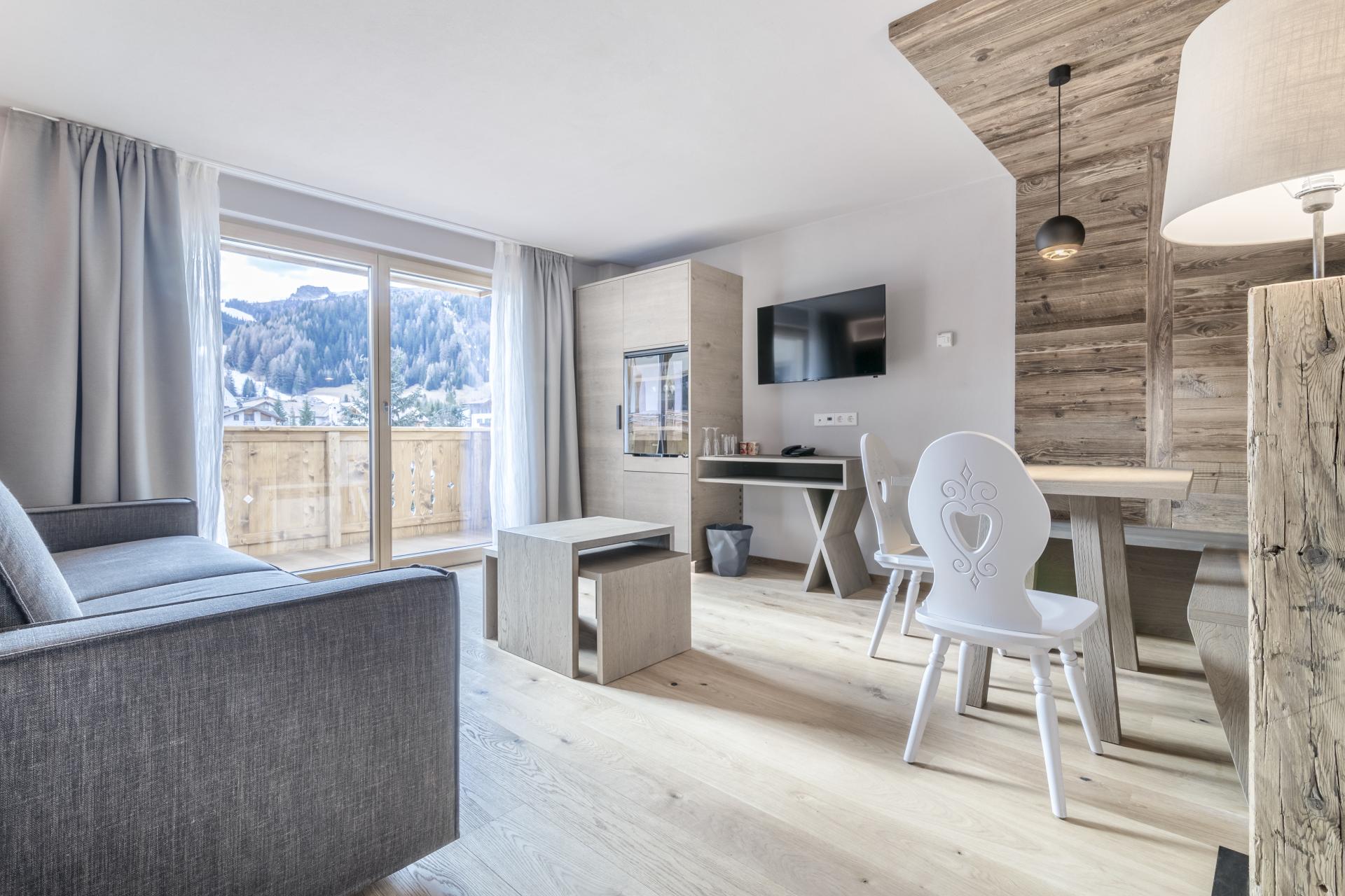 Diese Suite von 50 m² mit 2 Bädern hat einen direkten Blick auf die Pisten der berühmten Sellaronda und ist ideal für anspruchsvolle Gäste und große Familien.