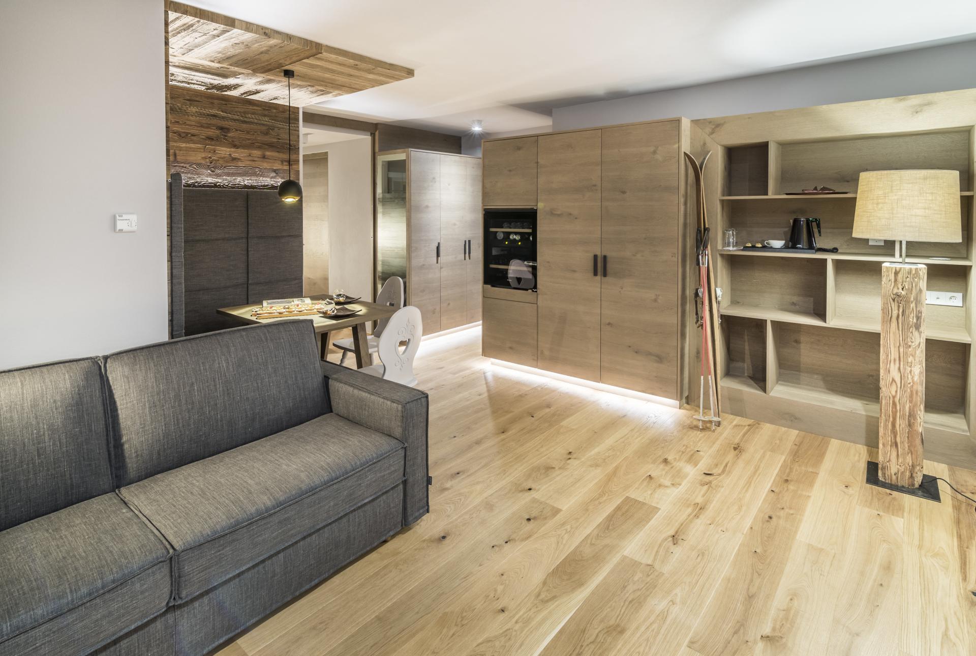 Die Sassongher Suiten sind bis ins kleinste Detail gepflegt. Für diese Zweiraumzimmer haben wir einen modernen alpinen Stil gewählt: grobes Holz aus Südtirol, preziöser Loden und moderne Einrichtung.