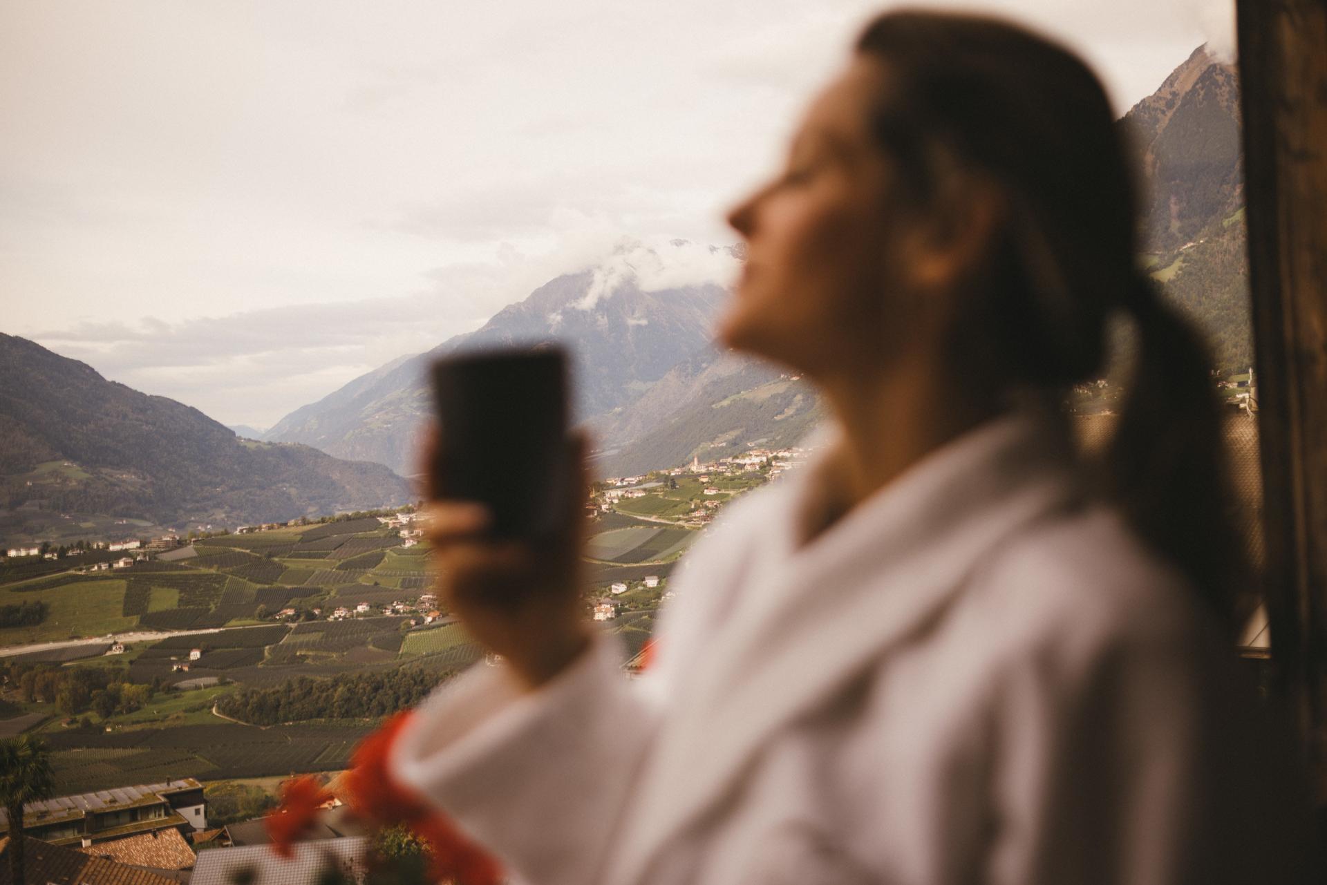 Ein elegantes Doppelzimmer mit leichter Dachschräge und einem Balkon, der mit Blick nach Meran die schönsten kurstädtischen Urlaubserinnerungen prägt – das ist das Doppelzimmer Juval. Exklusives Nussholz-Mobiliar und hochwertige Materialien machen es zu einem unvergesslichen Wohlfühl-Juwel in der obersten Etage des Stammhauses!