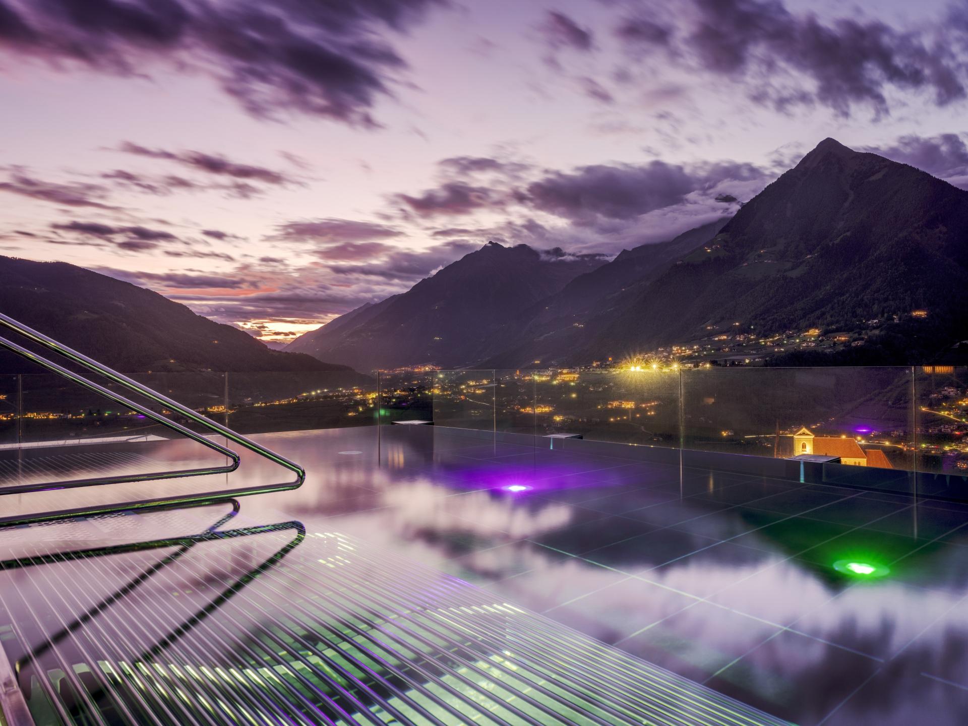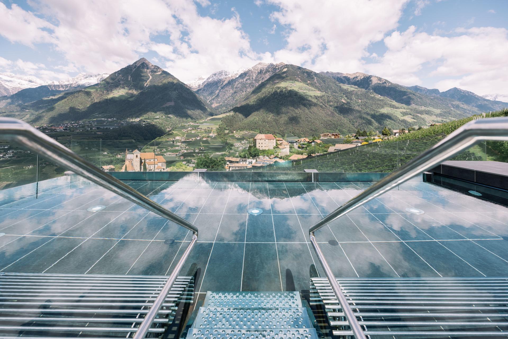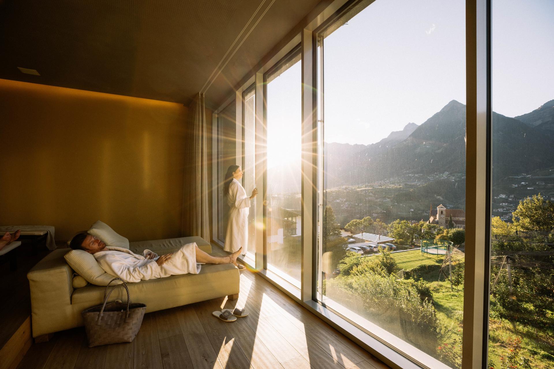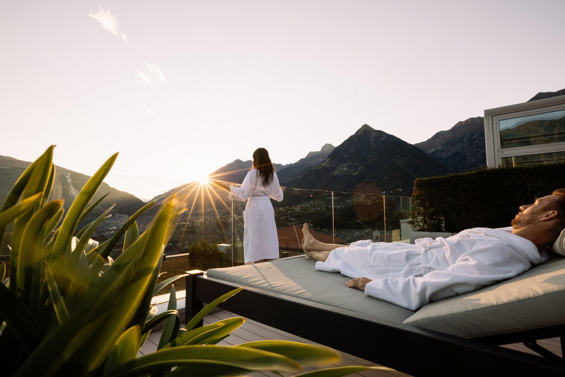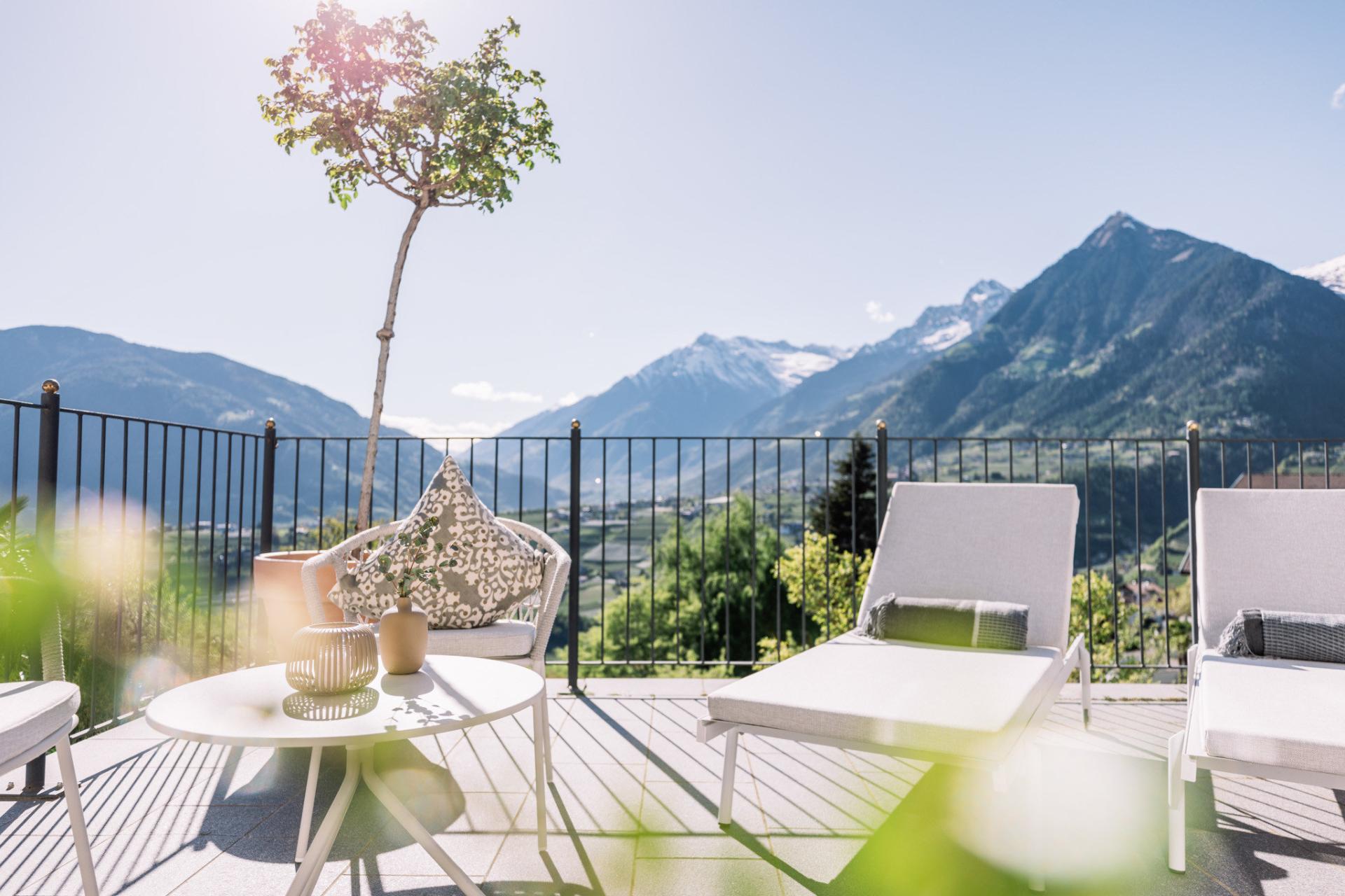Die luftig-helle Suite mit gläsernem Balkon ist ein echter Erholungs(t)raum: atemberaubender Blick über das Meraner Land, Sonnenliege, Sitzgruppe und Open-Air-Badewanne. Mit modernen Klima-Zimmerdecken für angenehme Raumtemperaturen zu jeder Jahreszeit. Diese geräumige Suite ist mit Sofalandschaft, Elektrokamin mit Flammeneffekt, Panoramafenster und vielen anderen Komfortelementen der richtige Ort zum Seele-baumeln-Lassen – und zwar buchstäblich, denn der Wohnbereich hat eine stilvolle Hängeschaukel. In dieser Suite sind keine Hunde erlaubt. (Mindestbelegung 3 Personen)