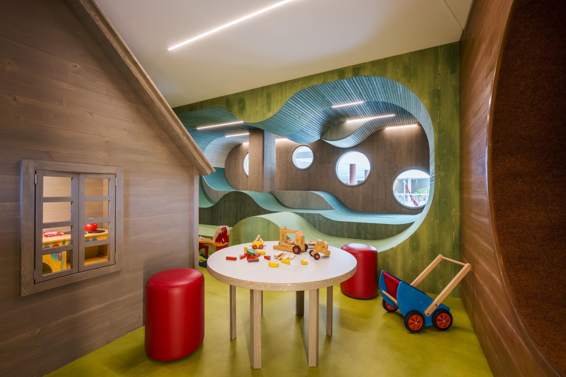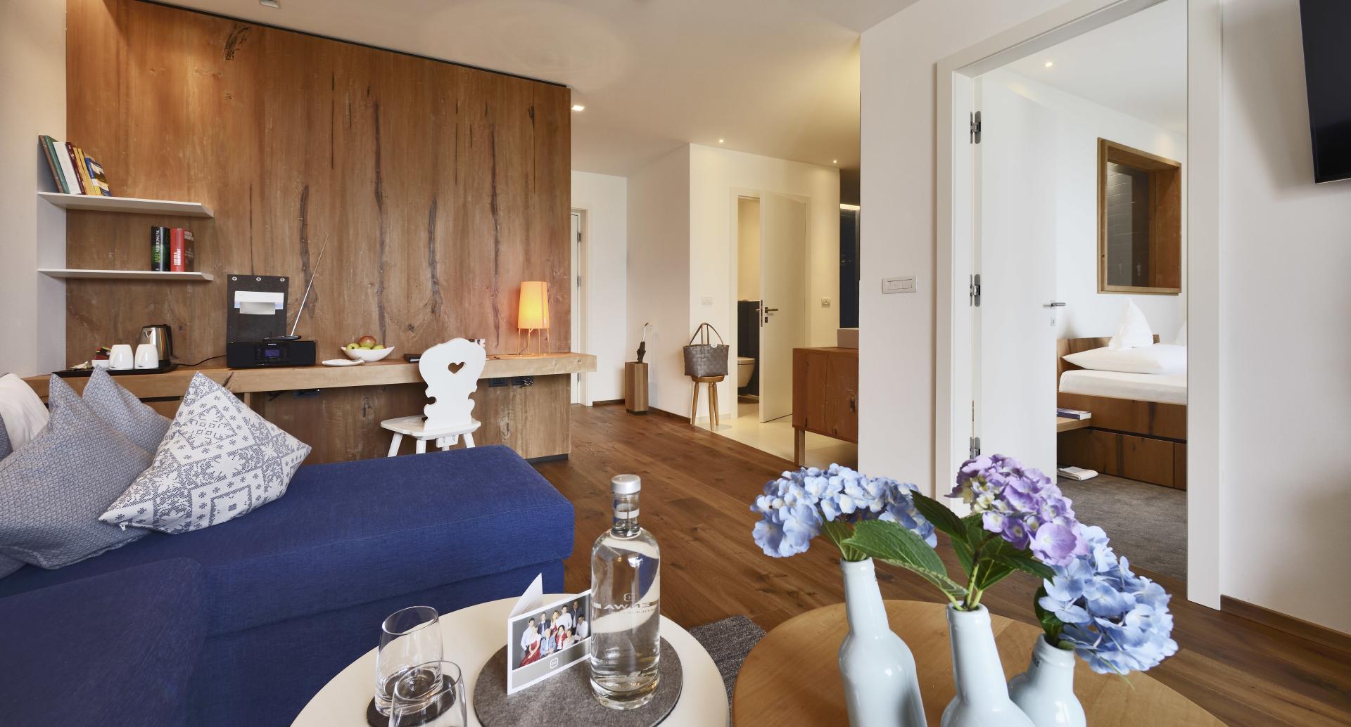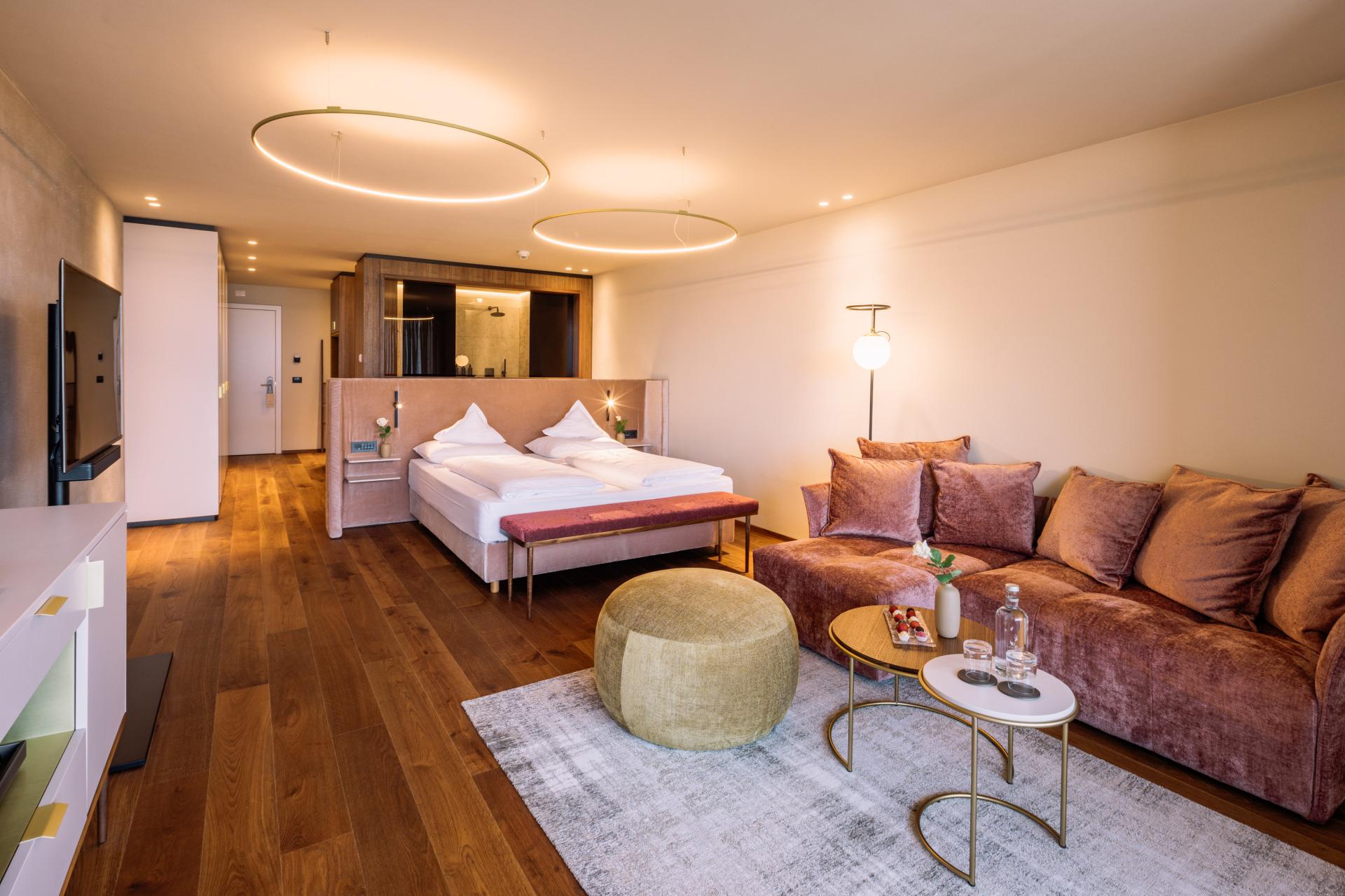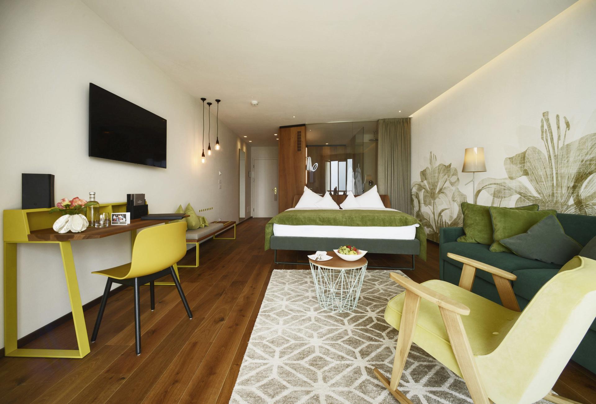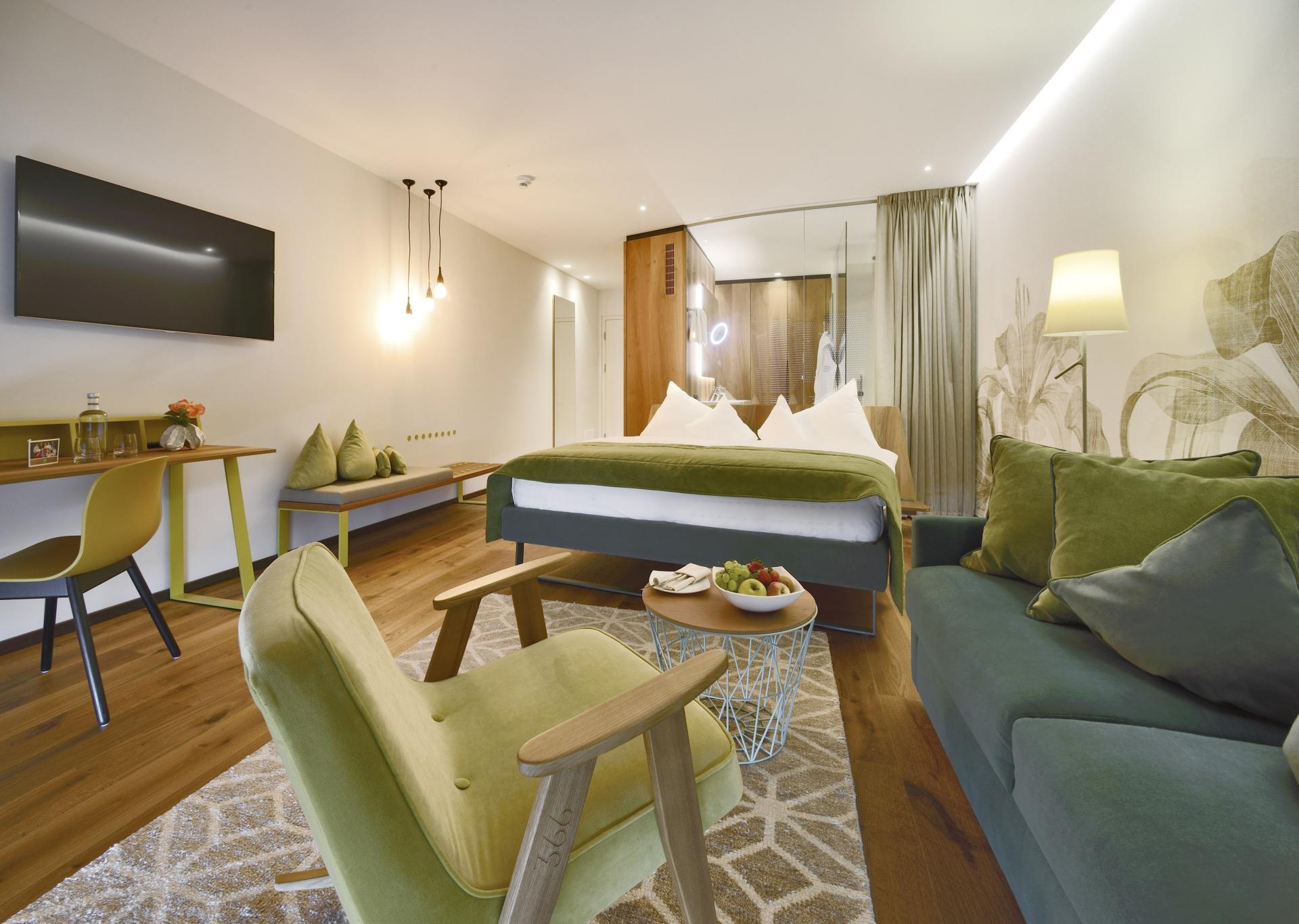 Das kombinierte Wohn-Schlafzimmer besticht in modernen Grüntönen, mit hochwertigen Möbeln und edlen Holzböden. Große Balkone mit stylischen Liegestühlen runden das Wohnerlebnis ab. Das Badezimmer mit Doppelwaschbecken und Glasfront blickt weit auf die umliegende Bergwelt. Moderne Klima-Zimmerdecken sorgen für behagliche Temperaturen in der kühlen Jahreszeit und angenehme Frische im Sommer. In diesem Zimmer sind keine Hunde erlaubt.
