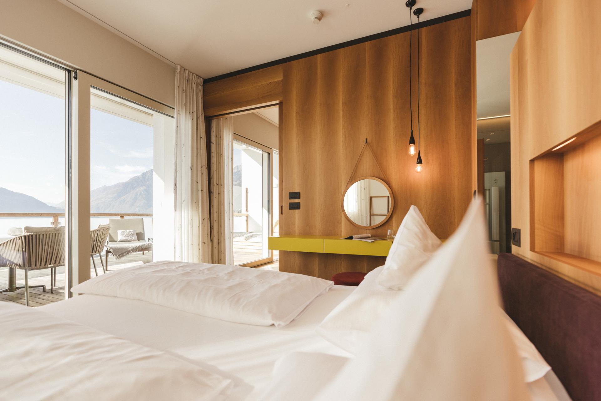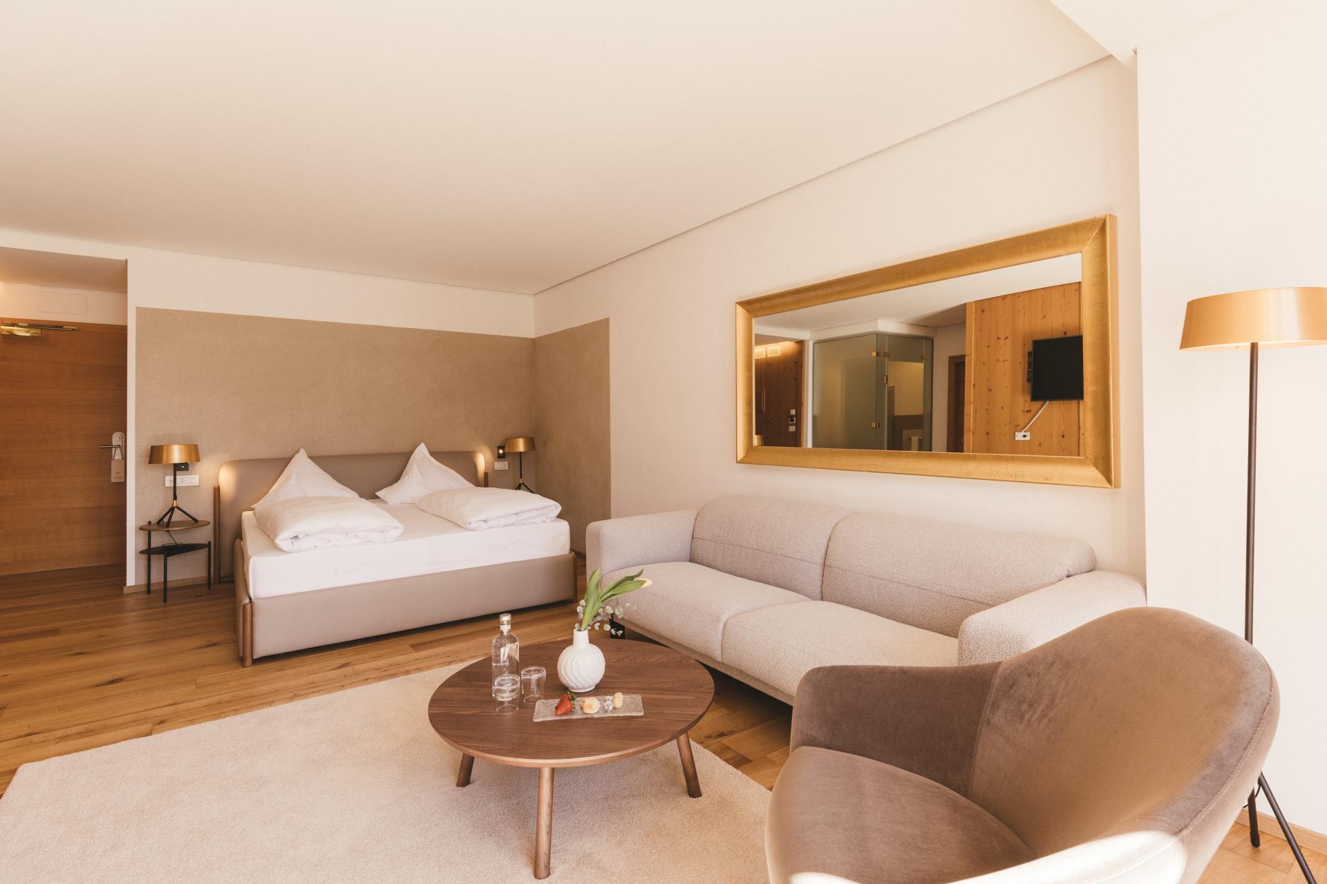 Ruhige Farbtöne, natürliche Materialien und ein fein abgestimmtes Lichtkonzept prägen diese großzügige Juniorsuite im Haus Traube. Der halb abgetrennte Schlafbereich schafft Struktur und Offenheit und wird durch einen gemütlichen Wohnbereich mit ausziehbarer Schlafcouch für Kinder ergänzt. Je nach Lage im ersten Stock mit Terrasse und Holzboden oder im zweiten Stock mit Balkon und Teppichboden öffnet sich der Blick über den Hohenwart-Garten und das Meraner Land. Die innovativen Klima-Zimmerdecken fügen sich unauffällig in das Raumkonzept ein und sorgen das ganze Jahr über für ein angenehm ausgeglichenes Wohngefühl.