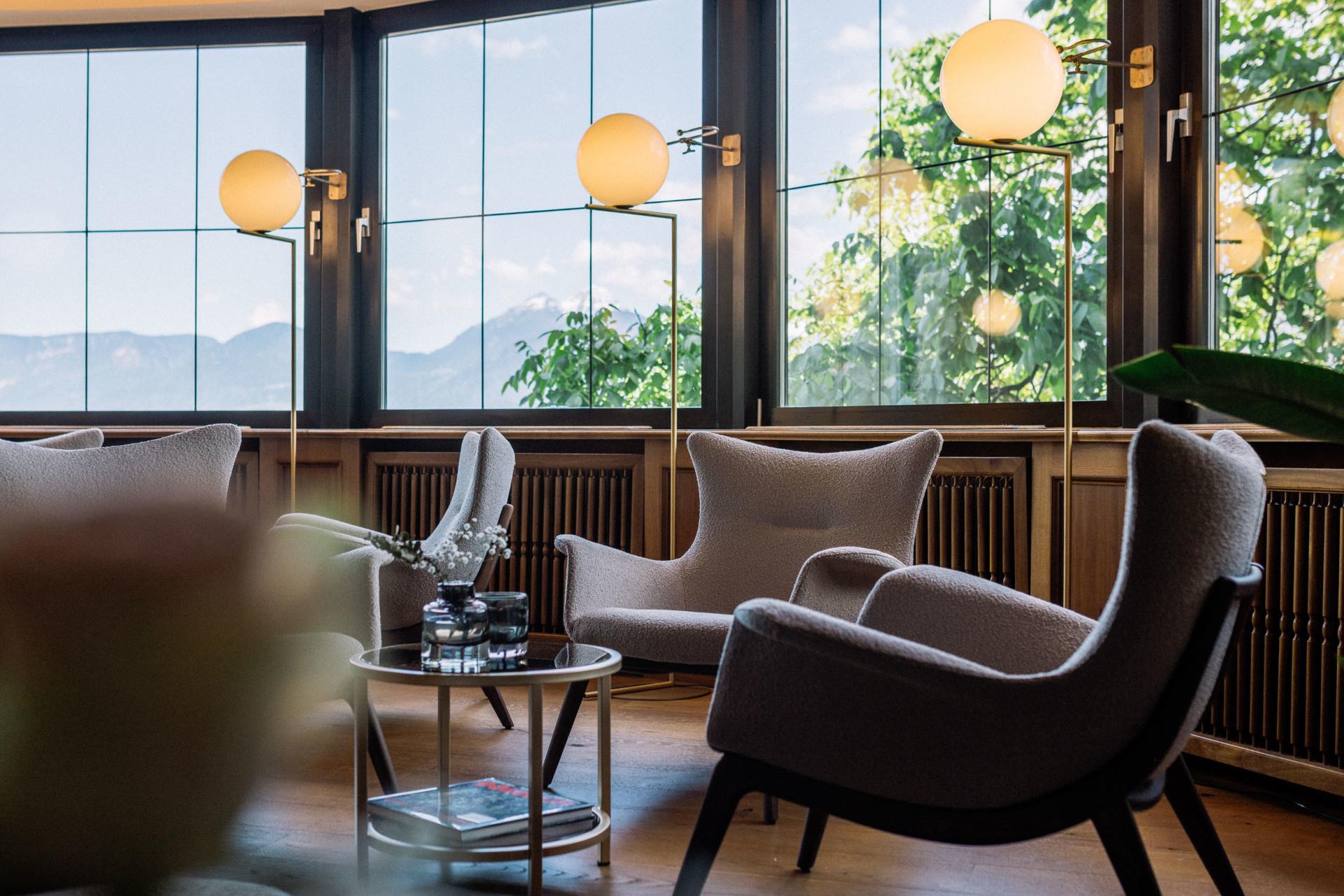 Moderne Möbel in ruhigen Senf- und Naturtönen, Holzboden und ein gut durchdachtes Lichtkonzept schaffen ein angenehmes und entspanntes Raumerlebnis. Ein Highlight ist der Blick aus den komfortablen Betten über den Balkon auf die malerische Berglandschaft Südtirols. Innovative Klima-Zimmerdecken sorgen ganzjährig für eine angenehme Temperaturregelung. In diesem Zimmer sind keine Hunde erlaubt.