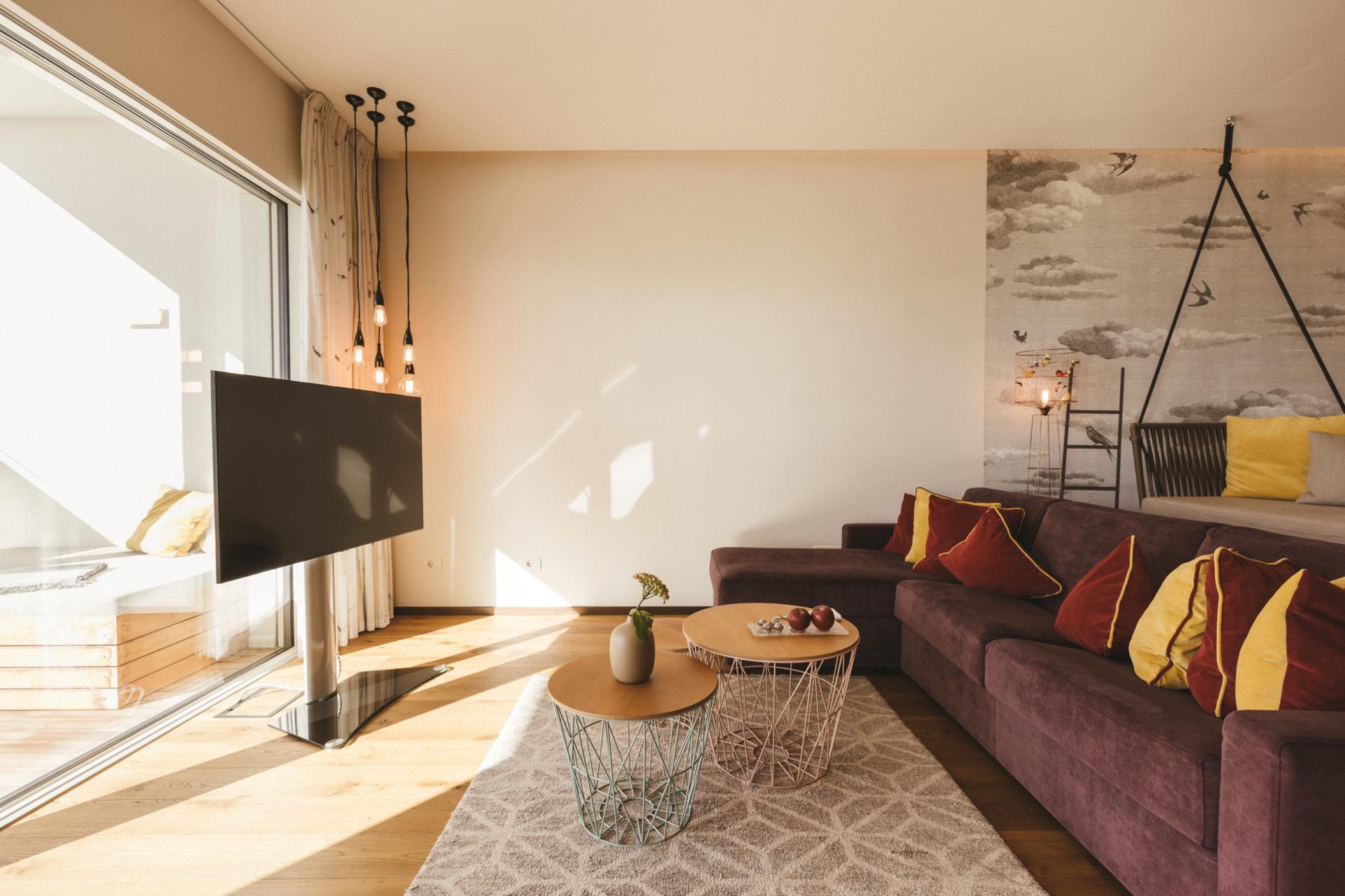 Luftig, hell und weitläufig präsentiert sich diese außergewöhnliche Suite im vierten Stock des Hauses Traube. Große Glasflächen öffnen den Blick über das Meraner Land und lassen Innen und Außen fließend ineinander übergehen. Der weitläufige Balkon mit Open-Air-Badewanne, Daybed, Sonnenliege und Sitzgruppe wird zum privaten Rückzugsort unter freiem Himmel. Zwei separate Schlafzimmer mit jeweils eigenem Badezimmer bieten Rückzug und Privatsphäre für die ganze Familie. Der großzügige Wohnbereich mit Sofalandschaft, Elektrokamin und stilvoller Hängeschaukel schafft Raum zum Entspannen und Verweilen. Die innovativen Klima-Zimmerdecken fügen sich unauffällig in das Raumkonzept ein und sorgen das ganze Jahr über für ein angenehm ausgeglichenes Wohngefühl.