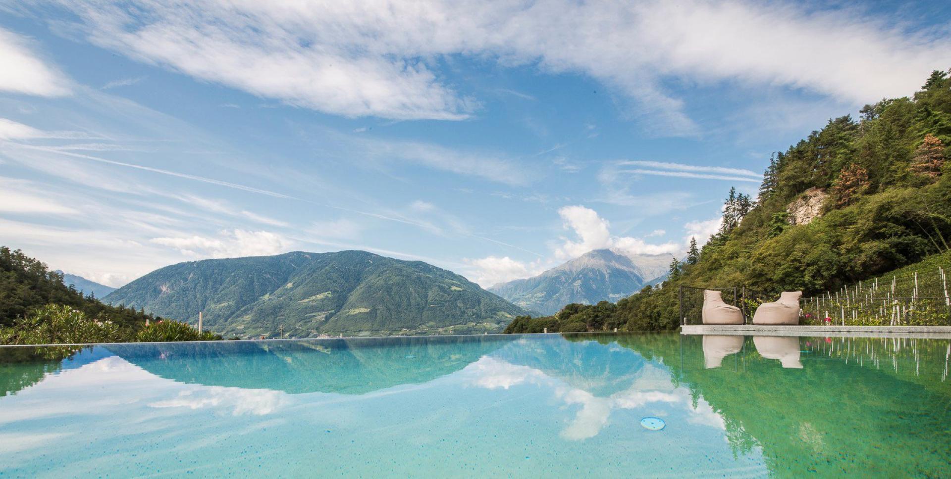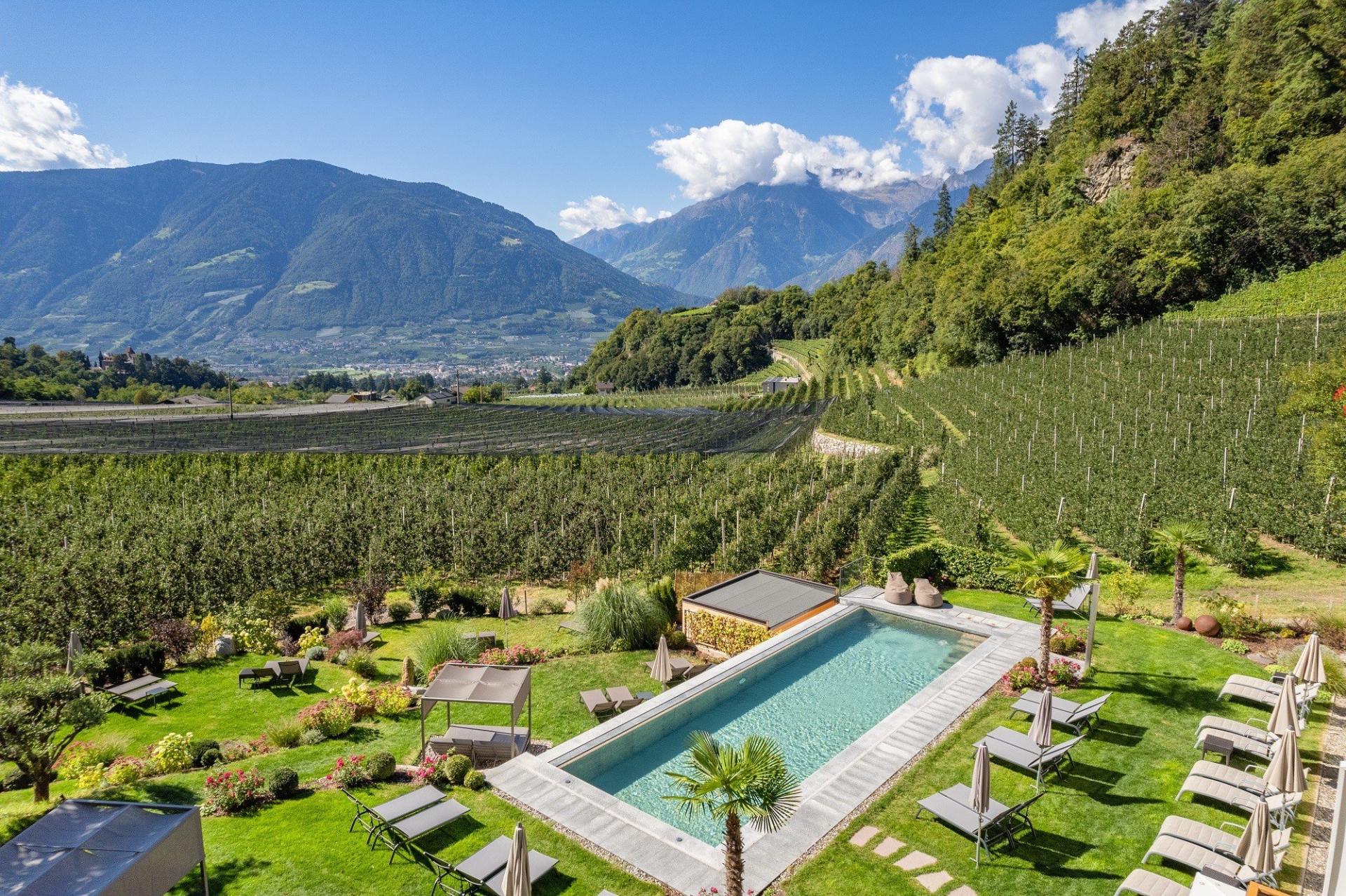 Mitten in den Apfelgärten ist das Hotel Kiendl ein erholsames Urlaubsdomizil mit traumhaftem Ausblick. Im familiär geführten Betrieb wird viel Wert auf die individuelle und persönliche Betreuung der Gäste gelegt. Genießen Sie das Beste, das Südtirol zu bieten hat, auf der Toskana-Terrasse L’ULIVO: Umgeben von Olivenbäumen, Granatapfelbäumen und Zypressen sowie den Südtiroler Bergen erleben Sie hier die einzigartige alpin-mediterrane Atmosphäre. Genießen Sie Ihr Frühstück und Ihr Abendmenü bei angenehmen Temperaturen und Toskana-Feeling. Der Wellnessbereich überrascht mit einem Panorama-Indoor-Pool und einem Infinity-Outdoor-Pool mit Zugang zur Gartenanlage. Die finnische Sauna und das Dampfbad sorgen für Erholung. Kulinarisch werden Sie im Hotel Kiendl rundum verwöhnt. Das Küchenteam vereint das Beste aus alpiner und mediterraner Küche: Neben einem Fünf- oder Sechs-Gänge-Menü erwartet Sie beinahe täglich ein weiteres kulinarisches Highlight. Freuen Sie sich auf Garten-Aperitifs, Gala-Dinner und verführerisch süße Dessert-Buffets.