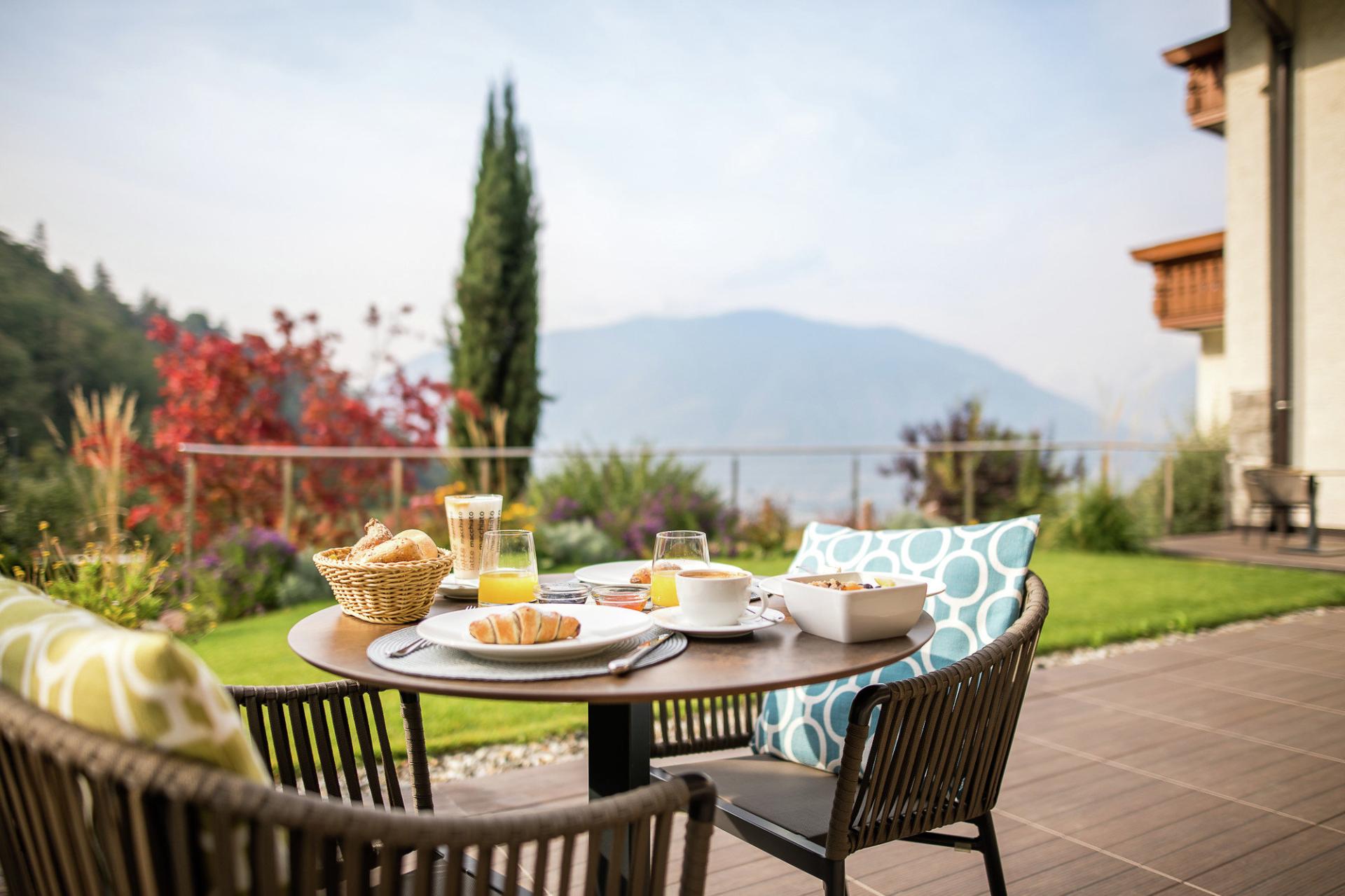 Ein Südbalkon mit Panoramablick auf Meran und die Berge und ein zweiter Balkon mit Blick in den Naturgarten oder zum großen Kastanienbaum.