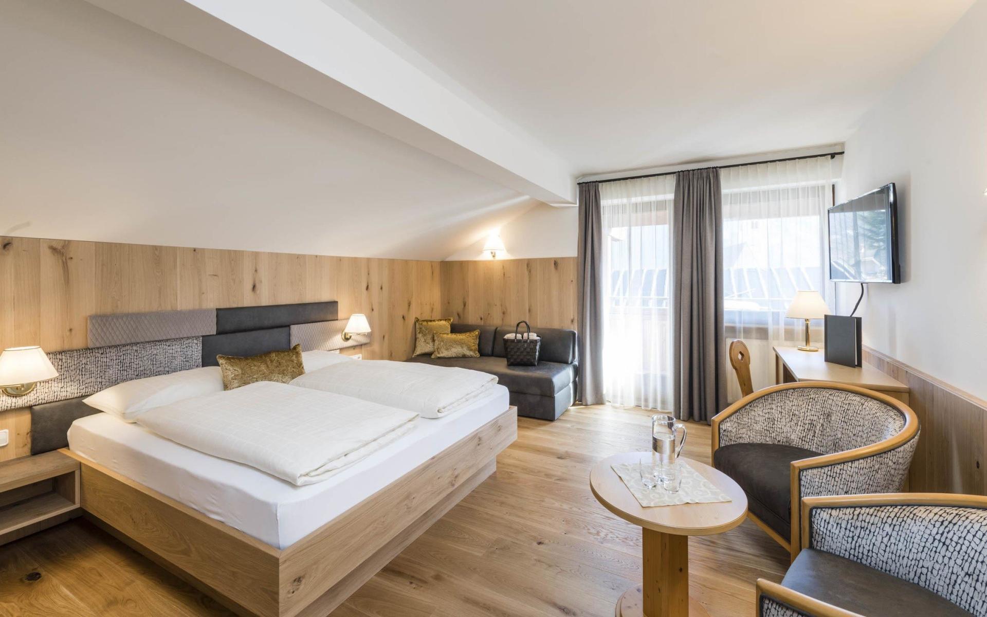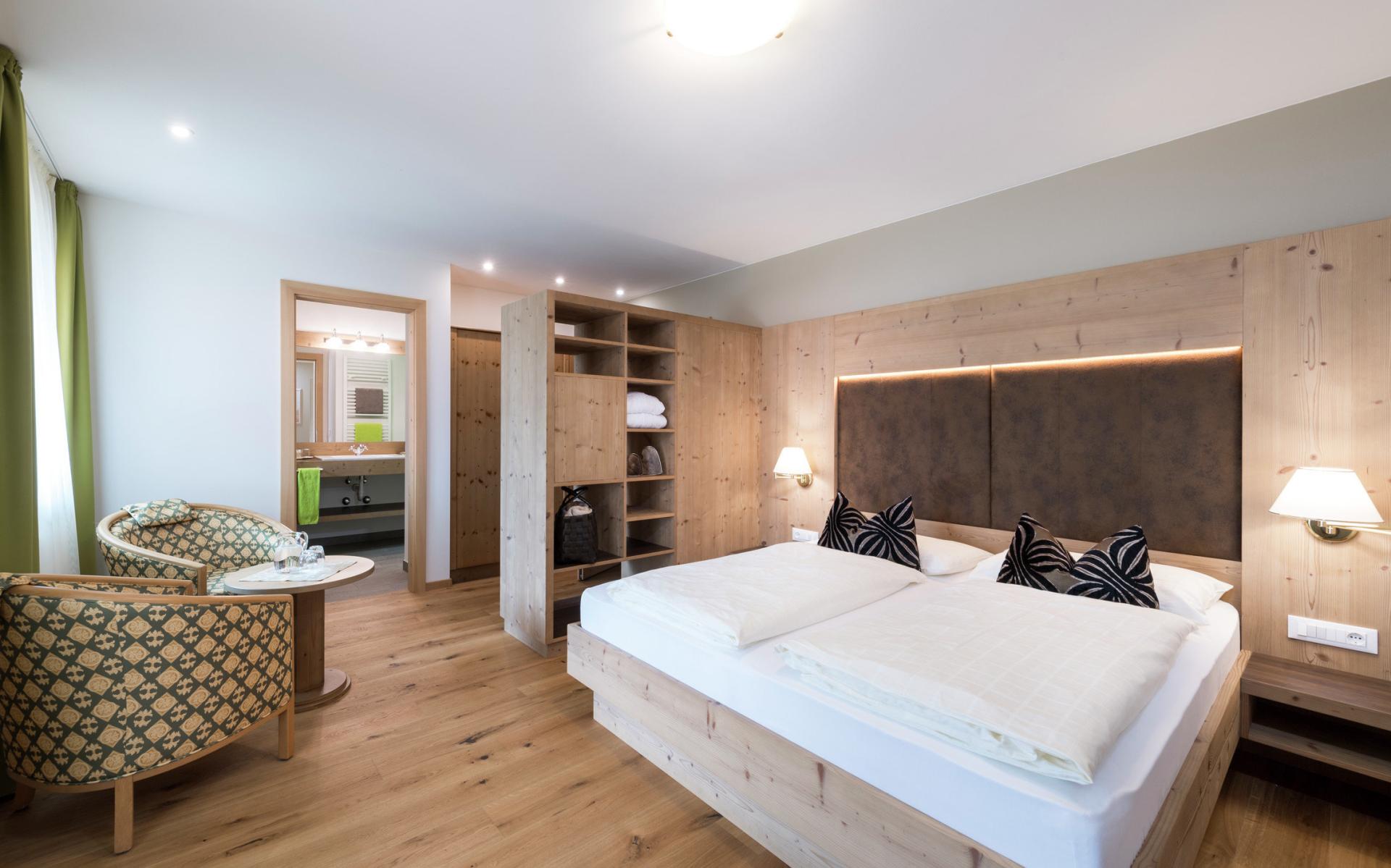 Hochwertiges Wohn-Schlaf-Doppelzimmer in Massivholz mit Holzboden, Balkon, Sat-TV, Telefon, Safe. Das Bad ist mit Dusche, Föhn und Kosmetikspiegel ausgestattet, das WC samt Bidet ist abgetrennt. Für die Dauer Ihres Aufenthaltes stehen Ihnen kuschelige Bademäntel zur Verfügung.