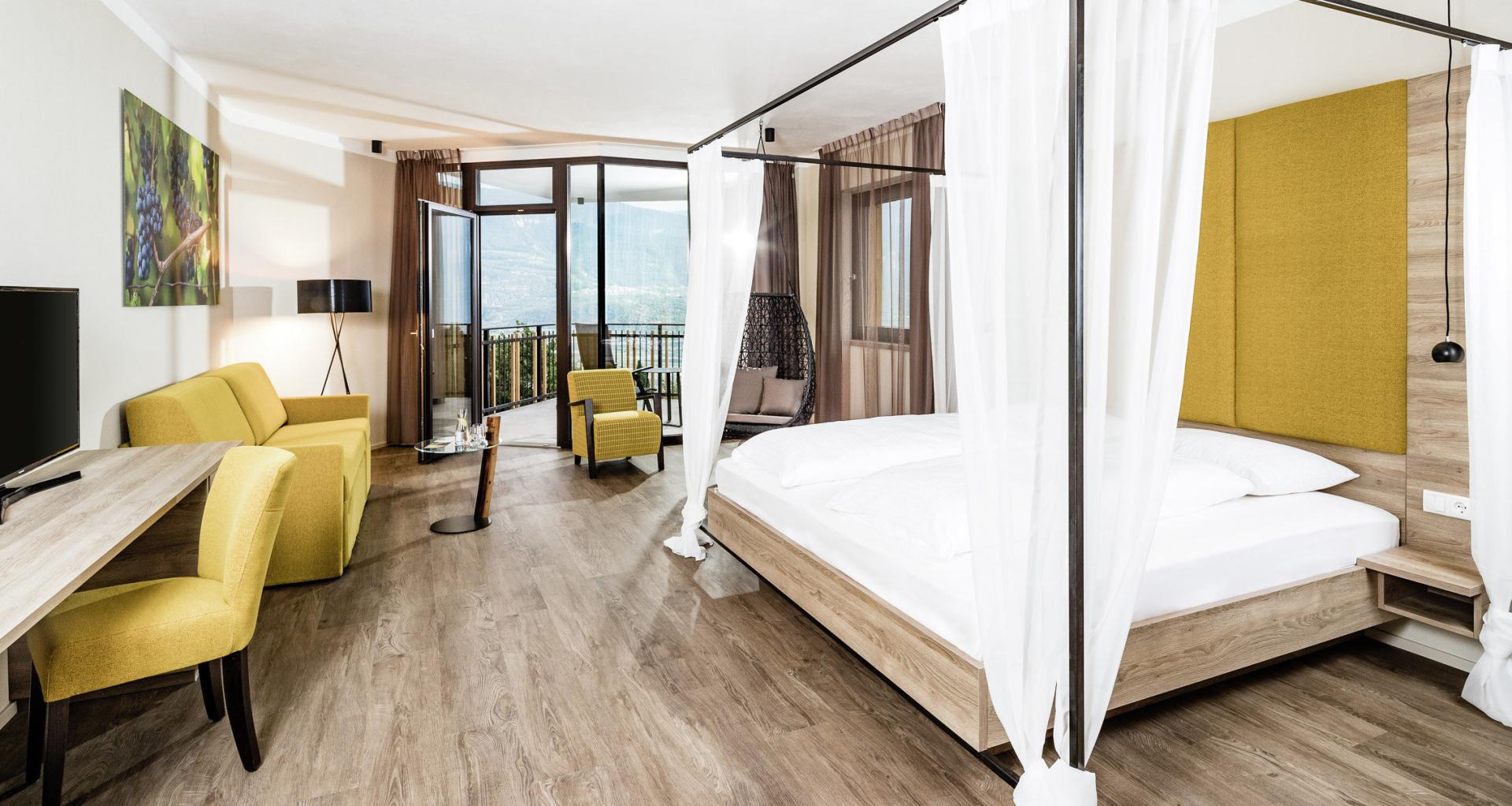 12 m2 sonnen Balkon mit Blick in die Reblandschaft und dem gesamten Südtirols Süden. Großzügige, luxuriöse Suite mit 43m2, Kingsizebett, optisch abgetrennter Wohnbereich mit ausziehbarer Couch, Leseliege, modernes Badezimmer mit Dusche, abgetrenntem Bidet und WC. Die Suite ist ausgestattet mit Flatscreen TV, W-Lan, Safe, Minibar, Föhn, Bodenklima.