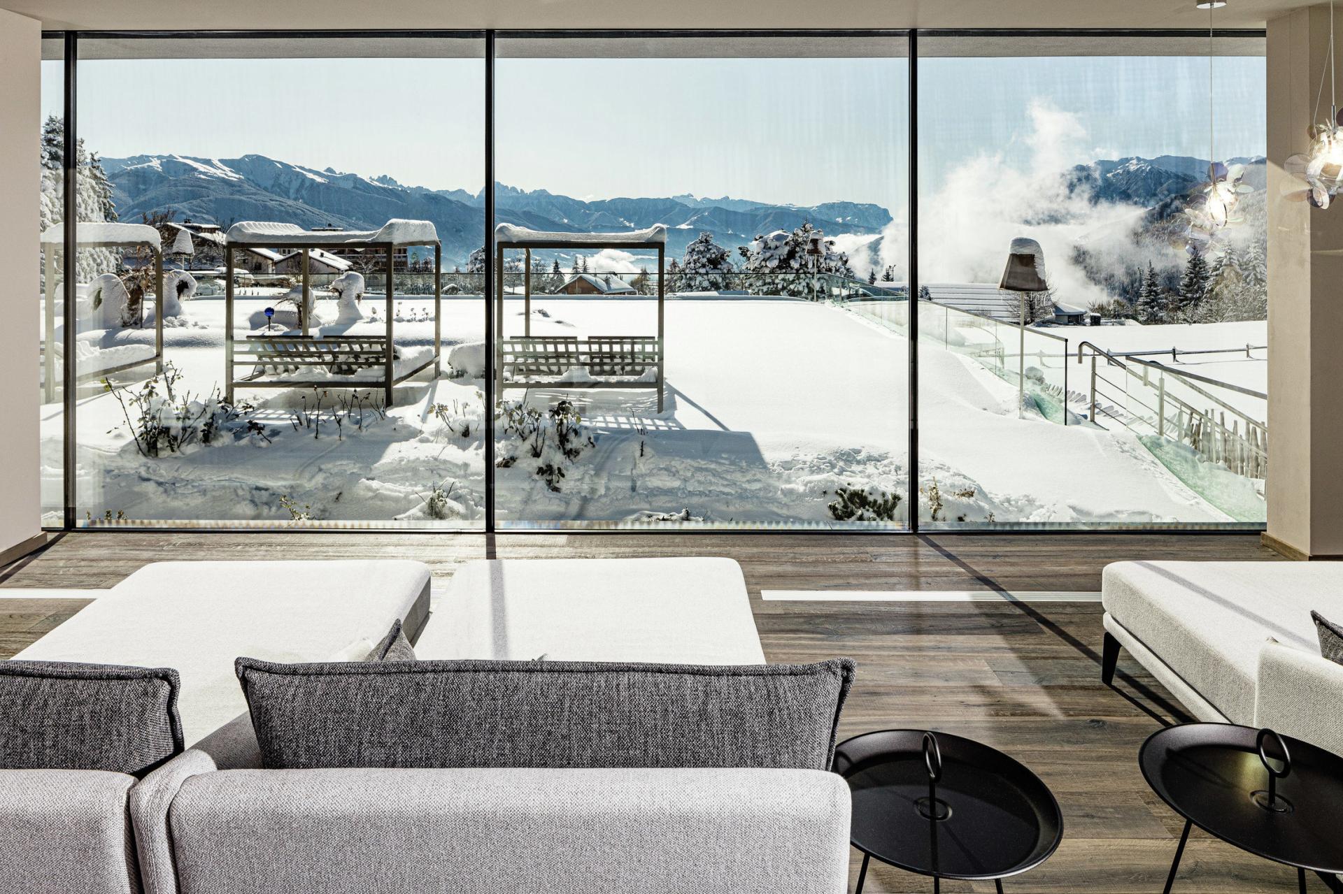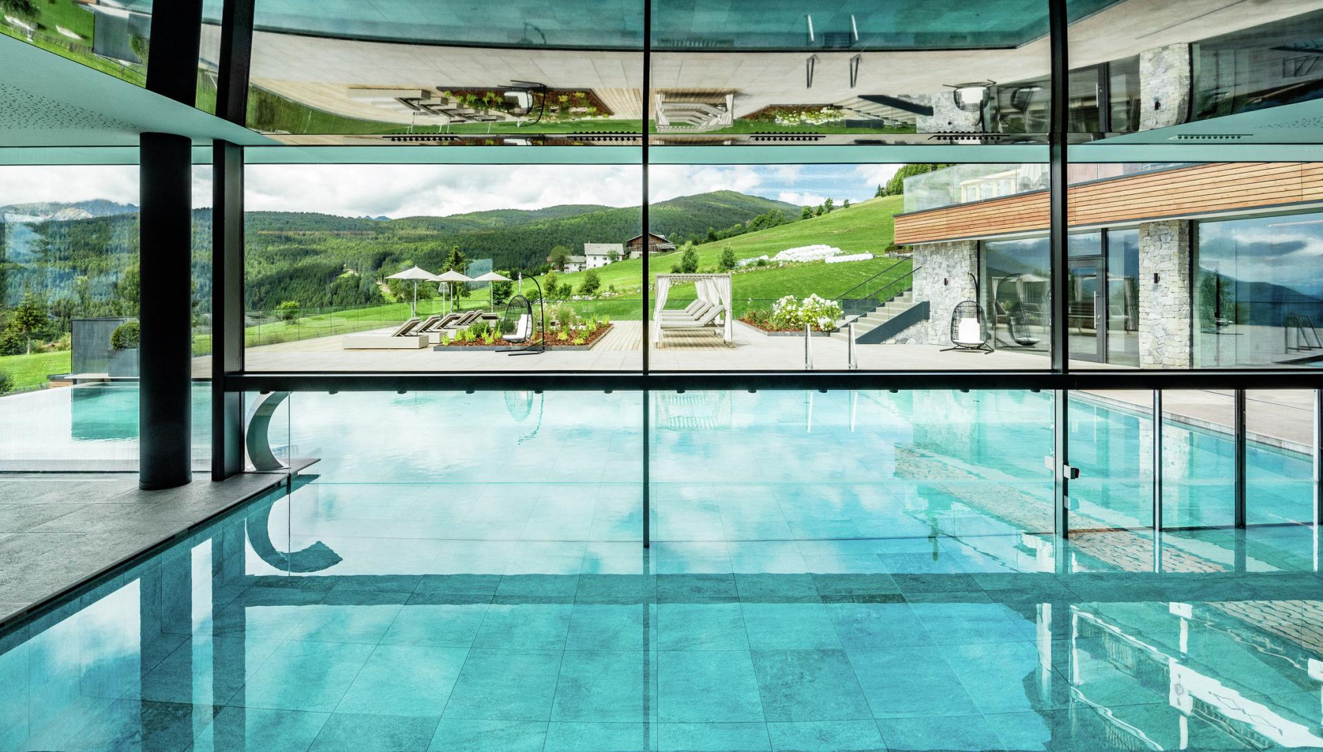 18 Meter beheizter Außenpool - Infinity Pool mit herrlichem Rundblick auf die Dolomiten und Panoramahallenbad