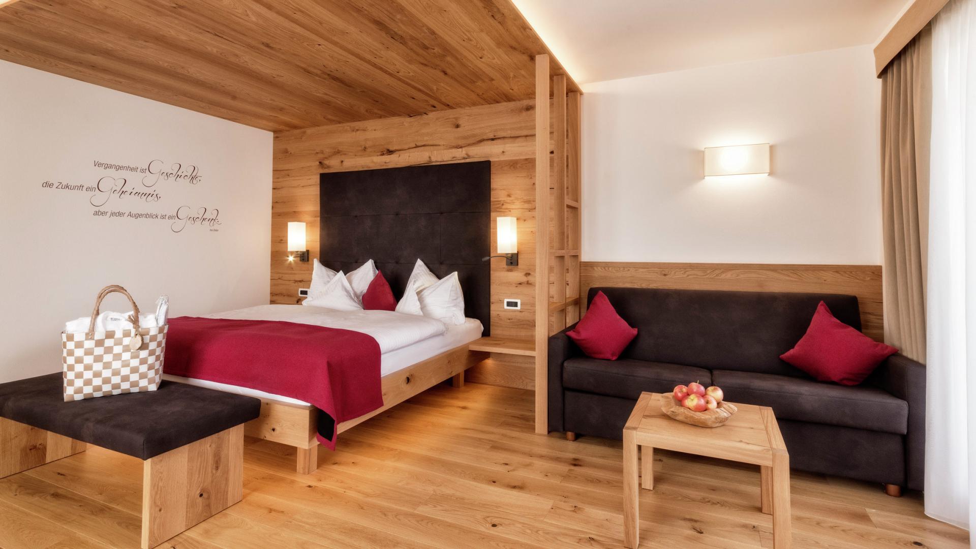 Edles Deluxe Zimmer für 2 oder 3 Personen auf 30 m² mit Panoramabalkon zur Ost – oder Westseite und Ausblick auf die Südtiroler Bergwelt. Ausgestattet mit heimischer Eiche- und teils mit Zirbenholz kombiniert, Naturholzboden, gemütlicher nicht abgetrennter Wohnbereich mit bequemer Sesselgarnitur oder Couch, Schreibtisch, Flat-TV mit SAT, Safe, Kühlbox, Telefon, kostenloses W-LAN, Wellnesstasche mit kuscheligem Bademantel und Badeschlappen, Badezimmer mit Dusche, WC, Bidet, Föhn und Kosmetikspiegel.