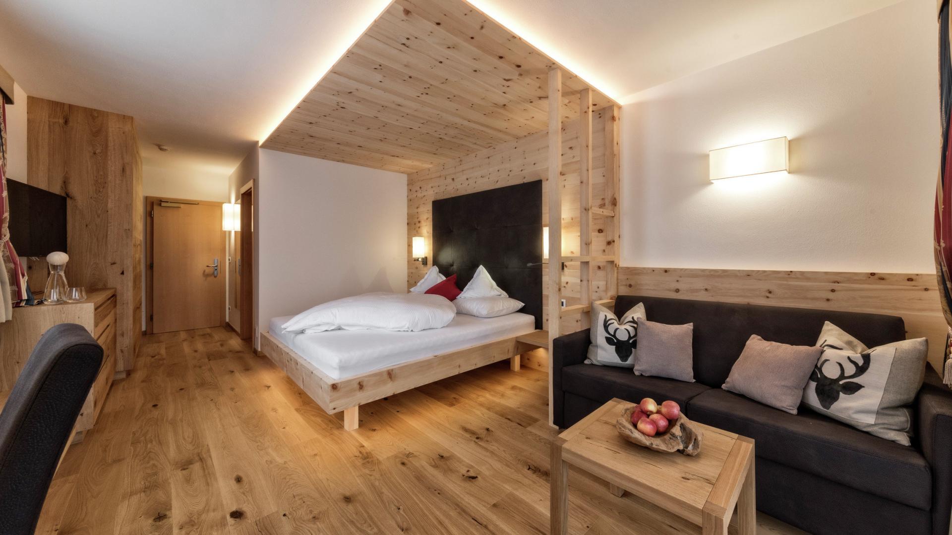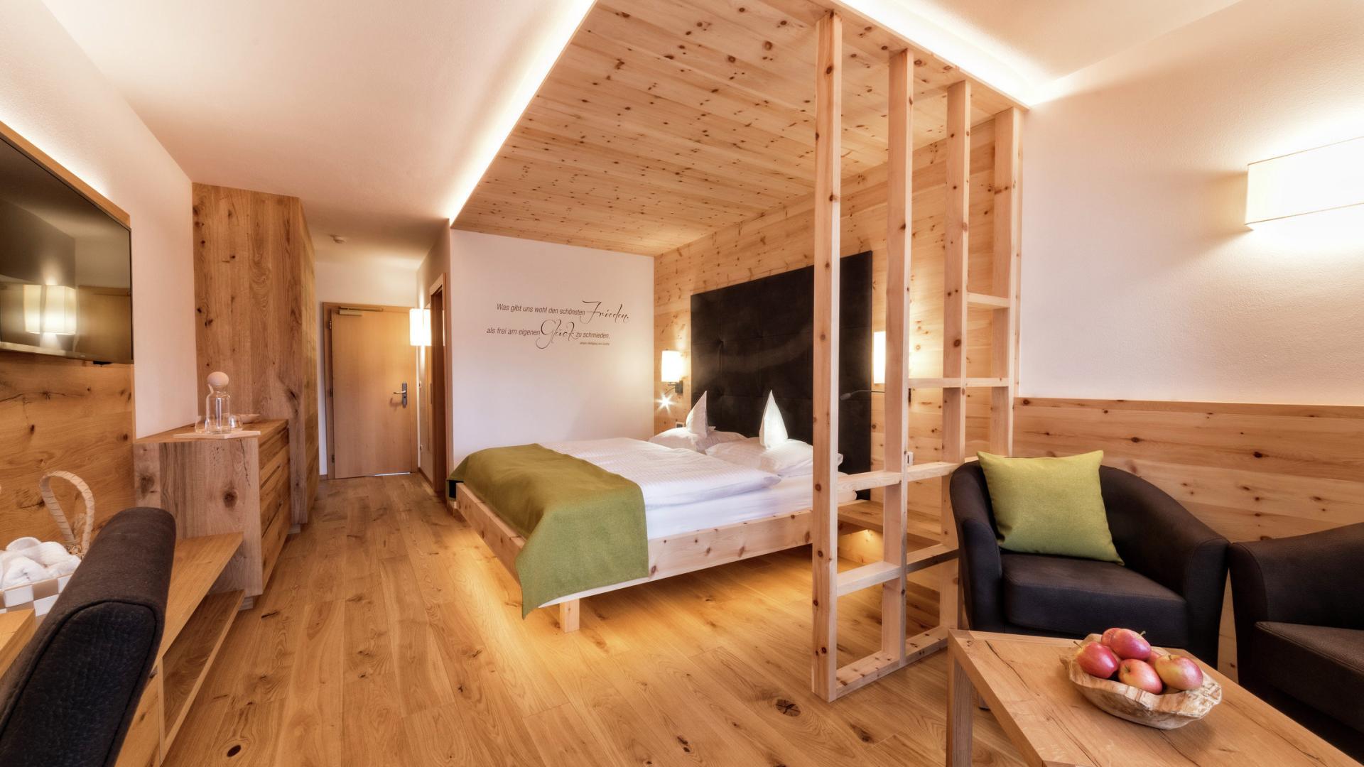 Ausgestattet mit heimischem Zirben- und Eichenholz (das Zirbenholz reduziert die Herzfrequenz und sorgt für innere Ruhe und erholsameren Schlaf), Naturholzboden, moderne Sesselgarnitur, Schreibtisch, 40 Zoll Flat-TV mit SAT, Safe, Kühlbox, Telefon, kostenloses W-LAN, Wellnesstasche mit kuscheligem Bademantel und Badeschlappen, Badezimmer mit Dusche, WC, Bidet, Fön und Kosmetikspiegel.