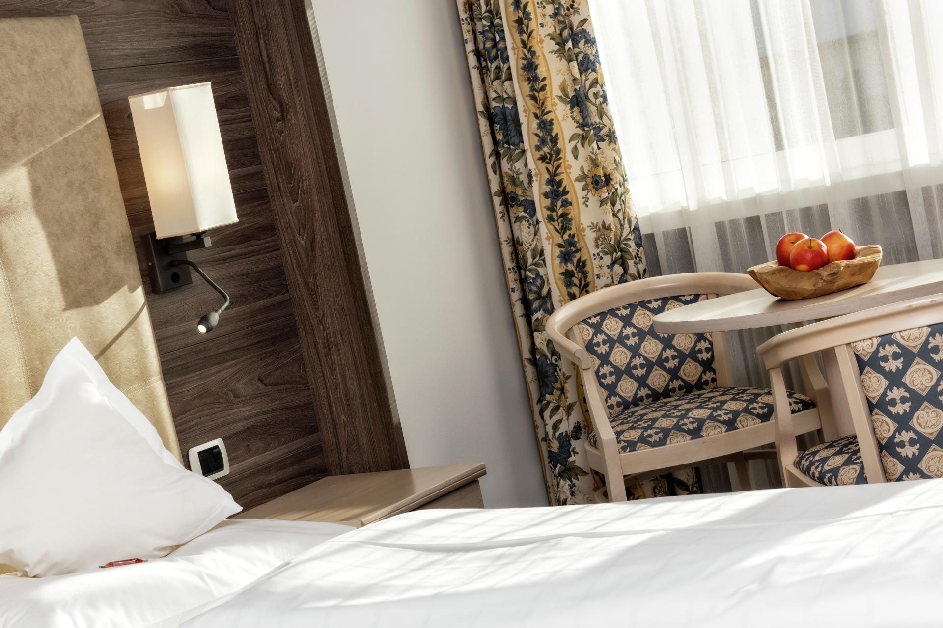 Ausgestattet mit heimischem Eichenboden, gemütlicher Sitzecke, Boxspringbett, Flat-TV mit SAT, Safe, Kühlbox, Telefon, kostenloses W-LAN, Wellnesstasche mit kuscheligem Bademantel und Badeschlappen, Badezimmer mit Dusche, WC, Bidet, Fön und Kosmetikspiegel.