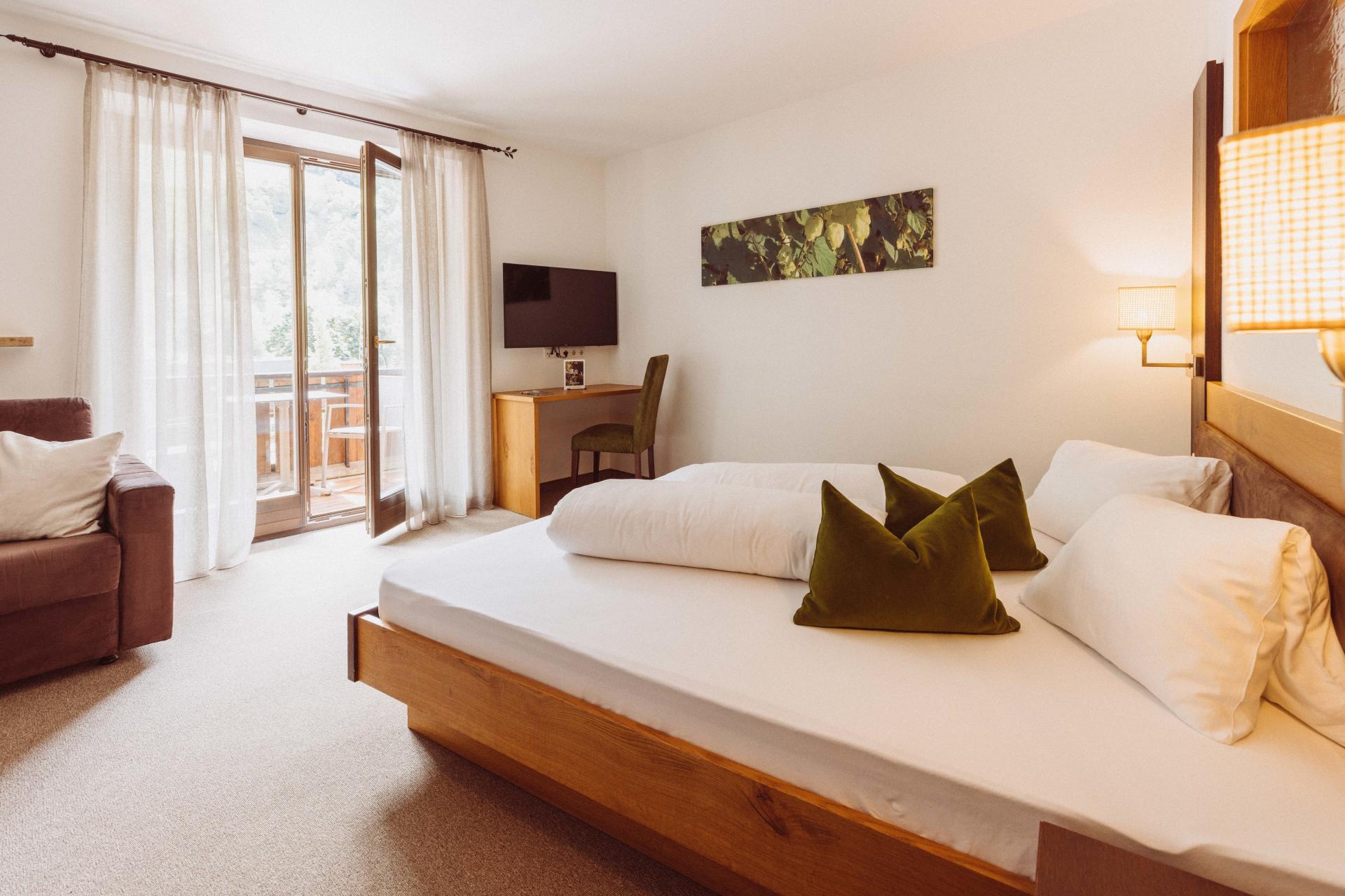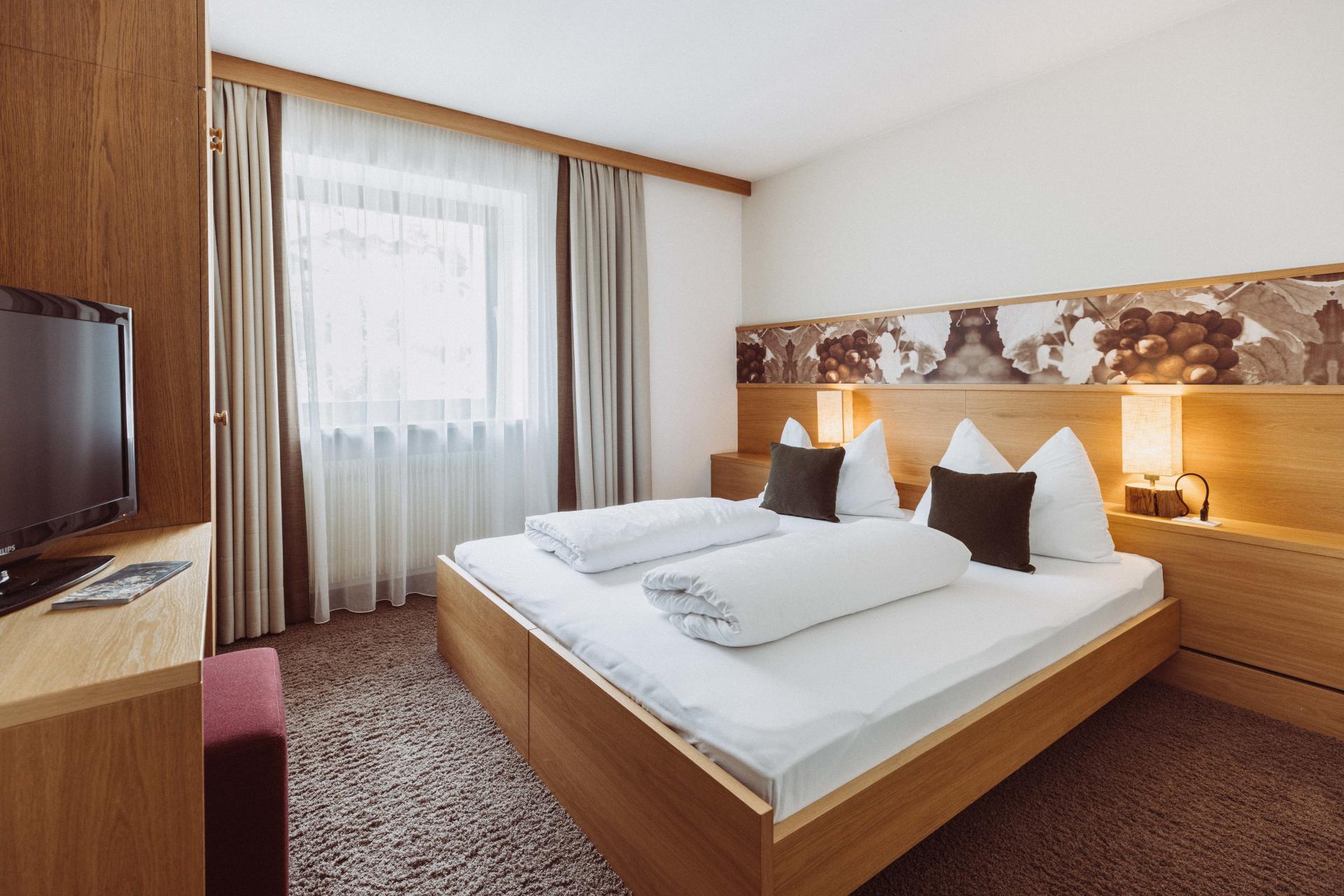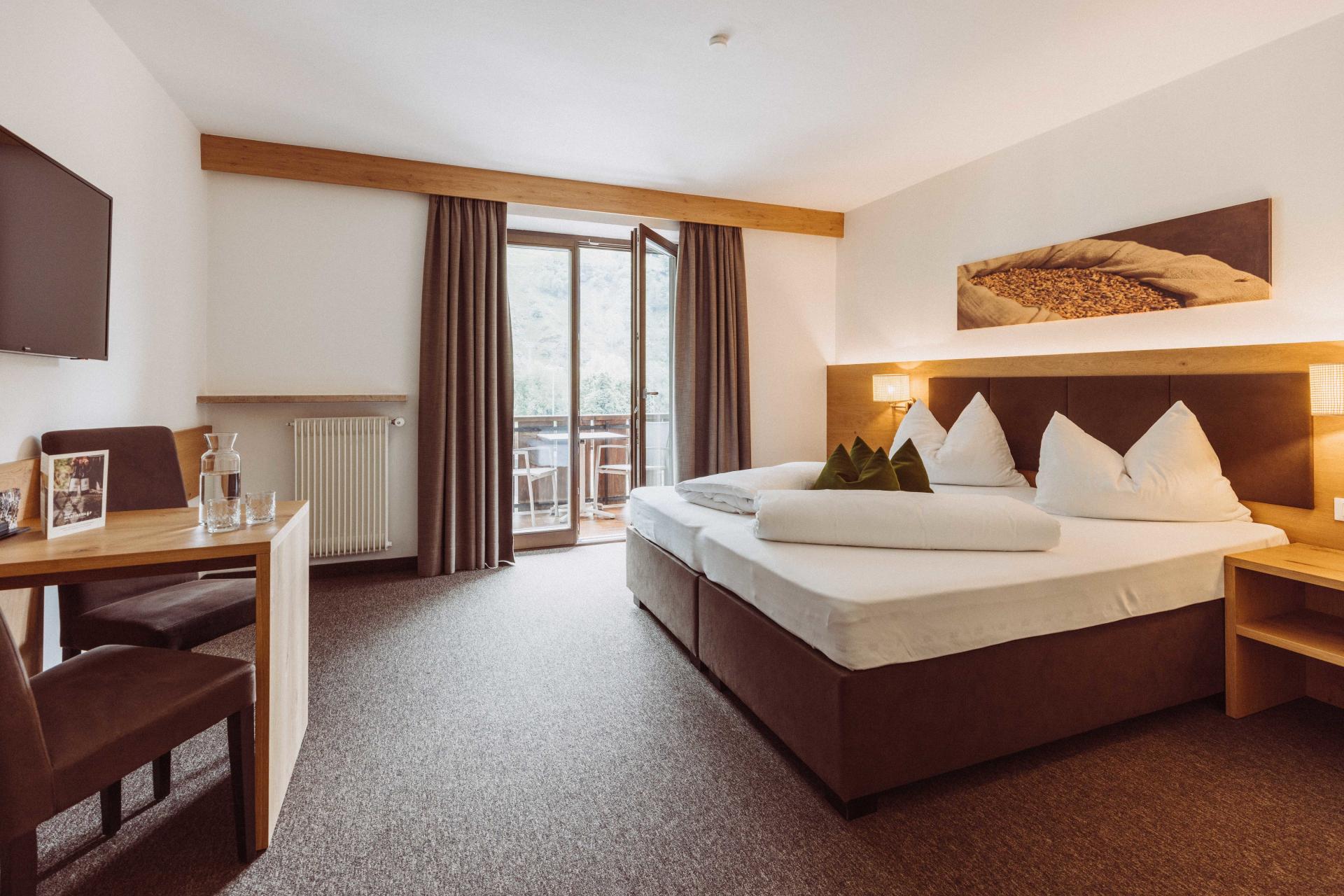 Im „Krügerl“ lässt sich’s aushalten! Hier kommen Dachgeschossfans auf ihre Kosten. Das Doppelzimmer verzaubert durch seine rustikalen Schrägen und einem Weitblick über St. Martin und das gesamte Tal.