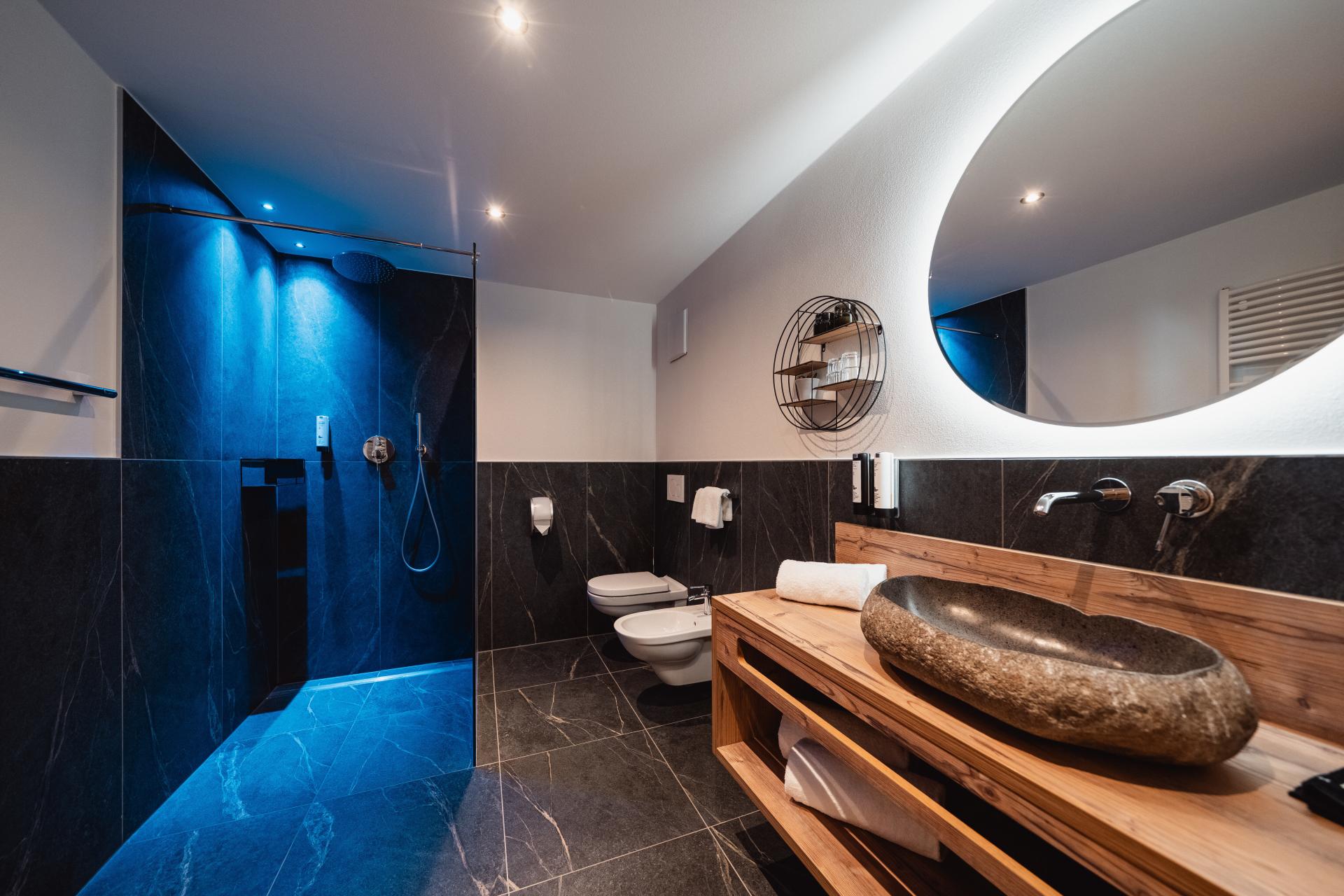 Ampio bagno con doccia, WC e bidet, asciugacapelli, morbidi accappatoi, borsa da bagno con teli da bagno