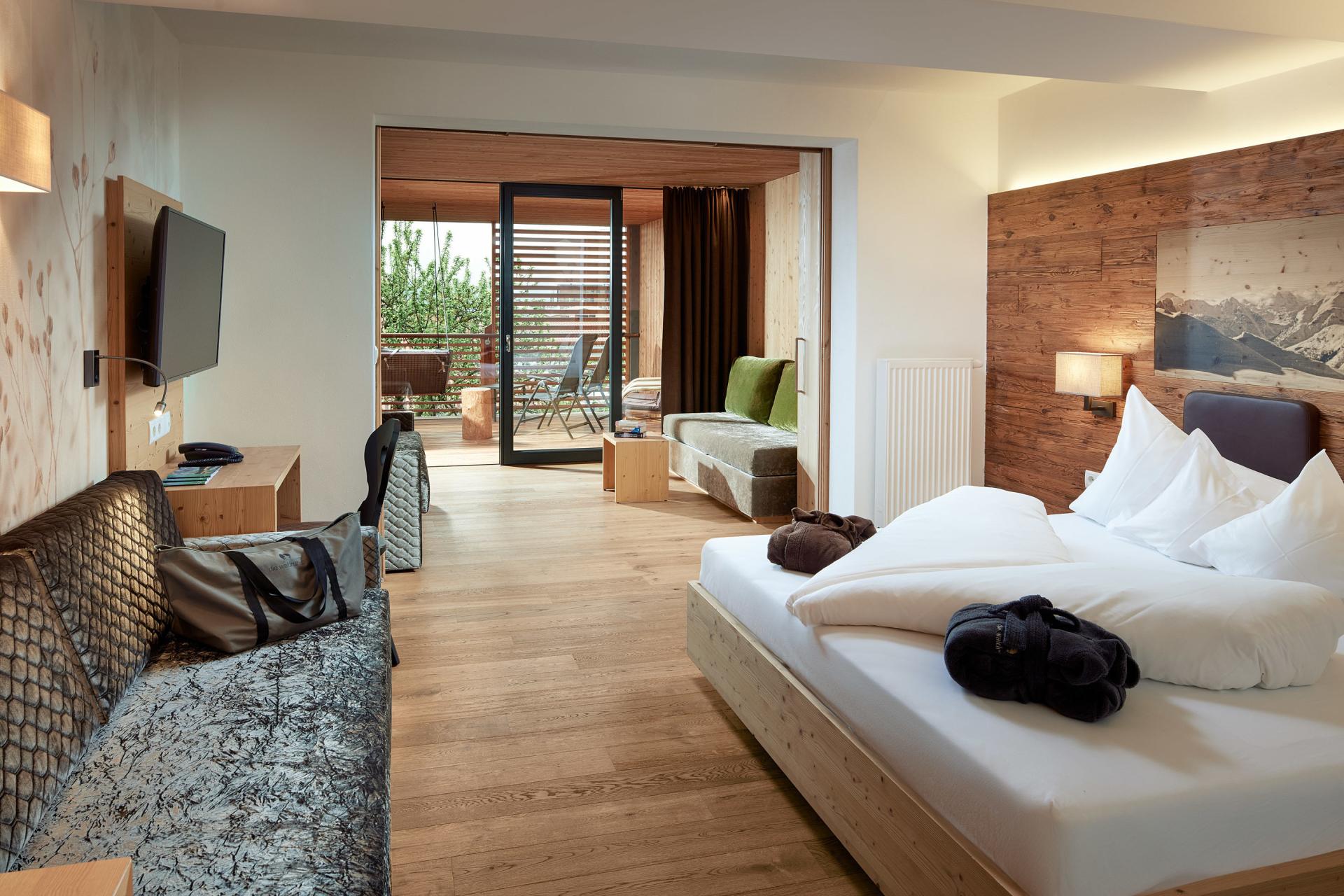Neues Wohlfühlzimmer in massivem Naturholz mit separatem Wohnbereich bzw. Kinderzimmer mit Stockbett (1,90 mt). Die Suite ist in warmen Naturfarben gehalten und verfügt über eine komfortable Ausstattung: Sofa, große Terrasse mit Waldblick, 42" Flat-TV mit über 70 Kanälen inklusive Radio, WLAN, Kühlbox, Tresor für Ihre Wertsachen. Außerdem dürfen Sie sich auf ein schönes, großes Badezimmer mit Badewanne und Duschvorrichtung, Föhn, Schminkspiegel, Badetasche mit Badetuch, Badeschlappen und kuscheligem Bademantel freuen. Das außergewöhnliche Die-Waldruhe-Design schafft eine unverwechselbare Atmosphäre in der Juniorsuite.