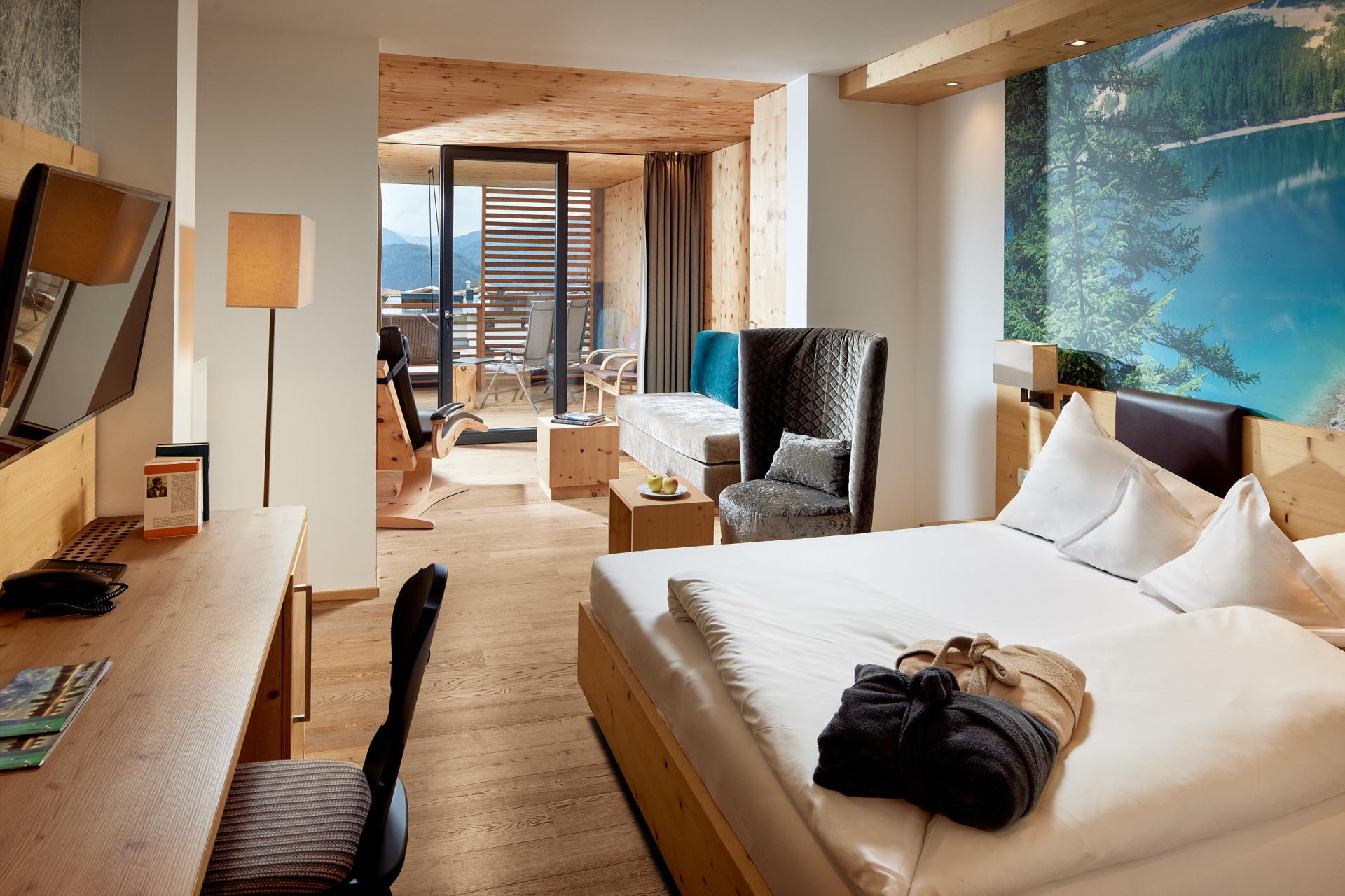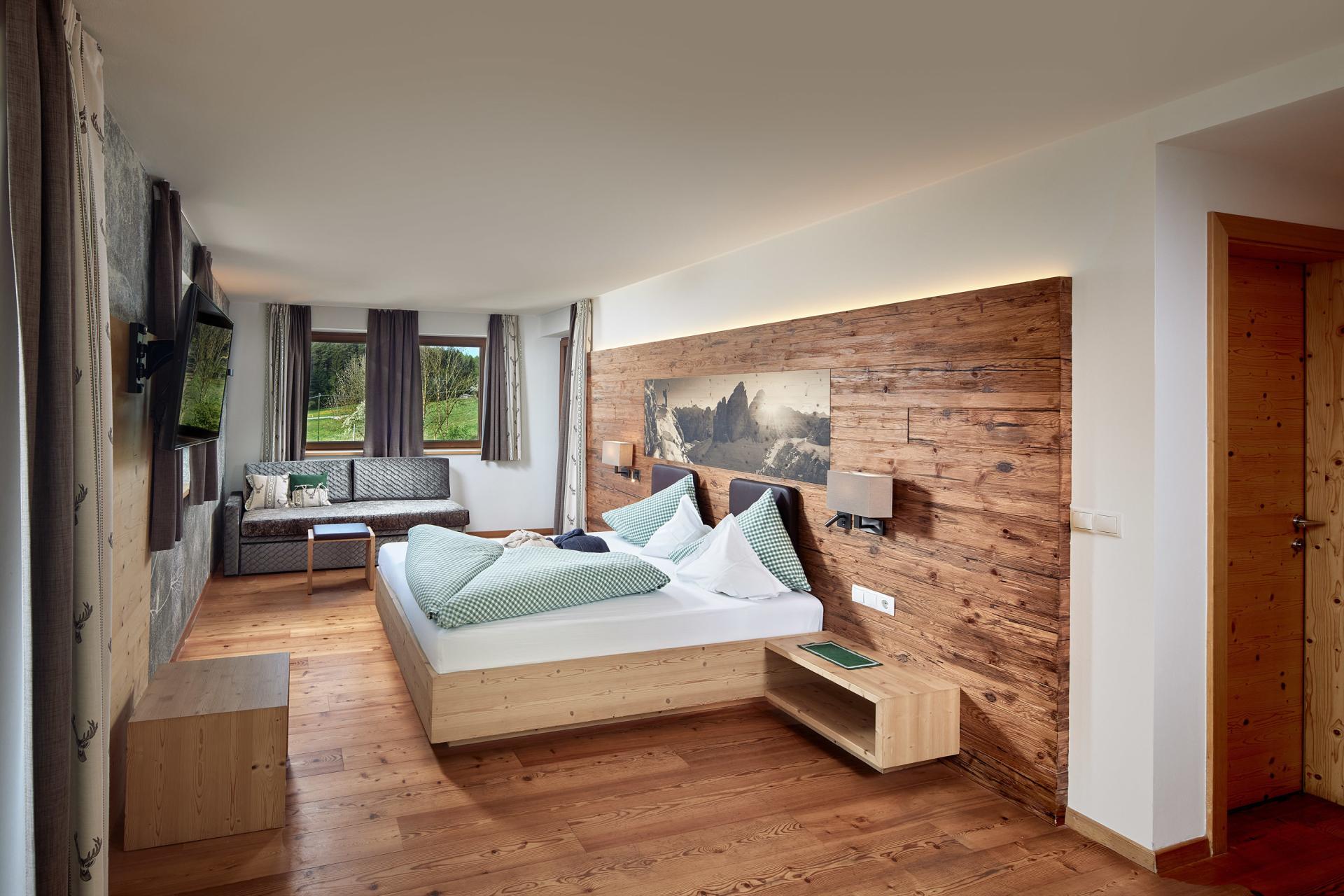 Wohlfühlzimmer in massivem Naturholz mit einzigartigem Blick auf die Dolomiten und das Pustertal. Das Zimmer ist in warmen Naturfarben gehalten und verfügt über eine komfortable Ausstattung: Sofa, Balkon aus Zirbelkiefernholz, 42" Flat-TV mit über 70 Kanälen inklusive Radio, WLAN, Kühlbox, Tresor für Ihre Wertsachen. Außerdem dürfen Sie sich auf ein schönes, großes Badezimmer mit Dusche, Föhn, Schminkspiegel, Badetasche mit Badetuch, Badeschlappen und kuscheligem Bademantel freuen. Das außergewöhnliche Die-Waldruhe-Design schafft eine unverwechselbare Atmosphäre im Zimmer Dolomiten de luxe.