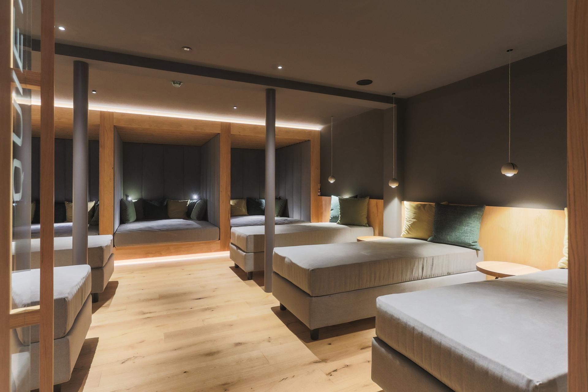 Dopo una camminata tra i meleti in fiore in primavera o tra le foglie dorate in autunno, potete rilassarvi nell’area spa e piscina con vista sui frutteti. Il calore delle saune e l’acqua della piscina vi permetteranno di concludere al meglio la vostra giornata a Naz-Sciaves.