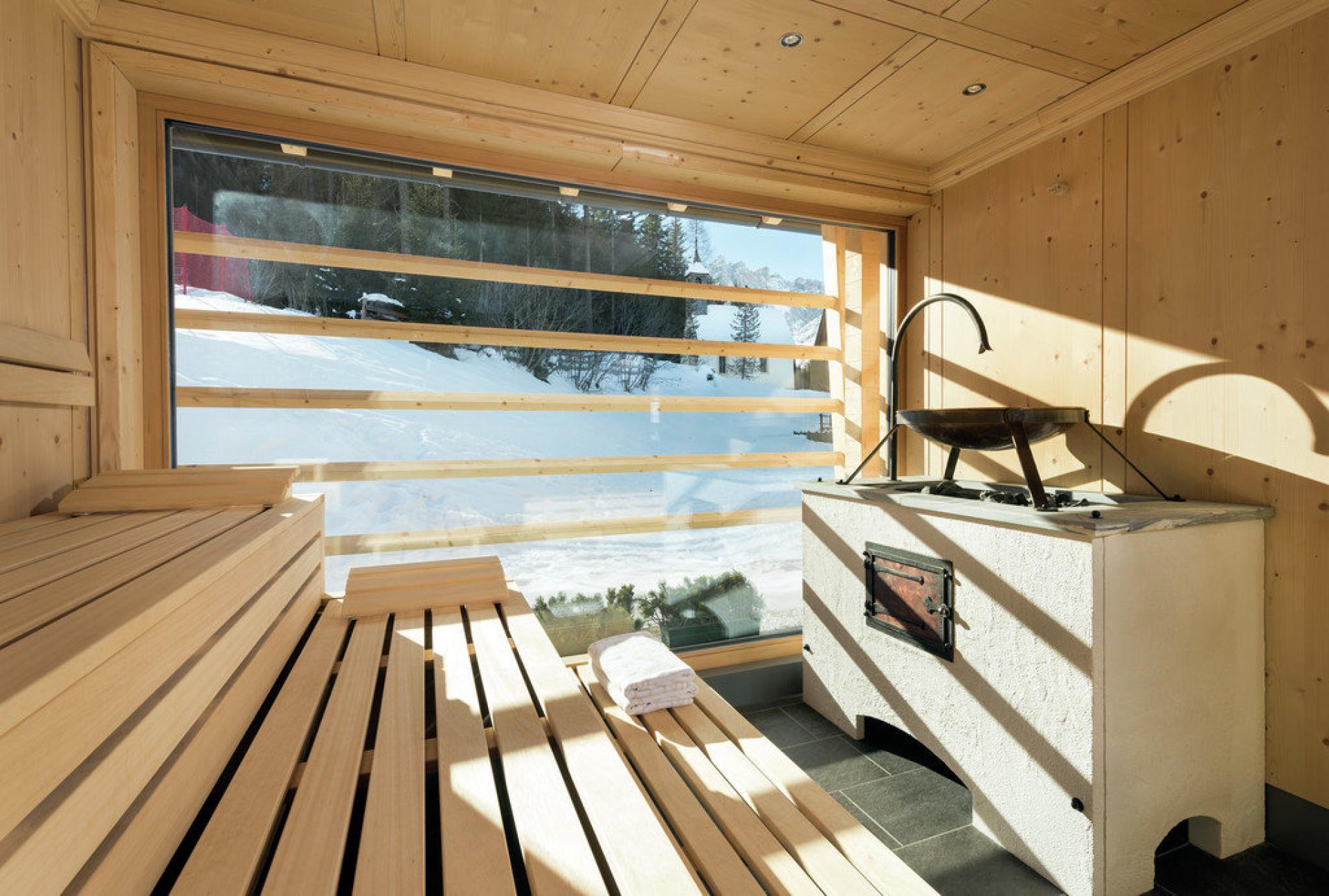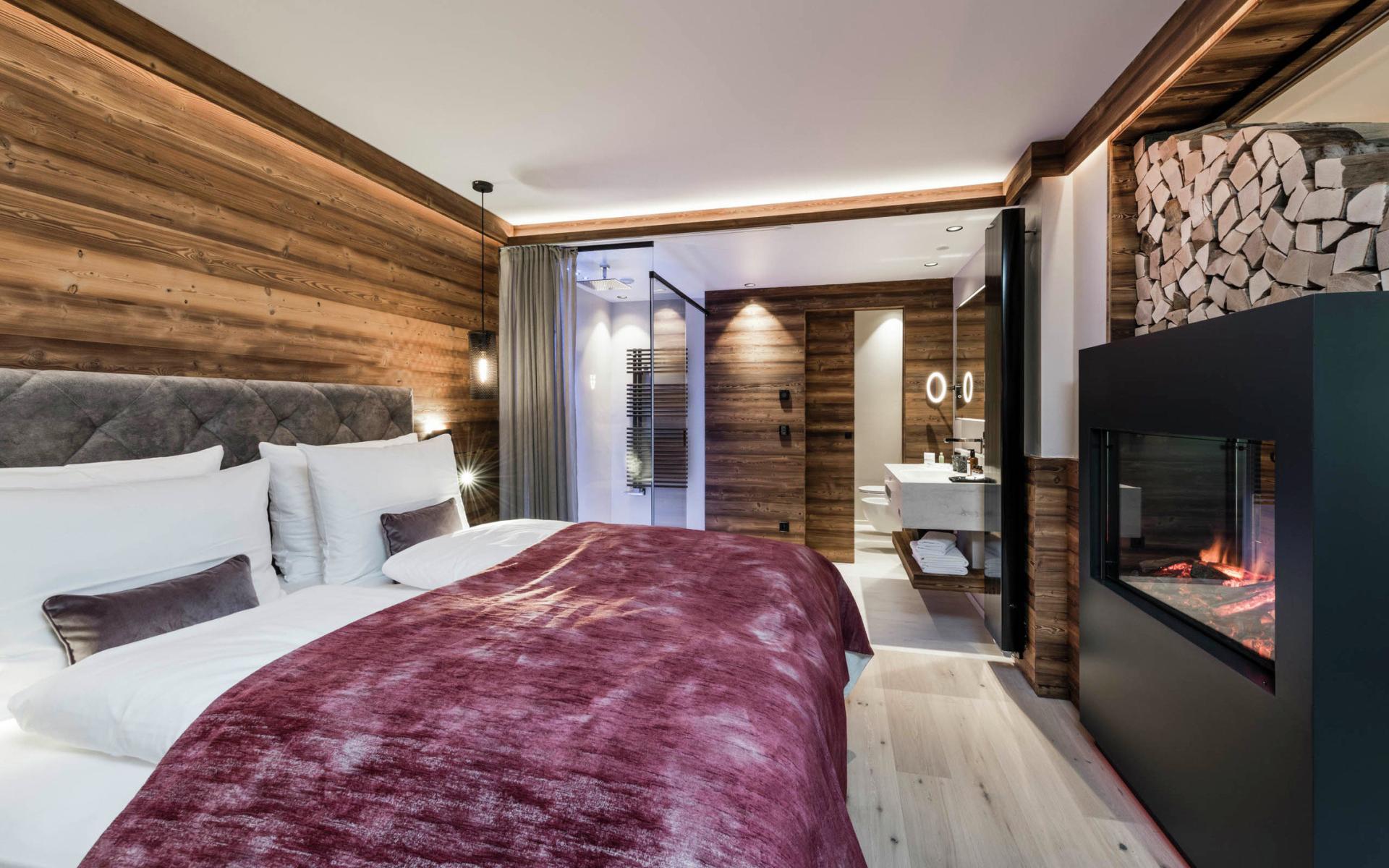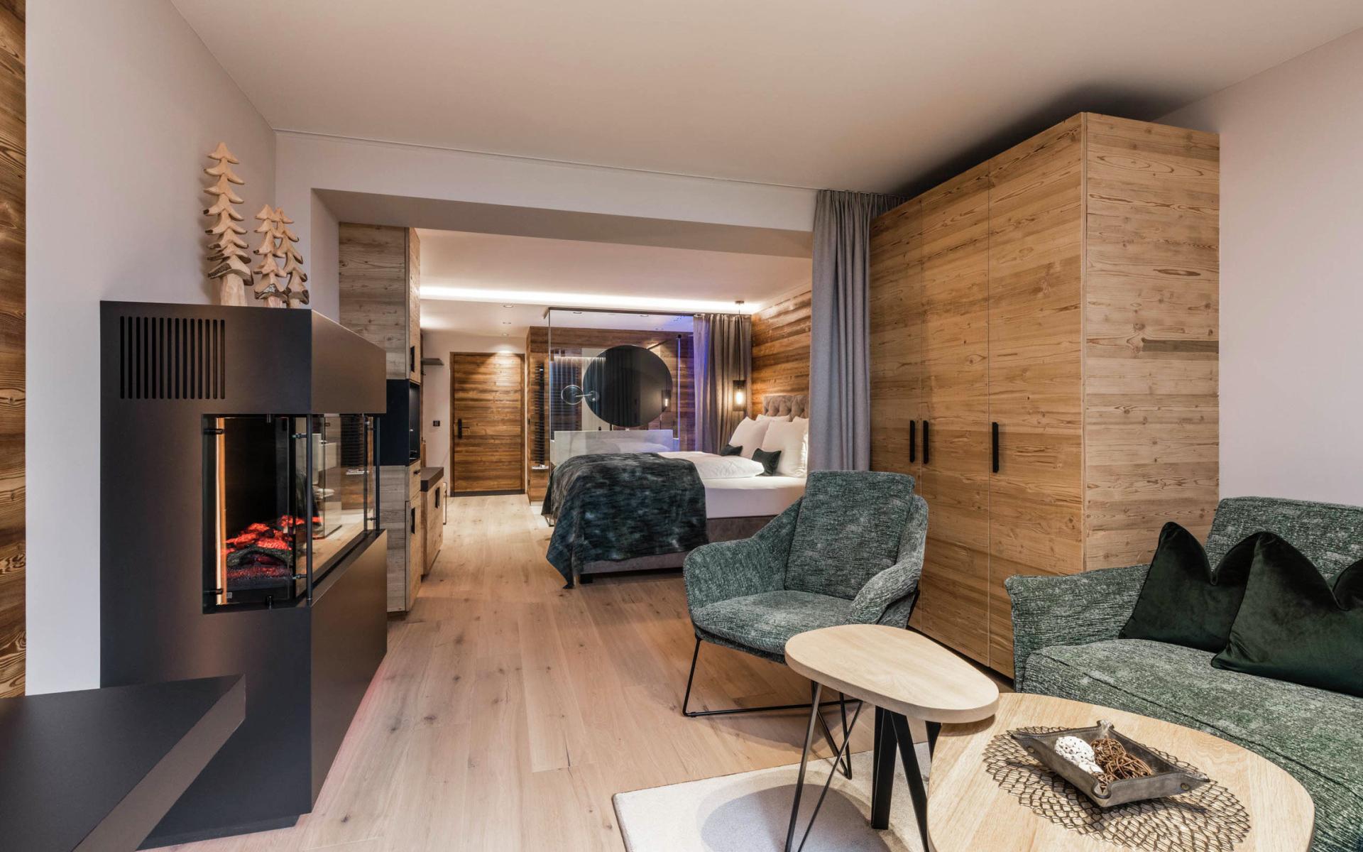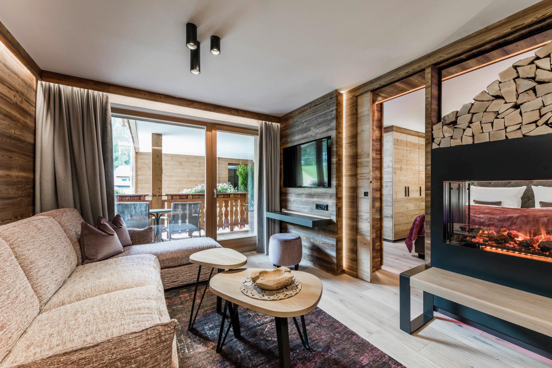 La BAD MOOS SPA SUITE con private SPA e caminetto "The Flame", spaziosa, con profumato legno di larice e balcone, è ideale per la famiglia.