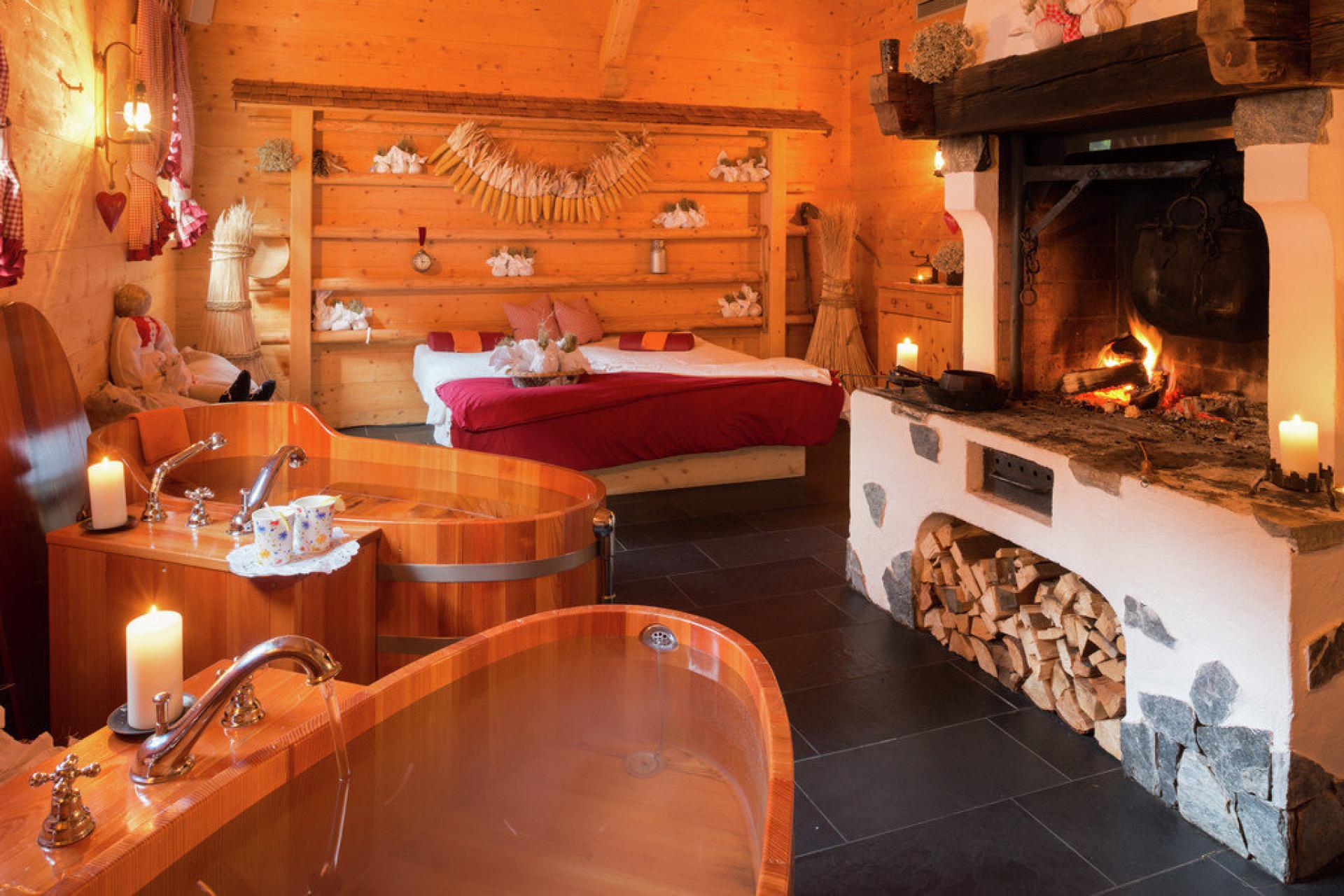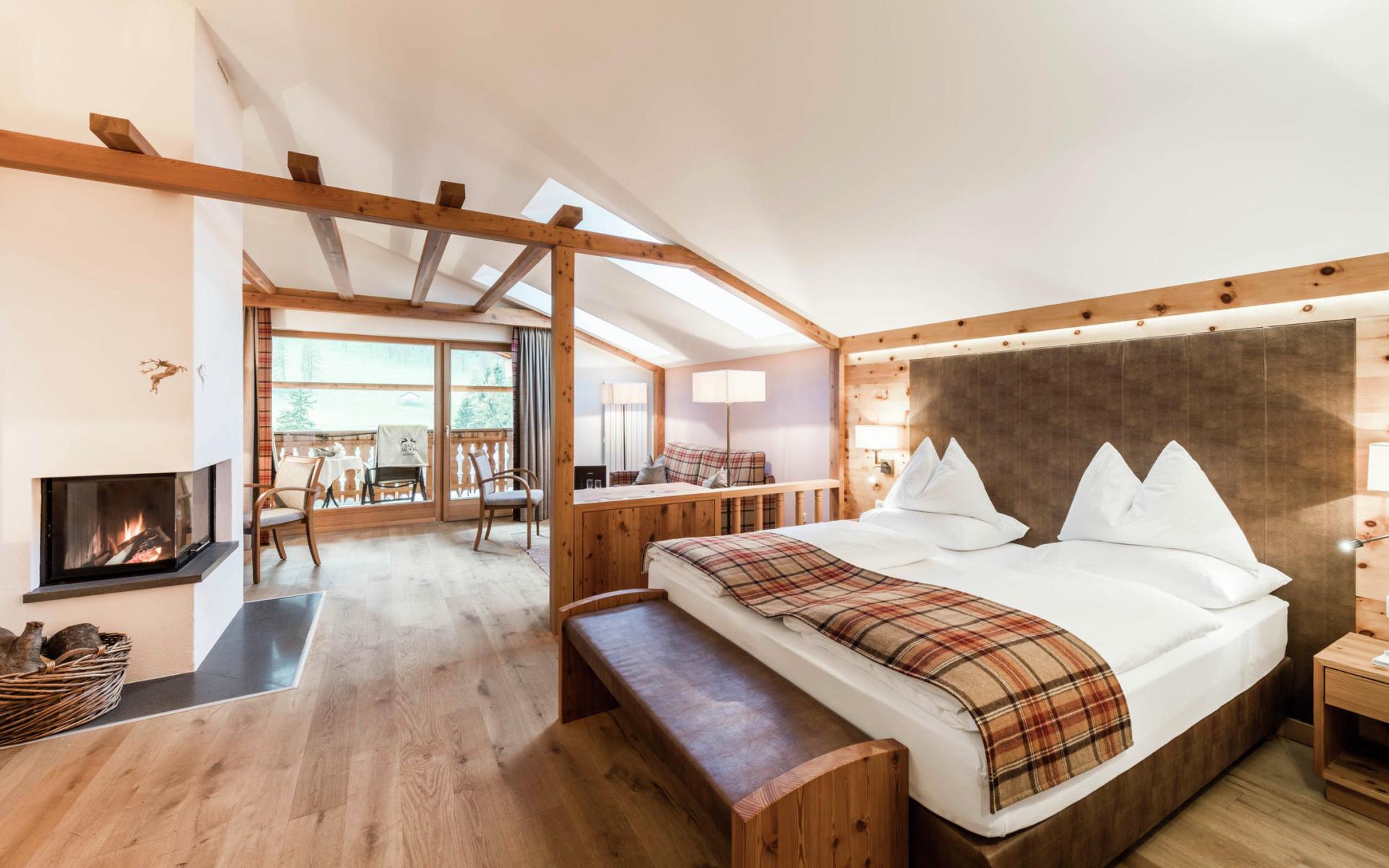 Le esclusive Suite Mansardate in stile alpino con un’accogliente zona giorno completa di caminetto, per trascorrere momenti romantici in due.