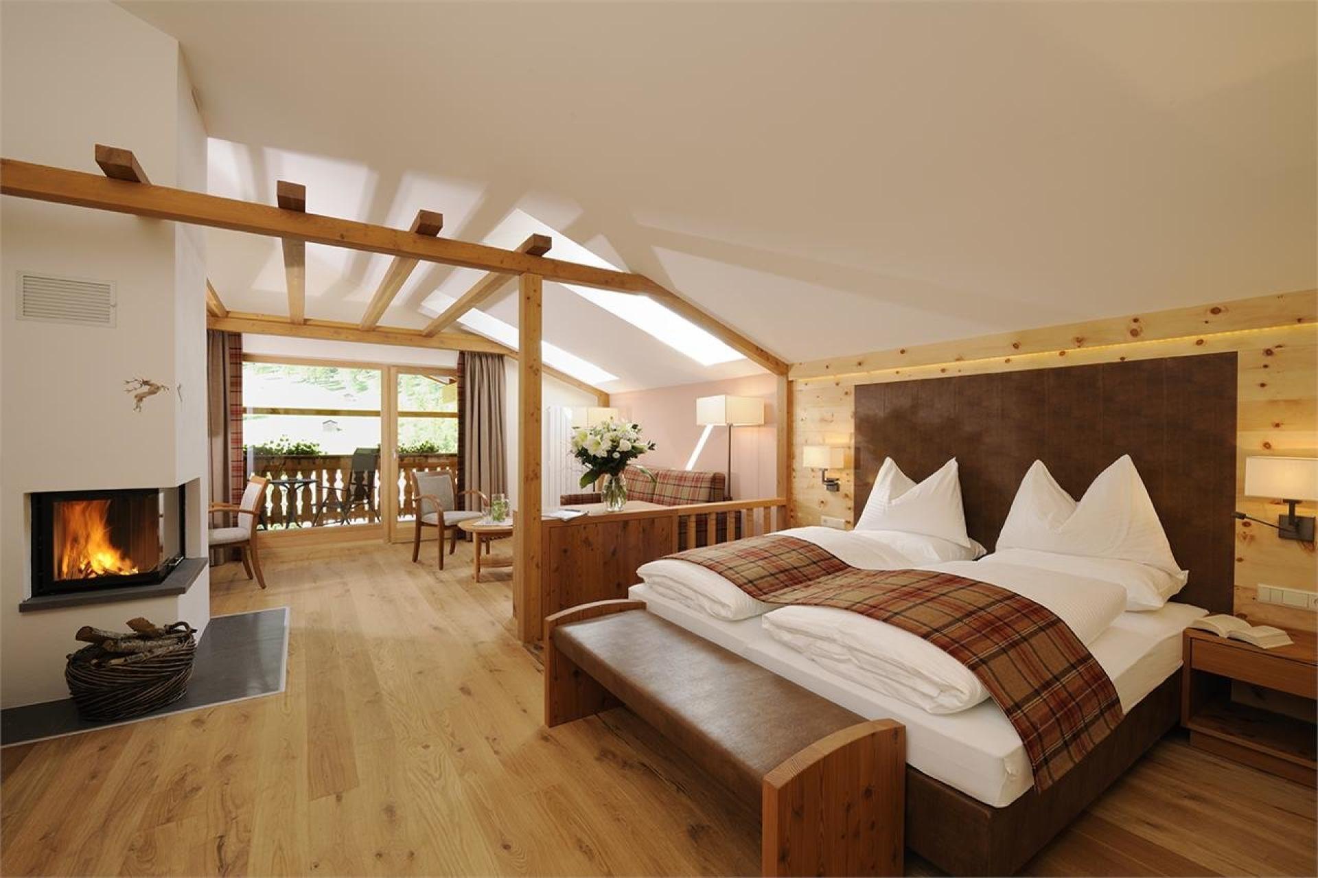 Le Junior-Suite da 2 a 4 persone alcune con letto a baldacchino e divanoletto, stufa rustica o caminetto per un‘atmosfera calda e accogliente da vivere!