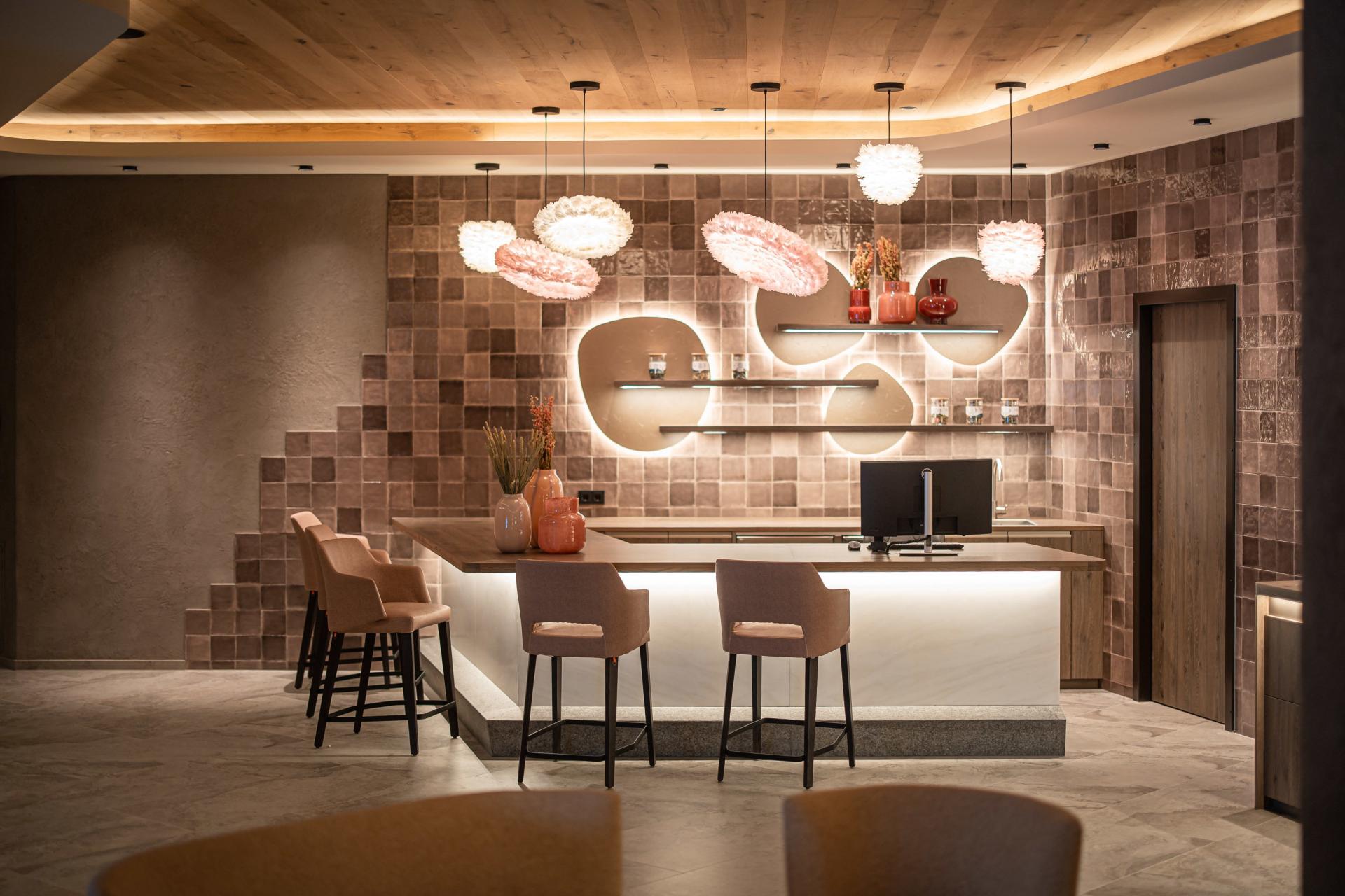 Il paradiso personale della spa - inondato di luce ed elegantemente arredato, con la propria vasca idromassaggio sulla terrazza, naturalmente con vista sul Lago di Resia.