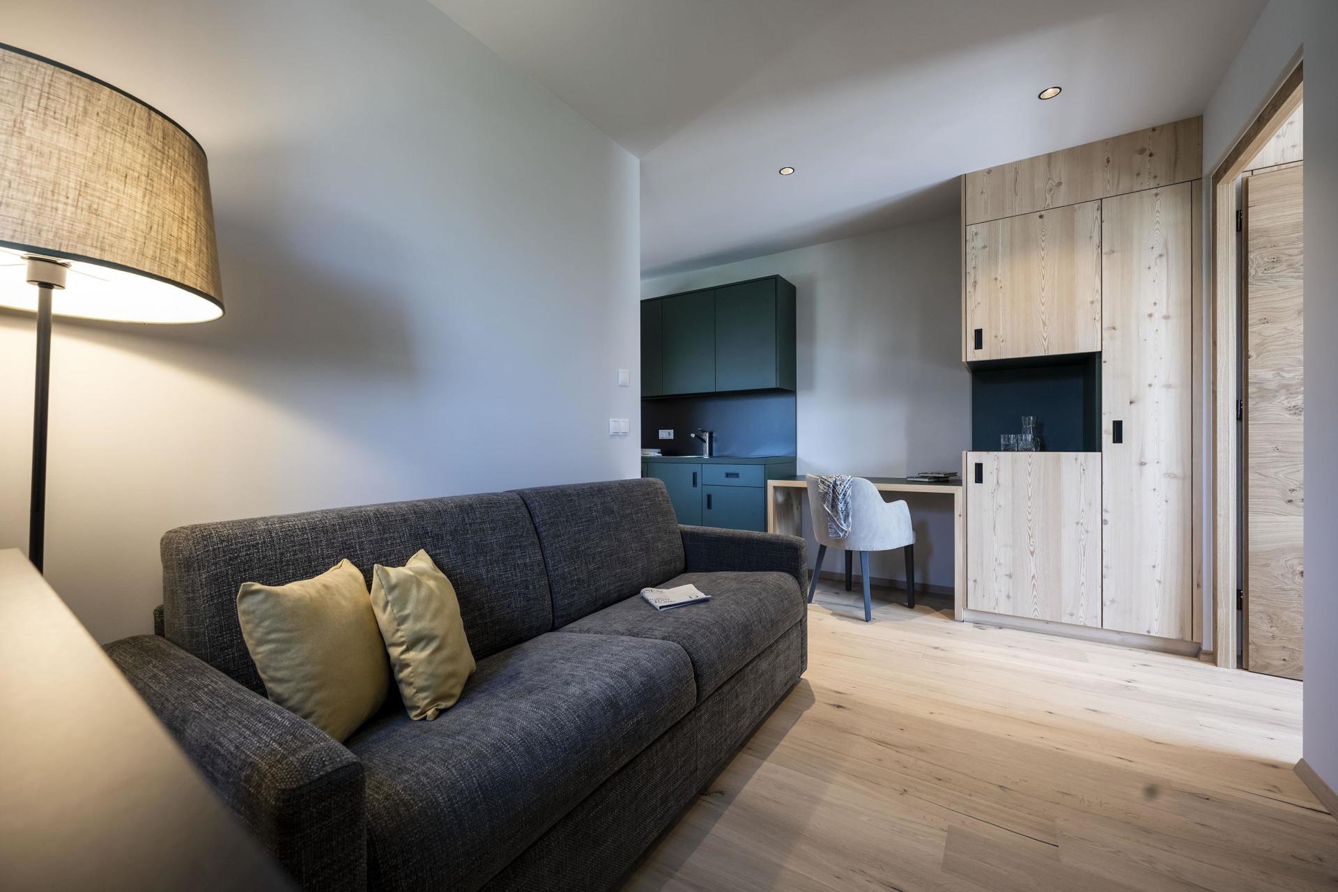 Ampi spazi per grandi e piccoli e tanto comfort: angolo cottura, macchina da caffè espresso, divano letto doppio estraibile con materasso nel soggiorno, scrivania, due Smart-TV, pavimento in legno di rovere e balcone in cui godersi dei piacevoli momenti in compagnia. Dotata di una camera doppia separata per i genitori per rilassarsi in pace.