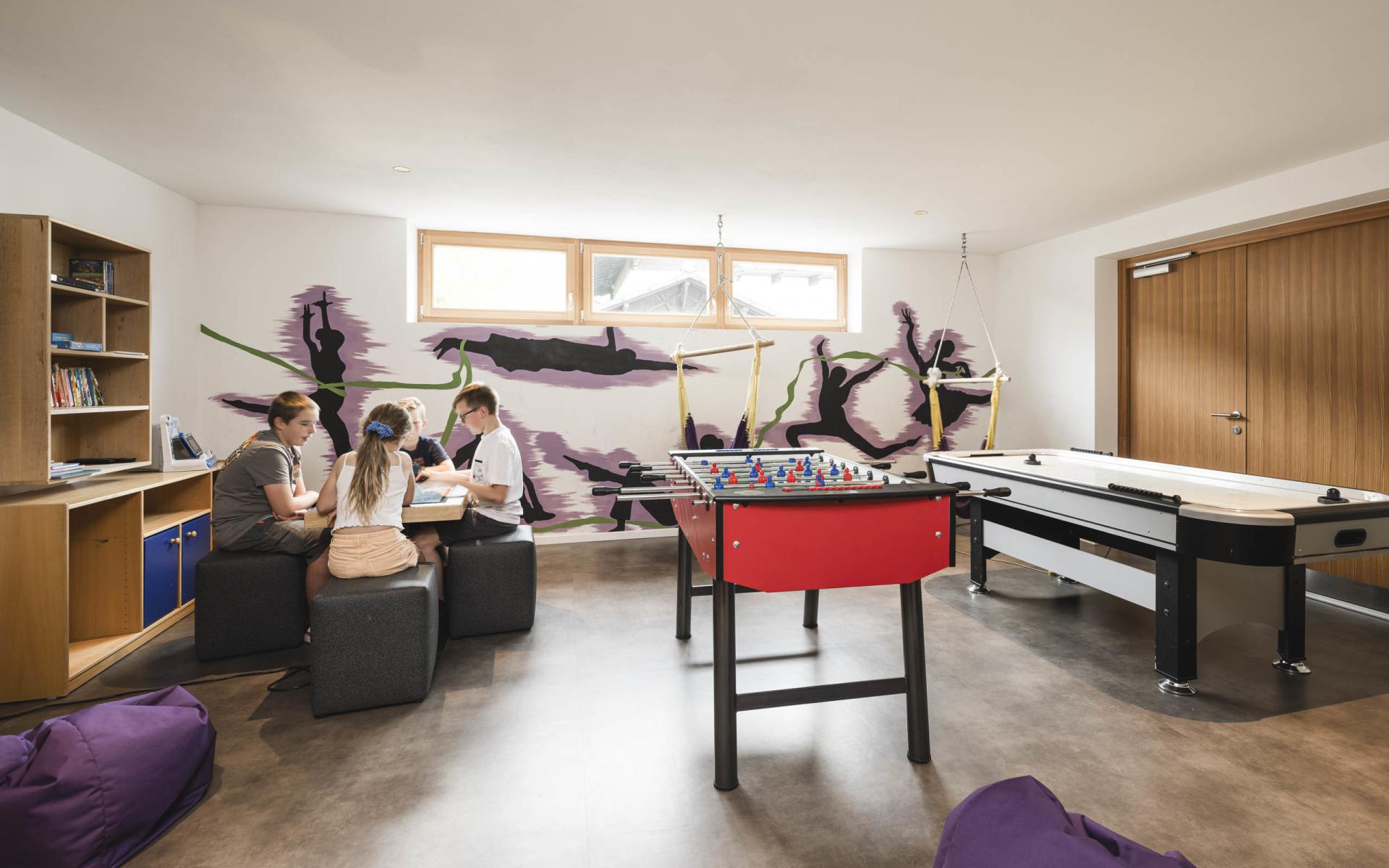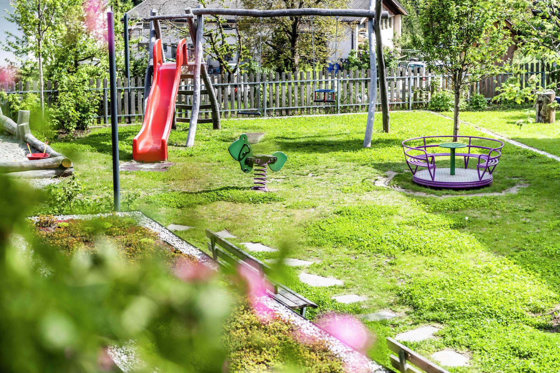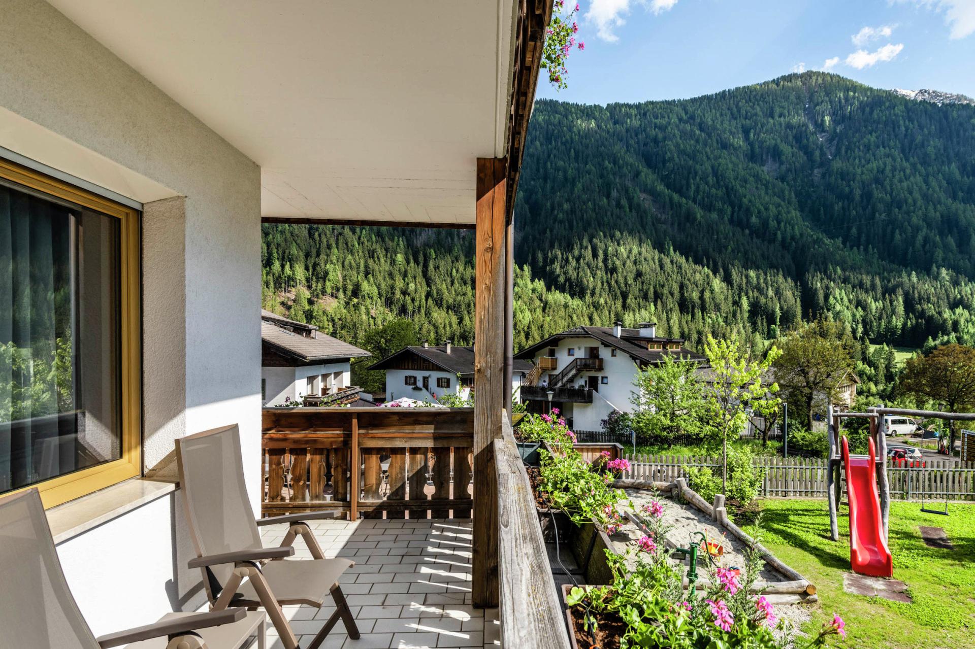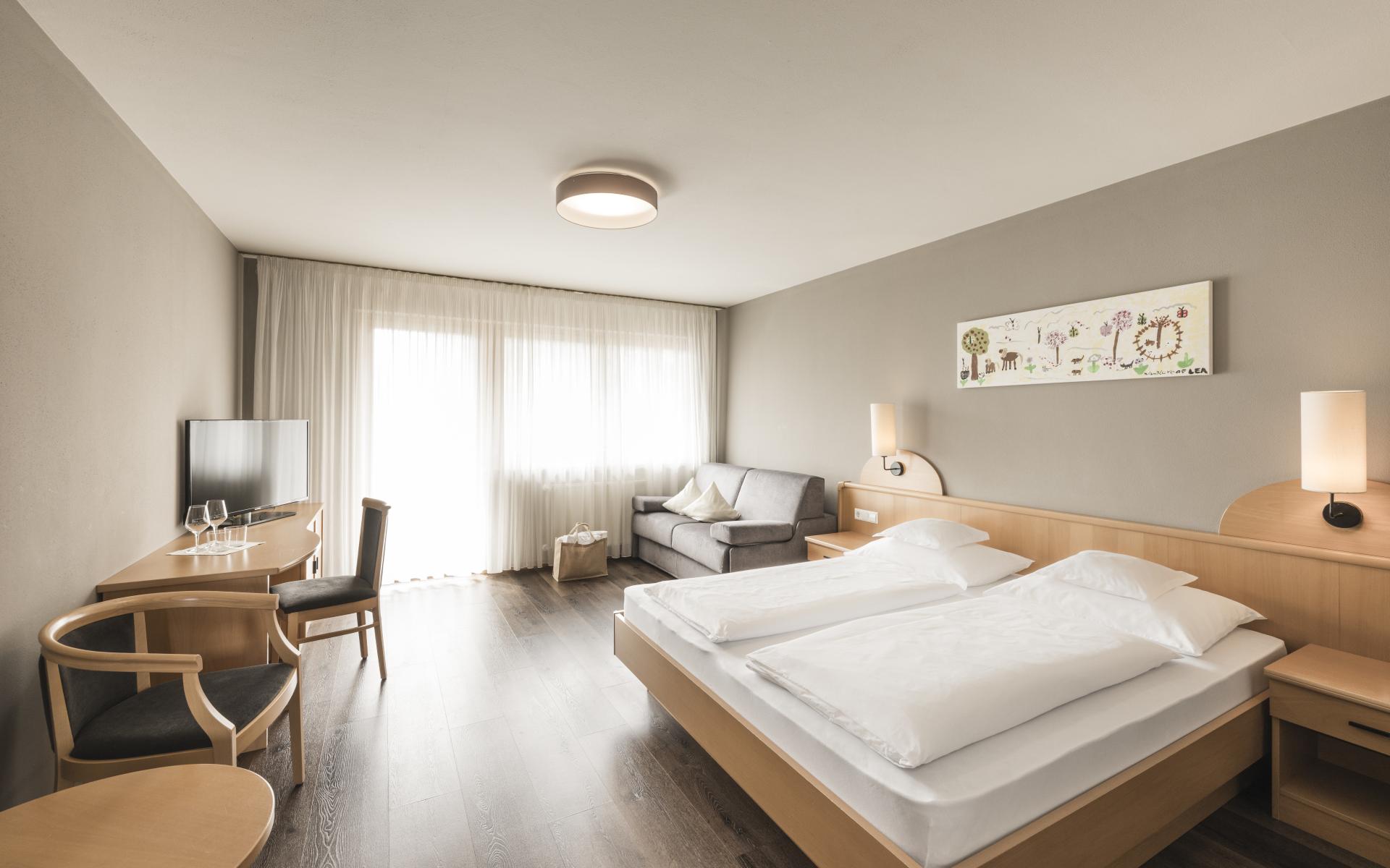 Stanza soleggiata affacciata sul giardino, che promette relax e benessere, con vista dal balcone della valle e delle sue montagne. Camera di 40 mq, con letto matrimoniale. La zona notte dei bambini con comodo divano letto per 2 persone è separata dalla camera dei genitori da una porta scorrevole. Doccia, asciugacapelli, bidet, TV, telefono, cassaforte, cabina armadio, balcone, animali domestici su richiesta.