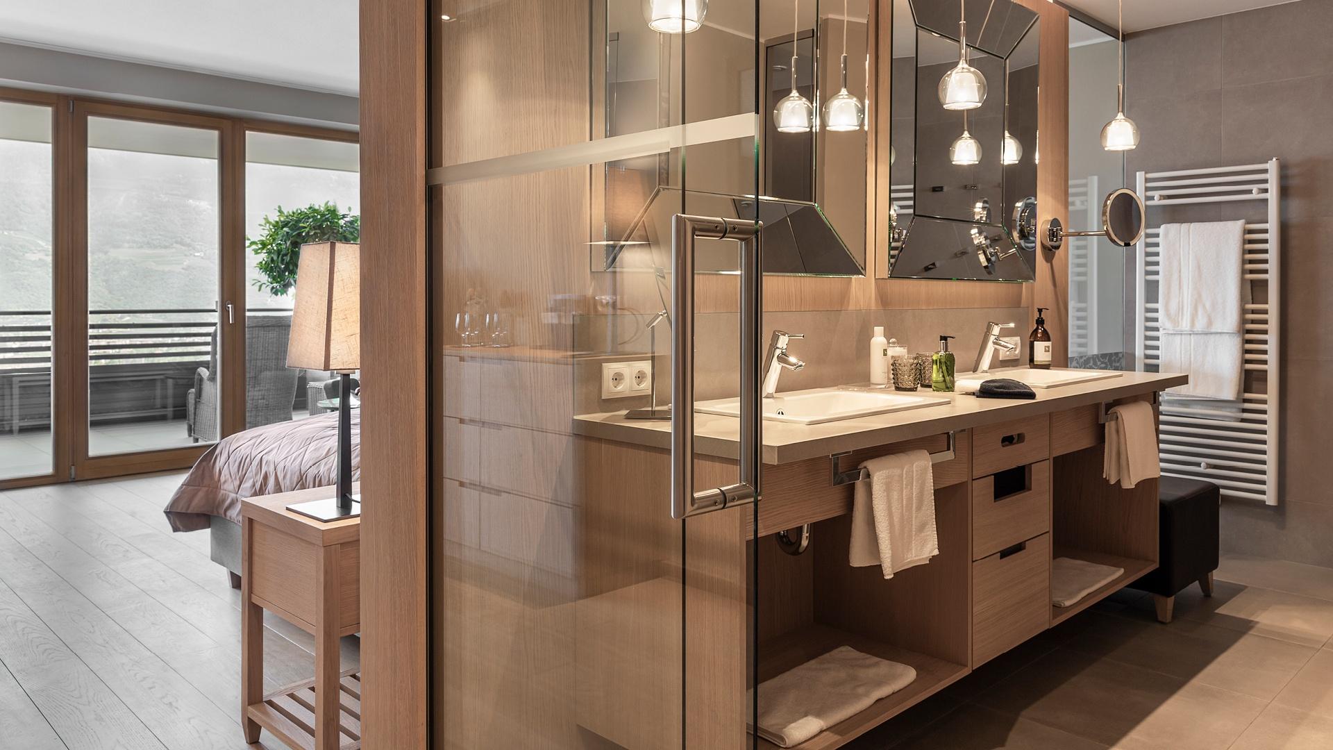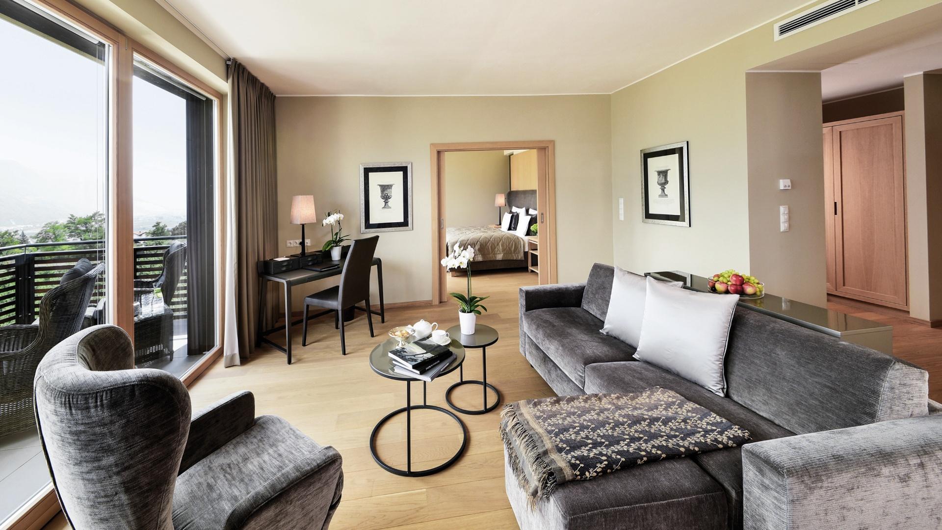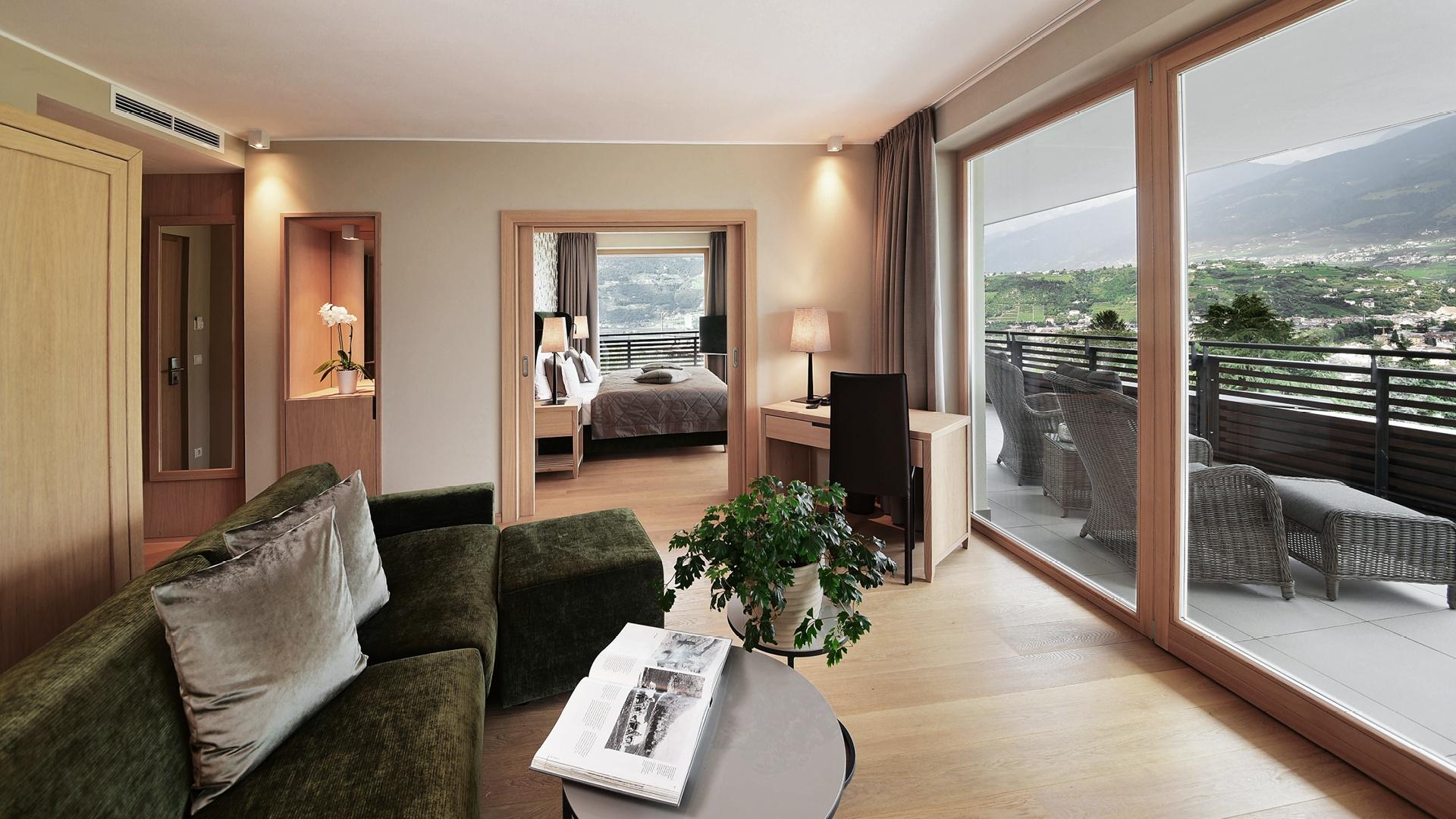 Suite con salottino e stanza da letto separati, grande balcone angolare con vista su Merano e Tirolo, doccia, WC indipendente, parquet, due TV satellitari, Internet wireless, telefono, minibar, cassaforte e climatizzatore.