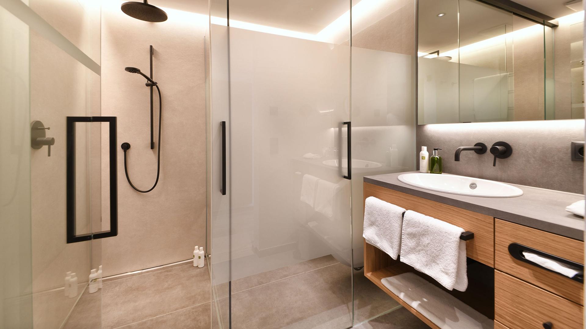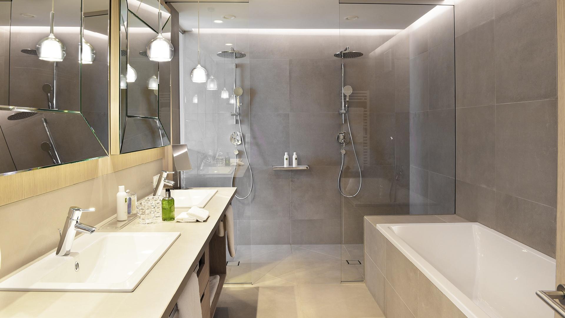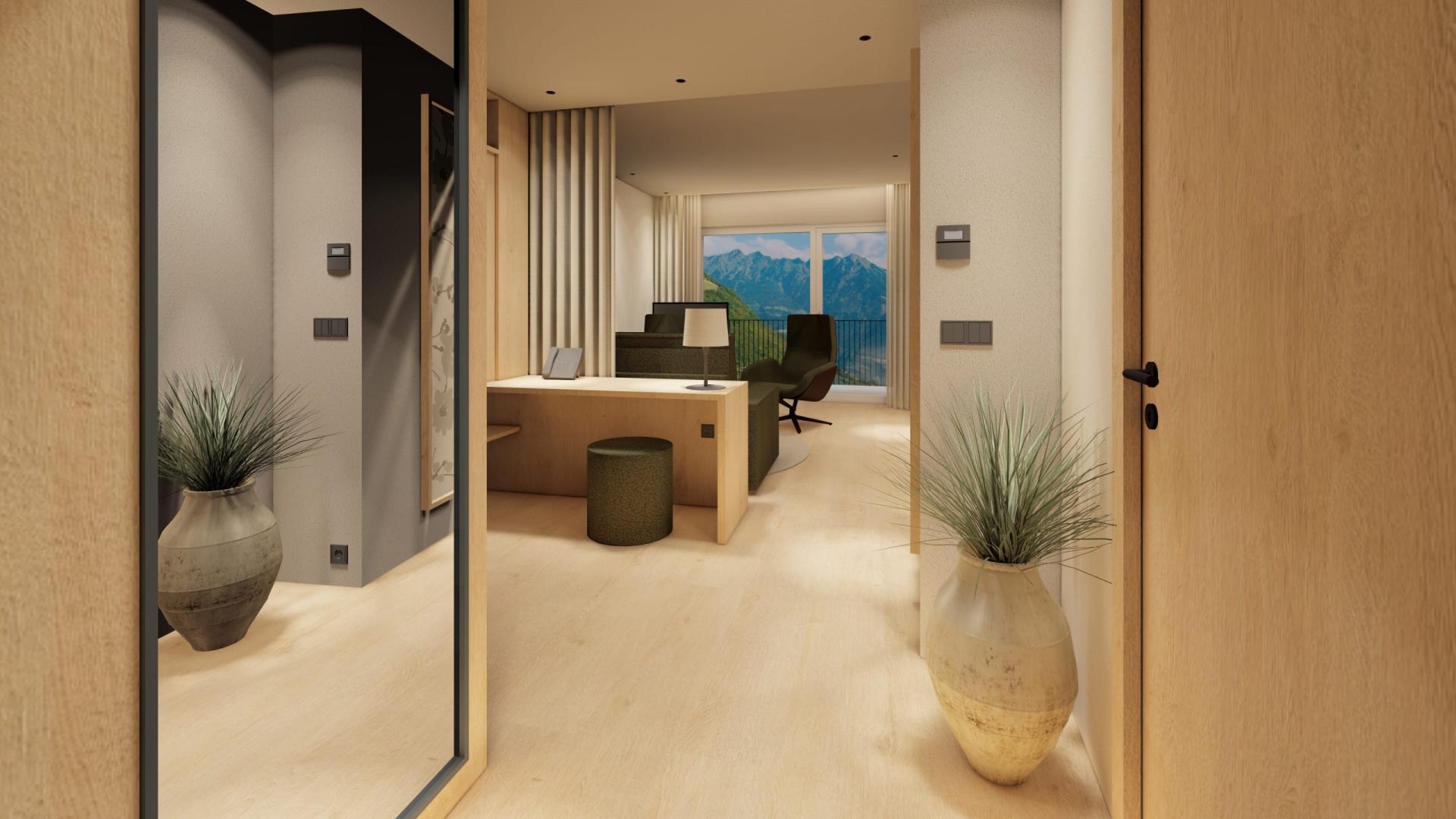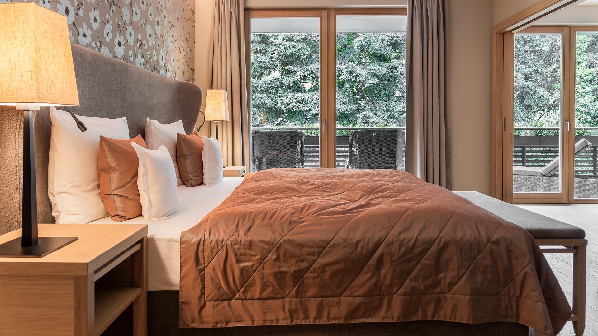 Suite con salottino e stanza da letto separati, grande balcone angolare con vista su Merano e Tirolo, doccia, WC indipendente, parquet, due TV satellitari, Internet wireless, telefono, minibar, cassaforte e climatizzatore.
