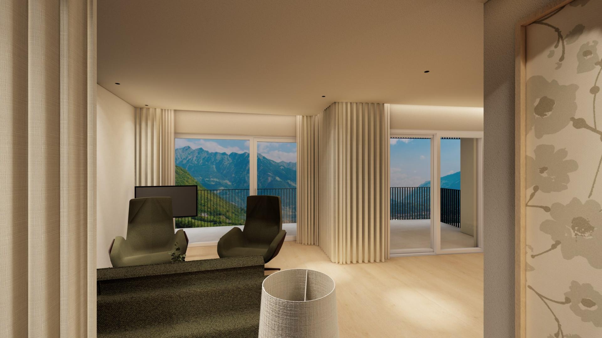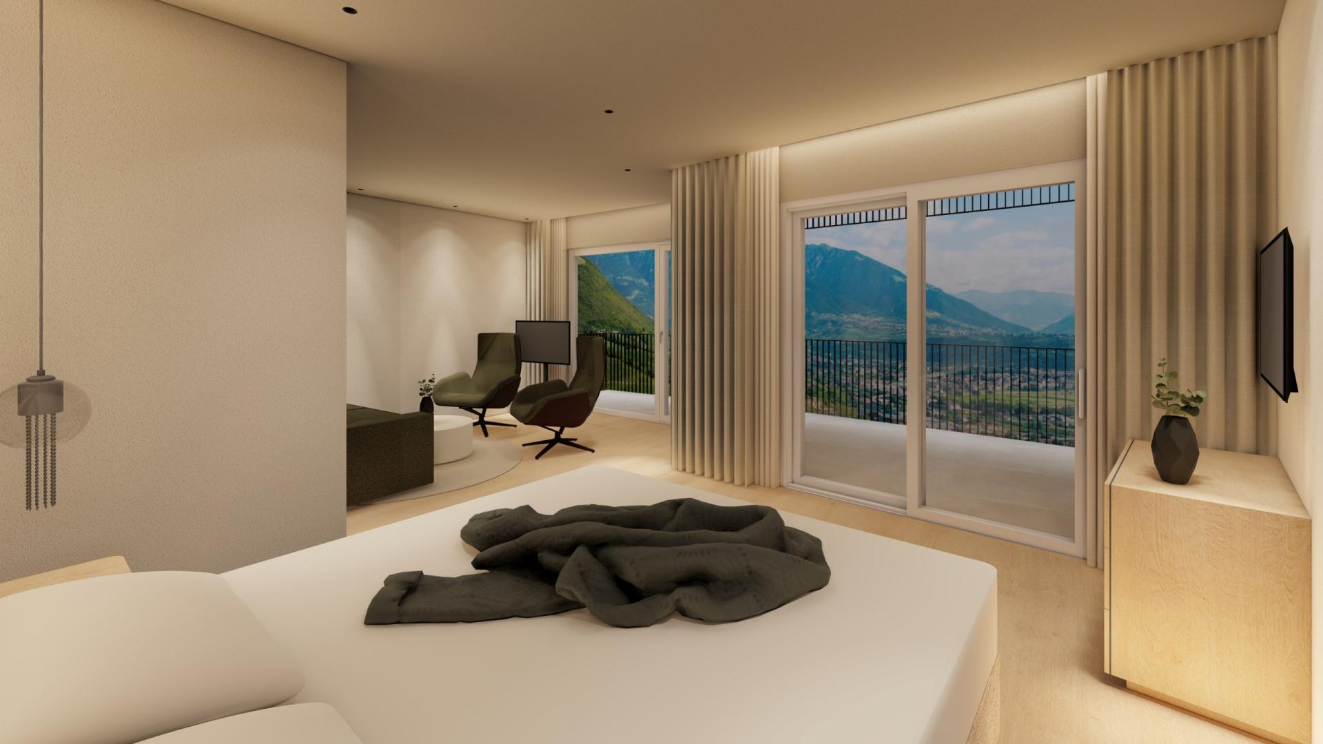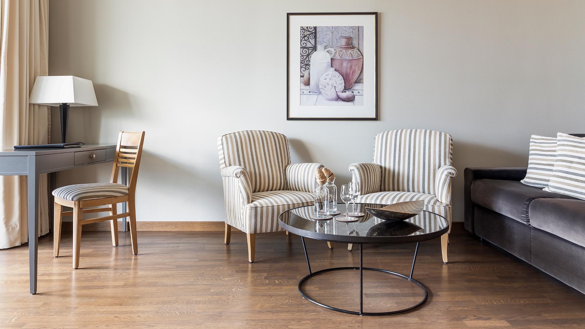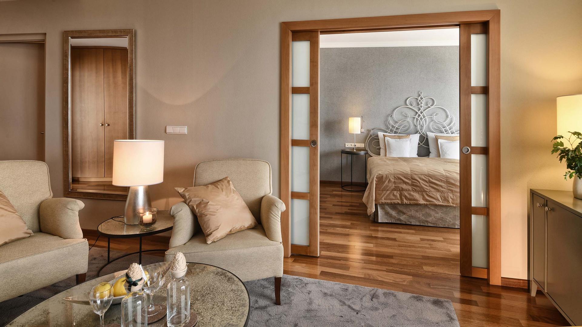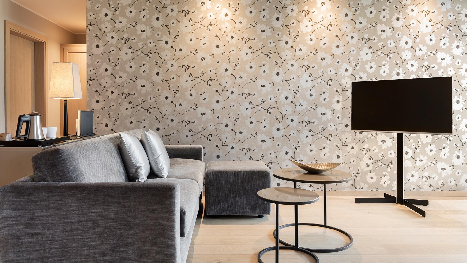 Suite con ampio soggiorno e camera da letto, grande balcone con vista su Merano, ampia doccia, WC separato, pavimento in legno, due TV satellitari, Wi-Fi, radio, telefono, minibar, angolo caffè e tè, cassaforte e aria condizionata.