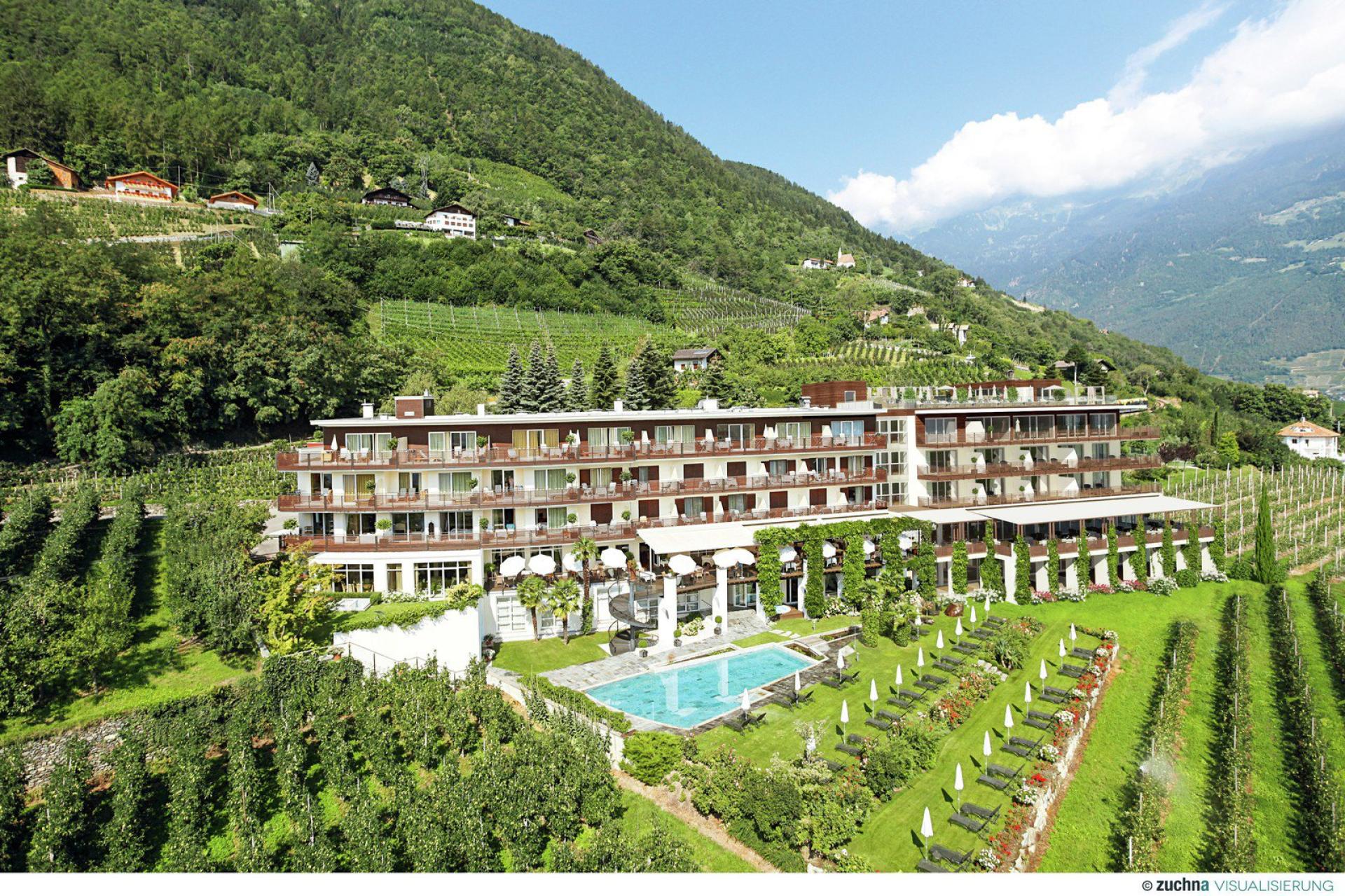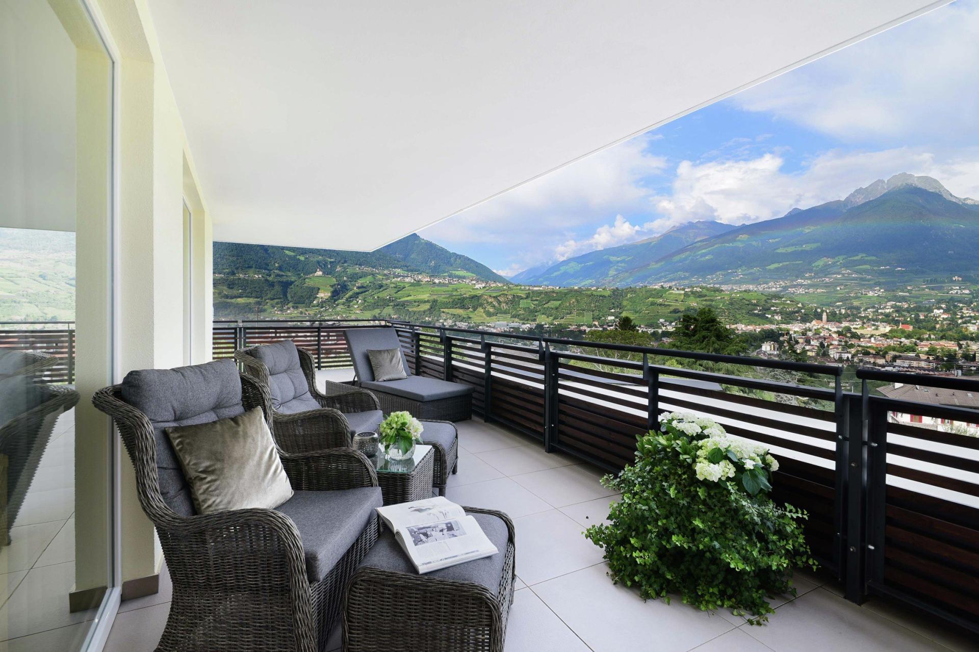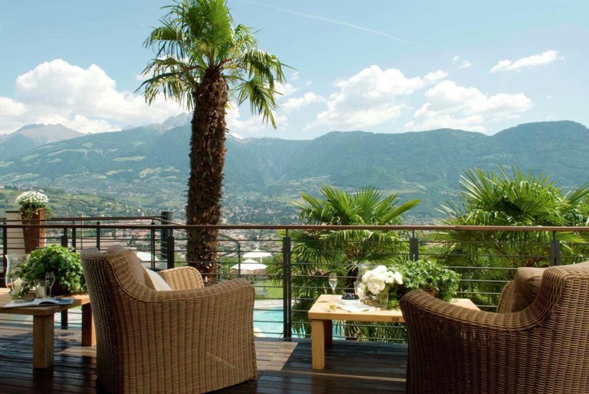 Circondato da meleti e vigneti, regala una vista panoramica unica sulla conca di Merano, in un luogo suggestivo dove la terra sembra toccare il cielo.