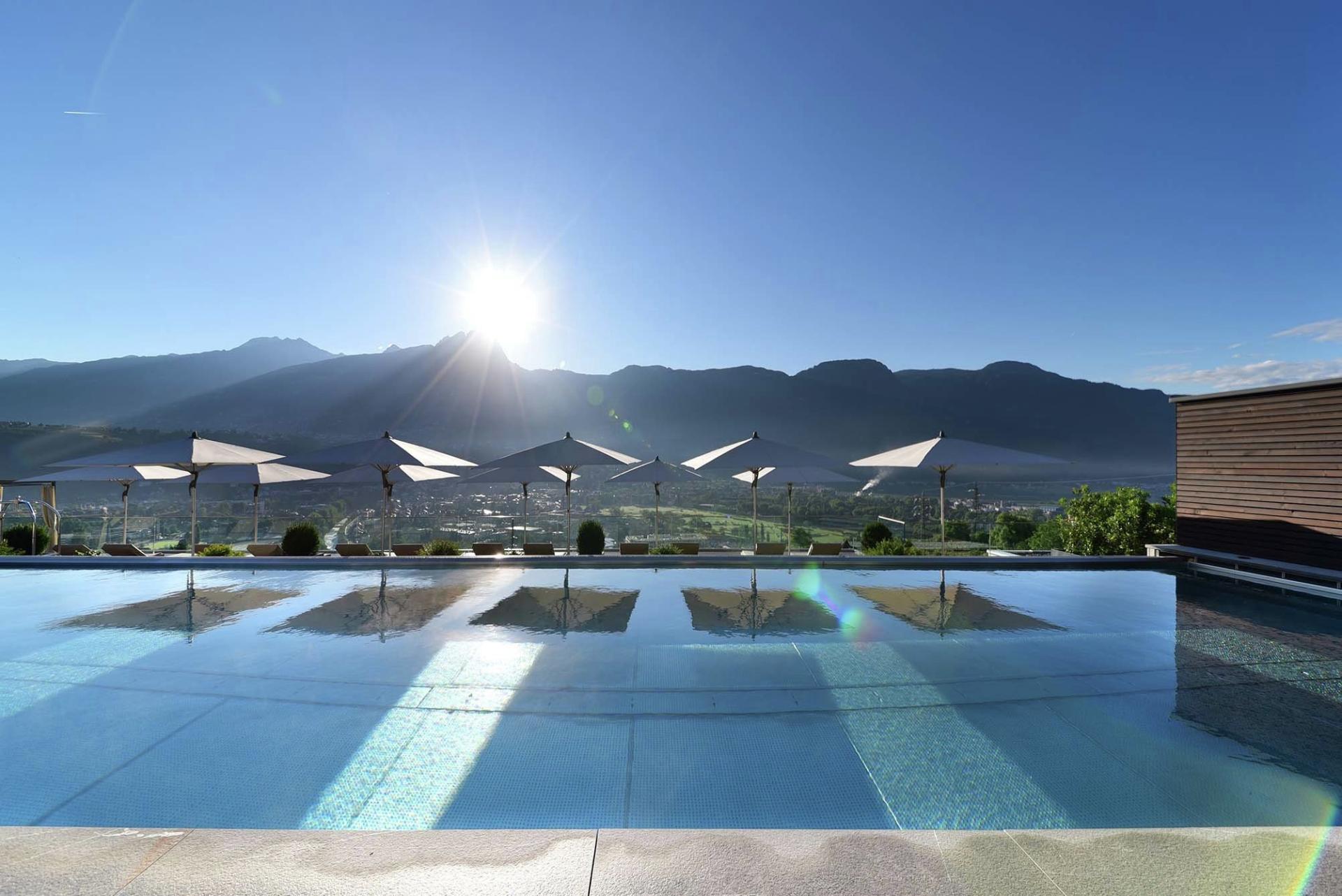 La moderna area wellness con sky pool riscaldata, idromassaggio sulla terrazza panoramica, diverse saune e aree relax offre un benessere profondo. A disposizione delle famiglie anche piscina coperta e piscina esterna nel giardino.