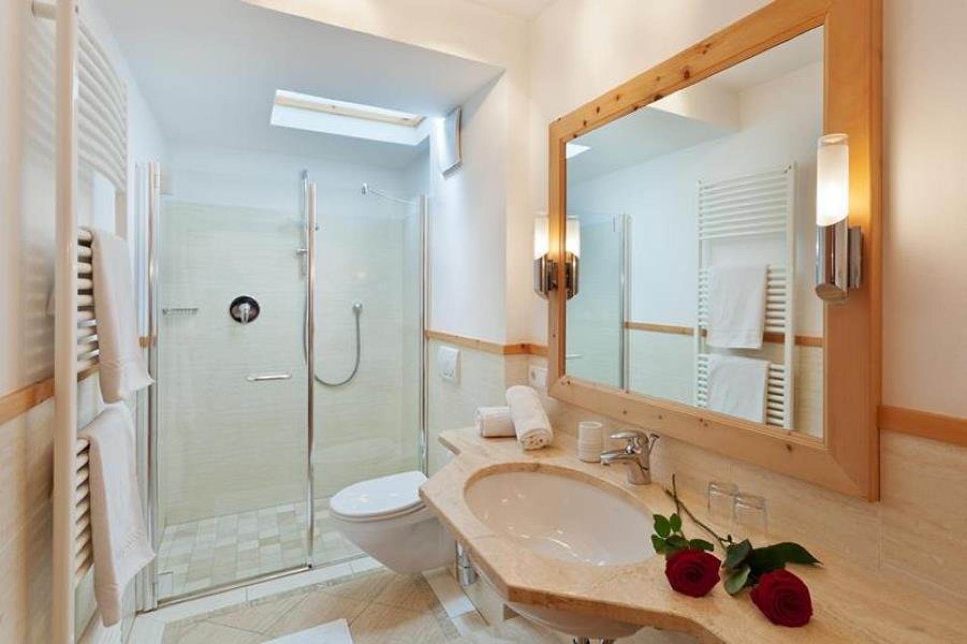 La nostra camera familiare è di circa 31m² (per 4 persone), con una panchina d'angolo, TV LCD, cassaforte e bagno con wc, doccia, doppio lavabo, asciugacapelli, specchio cosmetico e un termoarredo.