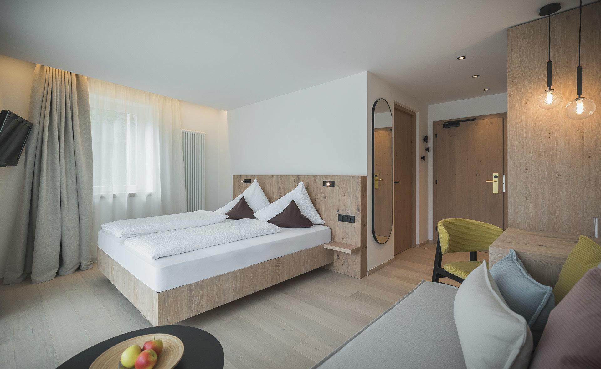 Le camere combinano il design moderno con lo stile alpino e vi accolgono in un'atmosfera di puro comfort. Ogni dettaglio è pensato per regalarvi un soggiorno di assoluto relax.