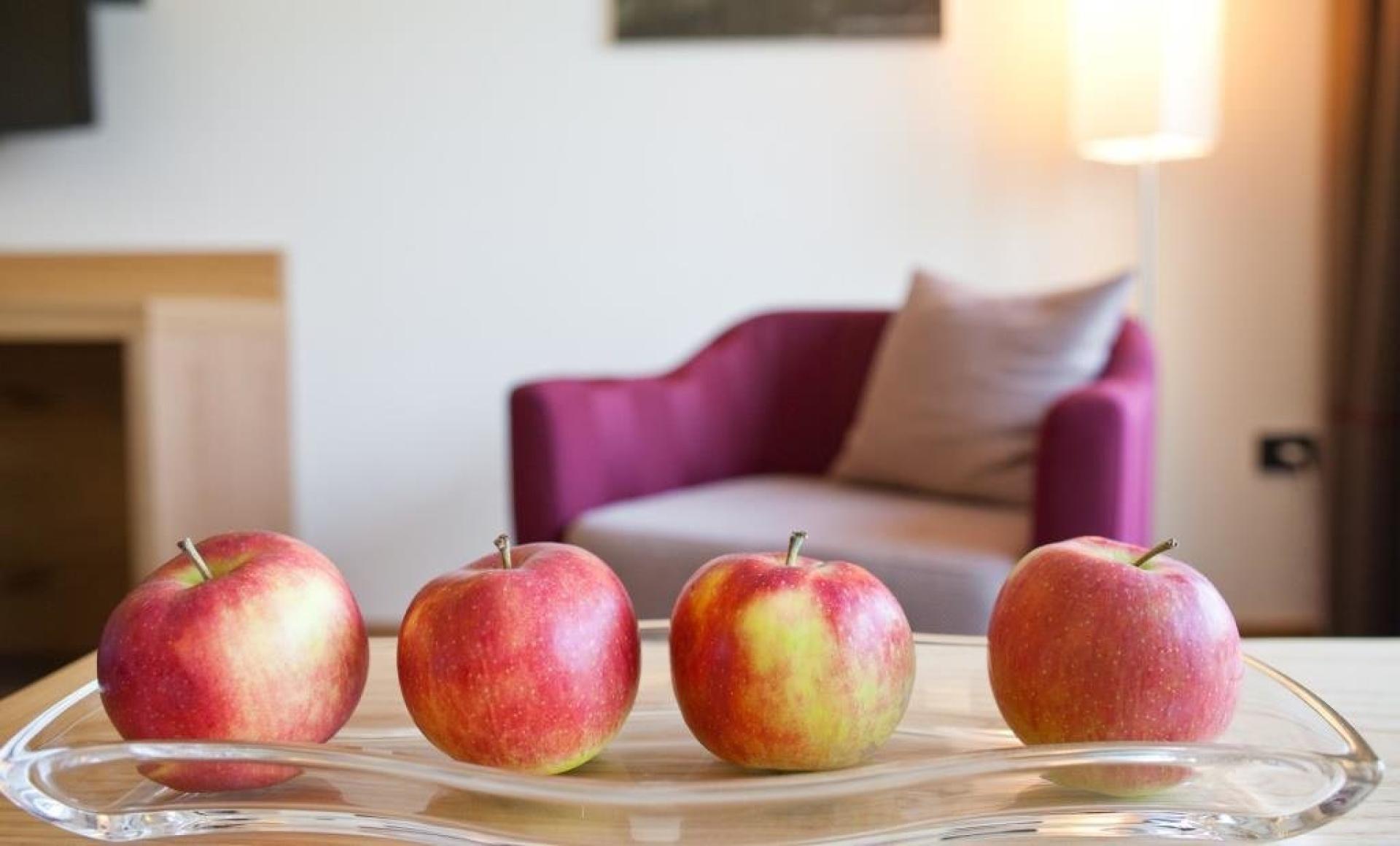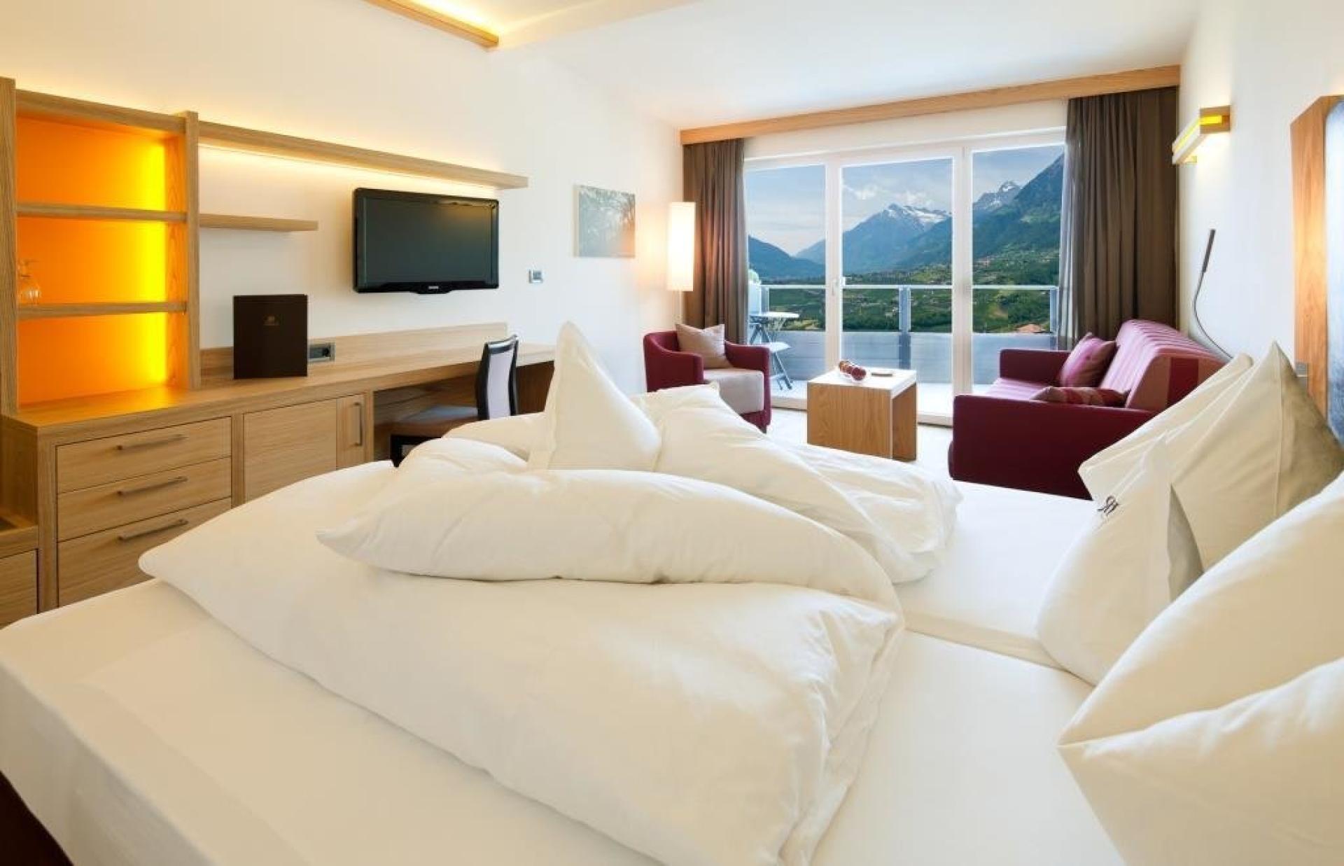 Suite (53 m²) con due camere da letto separate, ampia zona giorno, bagno e doccia, WC / bidet separato, lavabo doppio, asciugacapelli, specchio da trucco, accappatoi e ciabatte, televisione a schermo piatto con satellite, telefono, radio, cassaforte, minibar, collegamento internet, area condizionata e con balcone rivolto a sudovest con meravigliosa vista panoramica su Merano e le montagne circostanti.