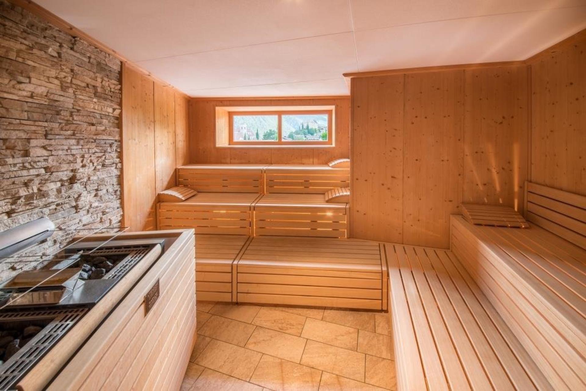 Suite (60m² e terrazza con 35m²) con due camere da letto separate, ampia zona giorno, bagno e doccia, WC / bidet separato, lavabo doppio, asciugacapelli, specchio da trucco, accappatoi e ciabatte, televisione a schermo piatto con satellite, telefono, radio, cassaforte, minibar, collegamento internet, area condizionata, grande terrazza sul tetto con vasca idromassaggio, balcone rivolto a sudovest con meravigliosa vista panoramica su Merano e le montagne circostanti.