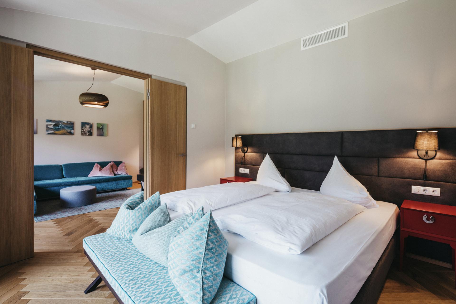 Questa suite è un vero gioiello. Modernamente arredata, sfoggia tuttavia giocosità ed eleganza. Colori che attraggono lo sguardo e creano allo stesso tempo piacevoli dettagli, completando le forme e dando carattere a questa suite. Abbandonatevi alla comodità del grande letto, godendovi un sonno profondo e ore di relax.