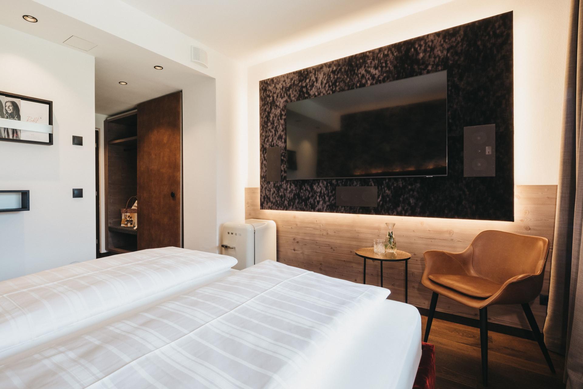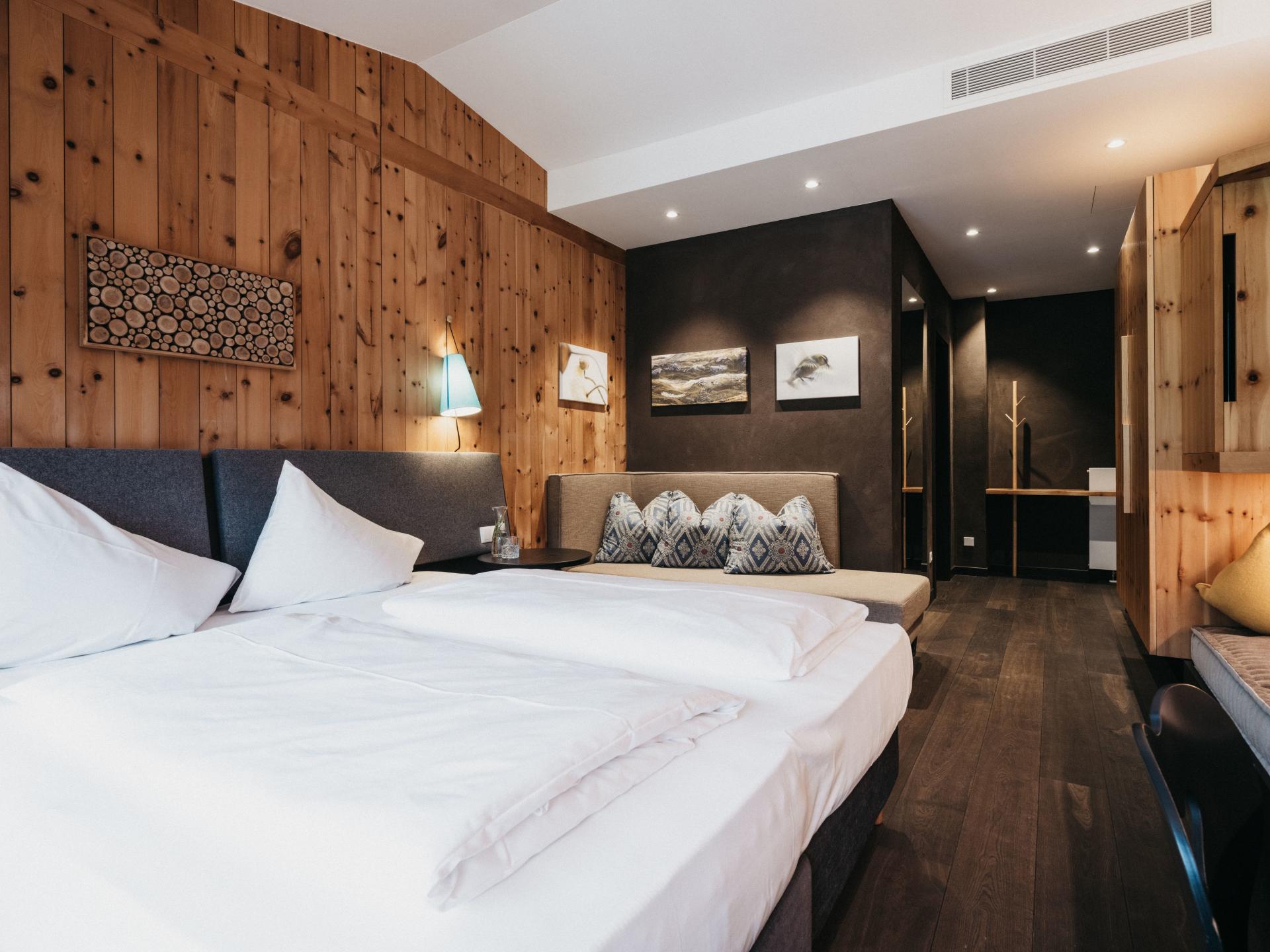 Nella Double Design la modernità incontra il comfort alpino e lascia spazio ai sogni individuali. Stoffe e materiali ricercati creano la giusta atmosfera e regalano intimità. L’elegante angolo salotto di design è una vera attrazione, mentre l’accogliente letto invita a godere un po’ più a lungo del dolce riposo.