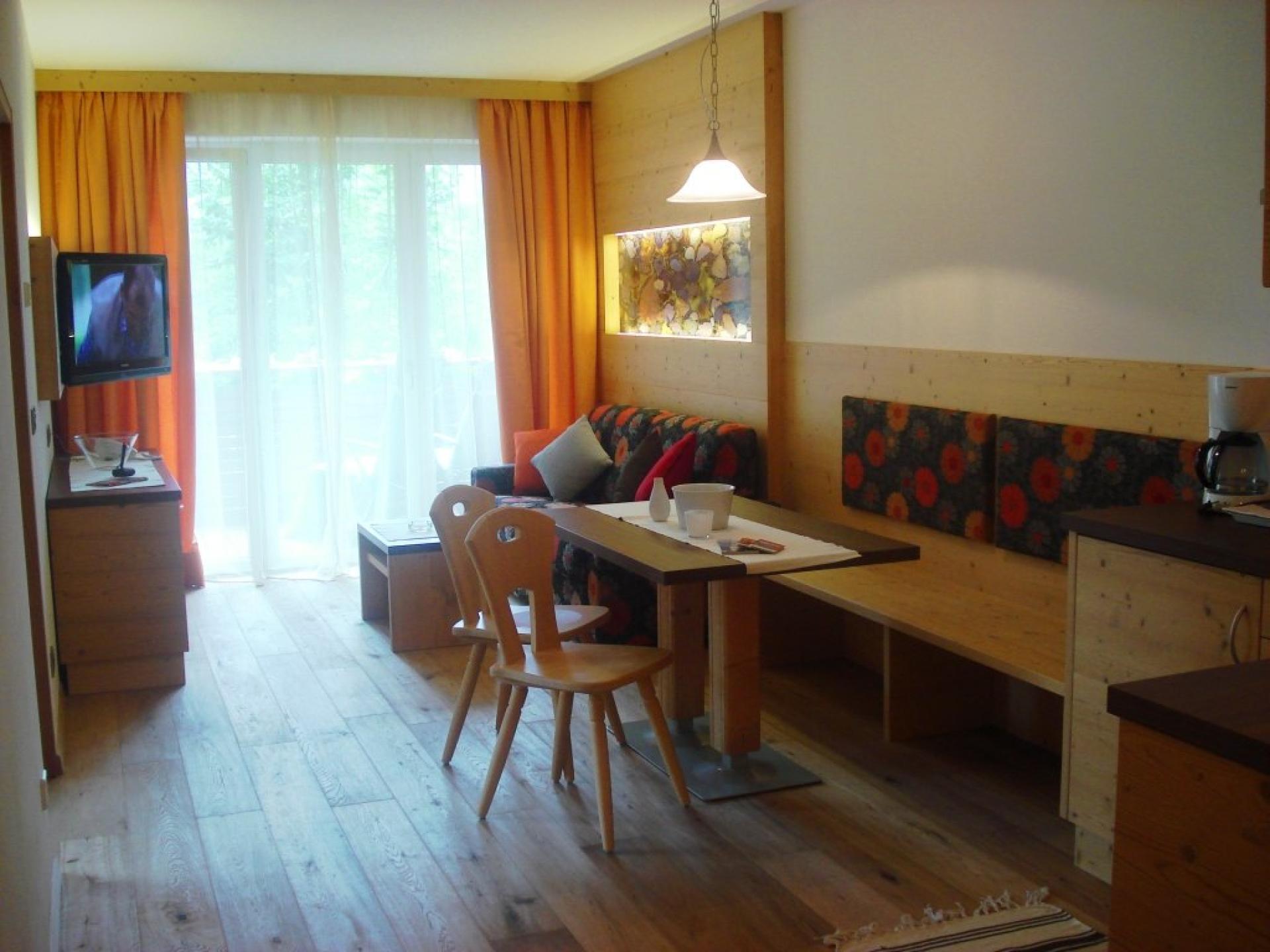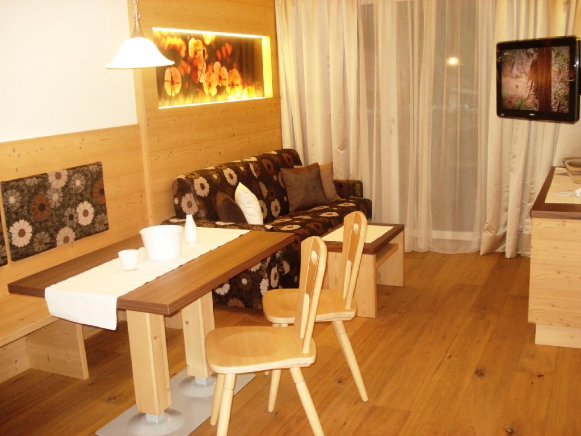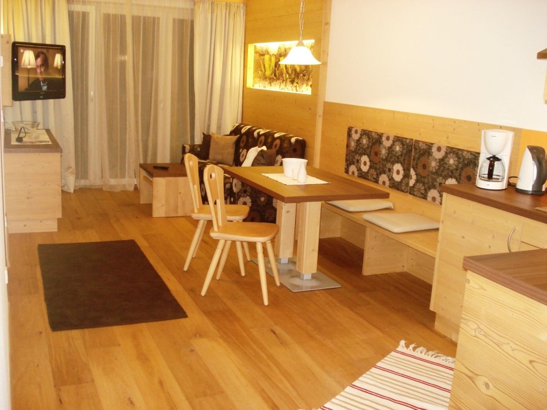 37m² spazio alloggio + 14 m2 terrazza o balcone a lato Sud 1 camera da letto per due persone, 1 soggiorno con comodo divano letto matrimoniale, tavolo per 4 persone, TV, cassaforte, radio, telefono, connessione Wireless, cucina completamente arredata con piano cottura elettrico Ceran, frigorifero, lavastoviglie, macchina per il caffè, stanza da bagno con doccia, WC, bidet, fon e specchio d’ingrandimento, balcone attrezzato con tavolo e sdraio.
