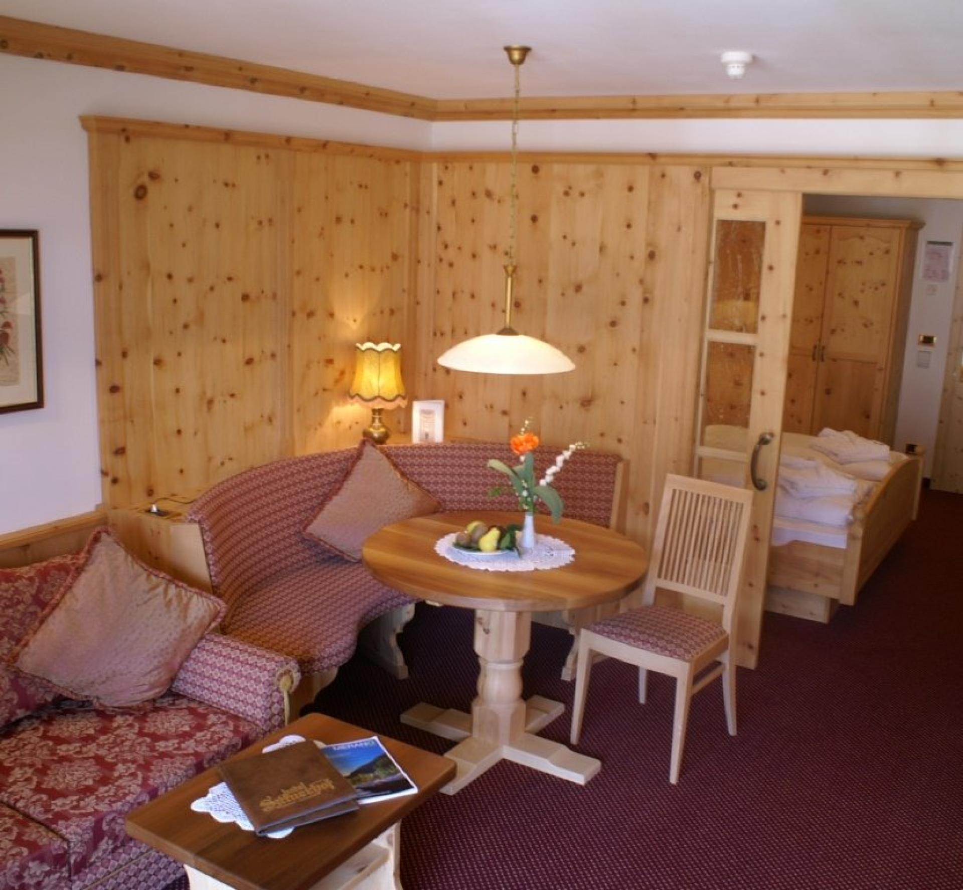 con letto matrimoniale nella camera da letto e divano letto matrimoniale nella camera di soggiorno, separabili con una porta scorrevole, bagno e doccia, WC, bidet, fon, accappatoi, ciabattine, specchio d'ingrandimento, radio, TV, telefono, cassaforte, frigobar e comoda panca ad angolo.