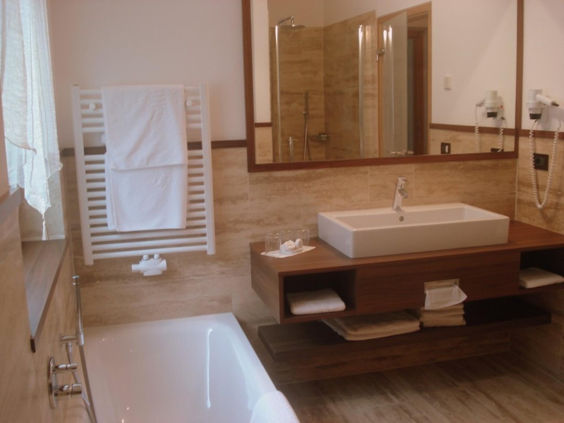 con balcone, bagno e doccia oppure grande vasca ad angolo, WC, bidet, fon, accappatoi, ciabattine, specchio d'ingrandimento, radio, TV, telefono, cassaforte, frigobar e comoda panca ad angolo o scrivania.