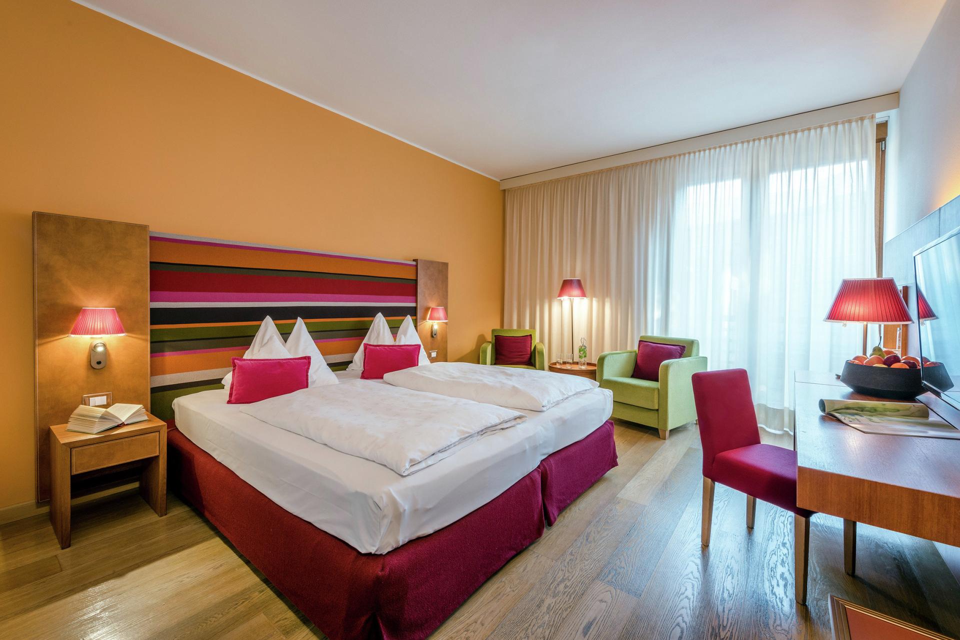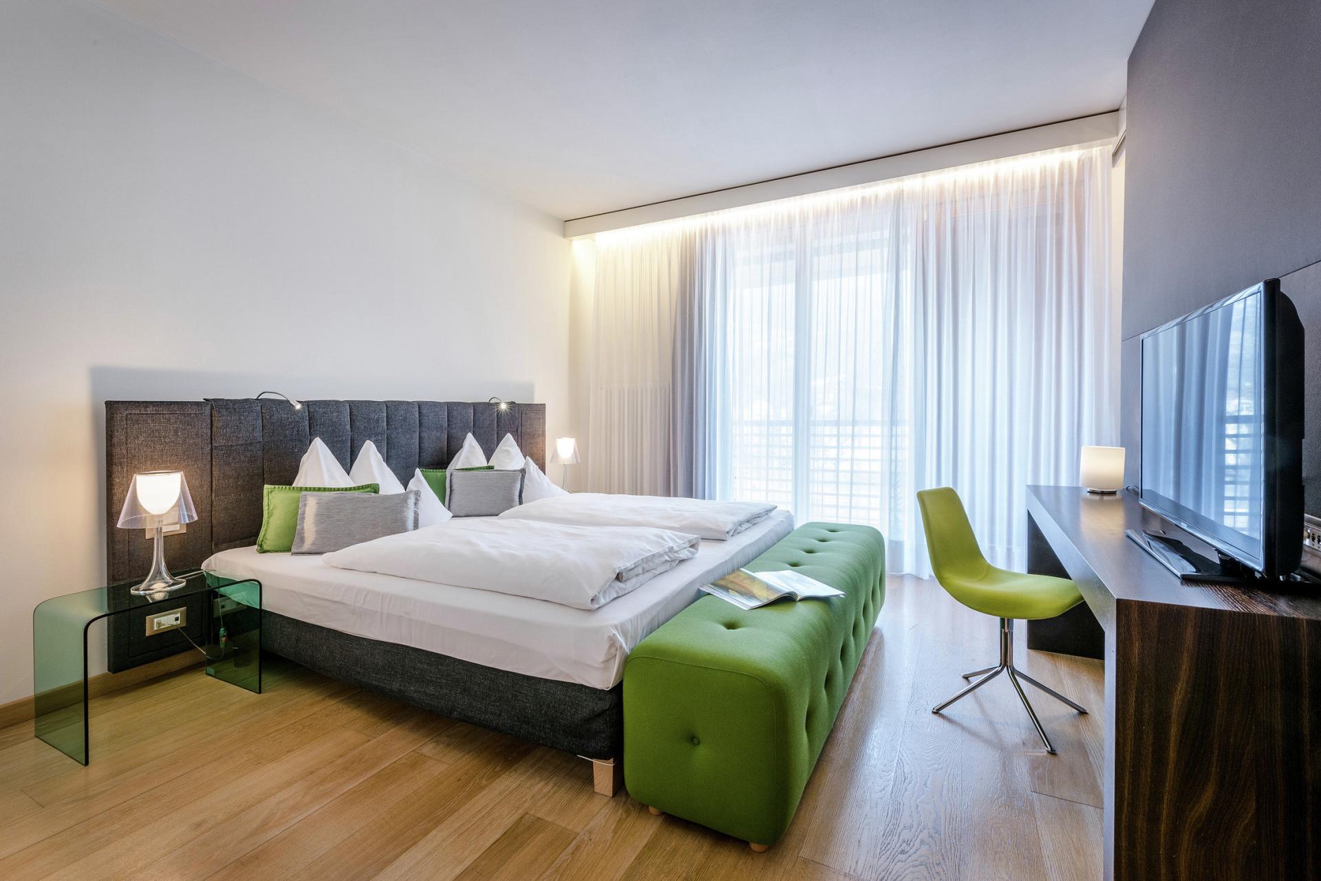 Le moderne camere doppie MeranO (ca. 30 m²) si affacciano su una vista in diverse direzioni. Le alte finestre offrono alla camera un'atmosfera confortevole. Bagno con doccia e mobili in legno naturale presenti nella camera trasmettono un immediato senso di benessere per la vostra vacanza.