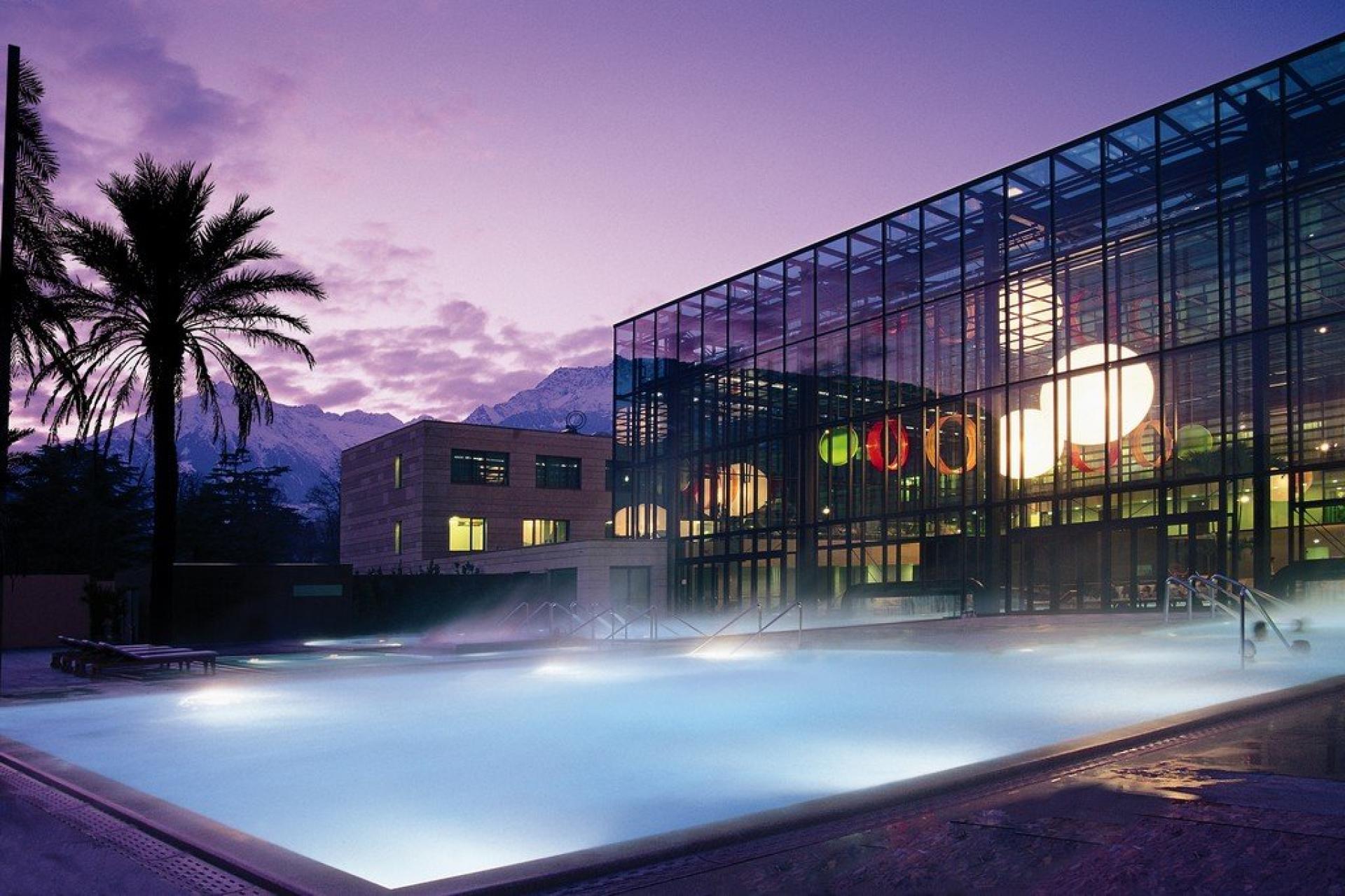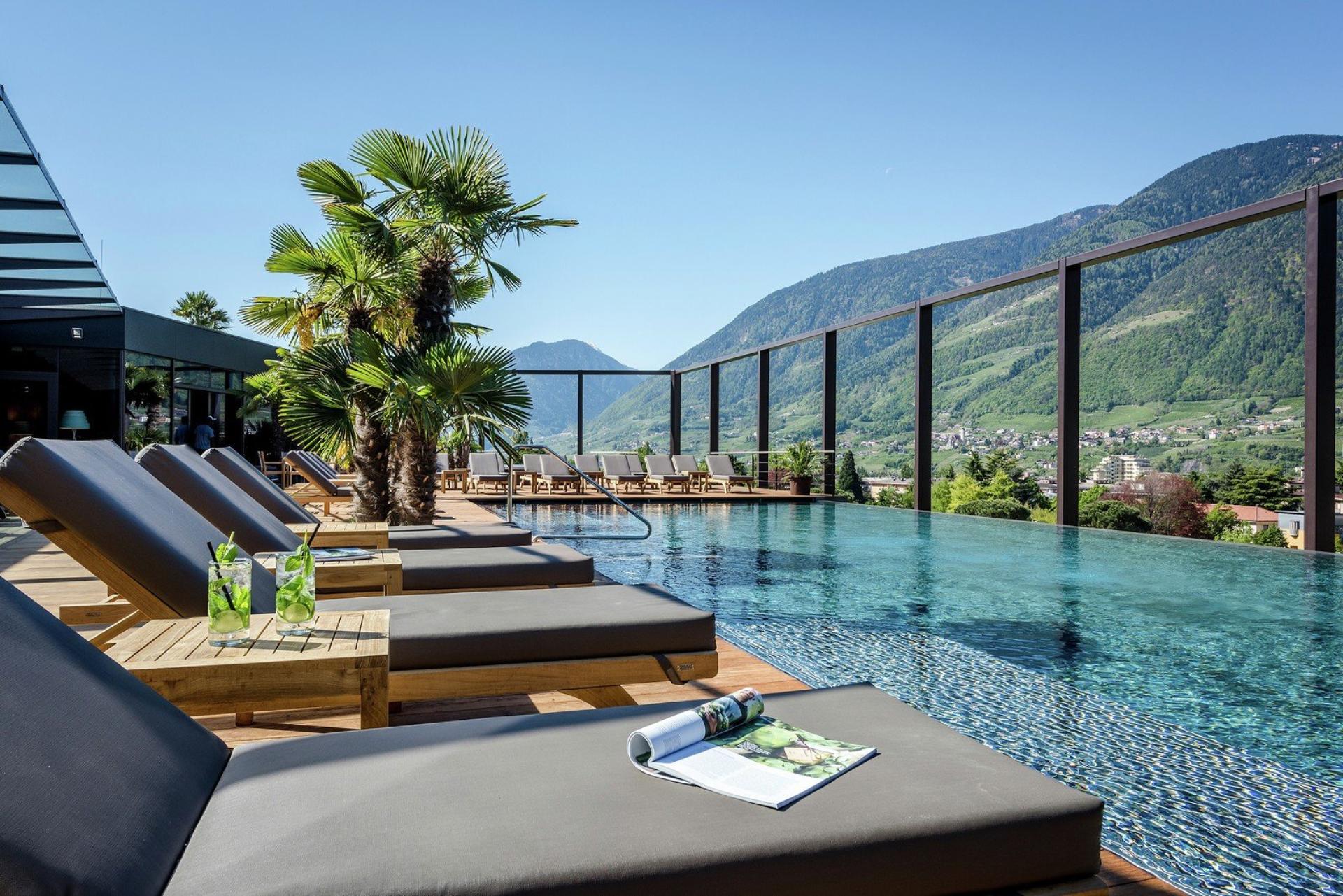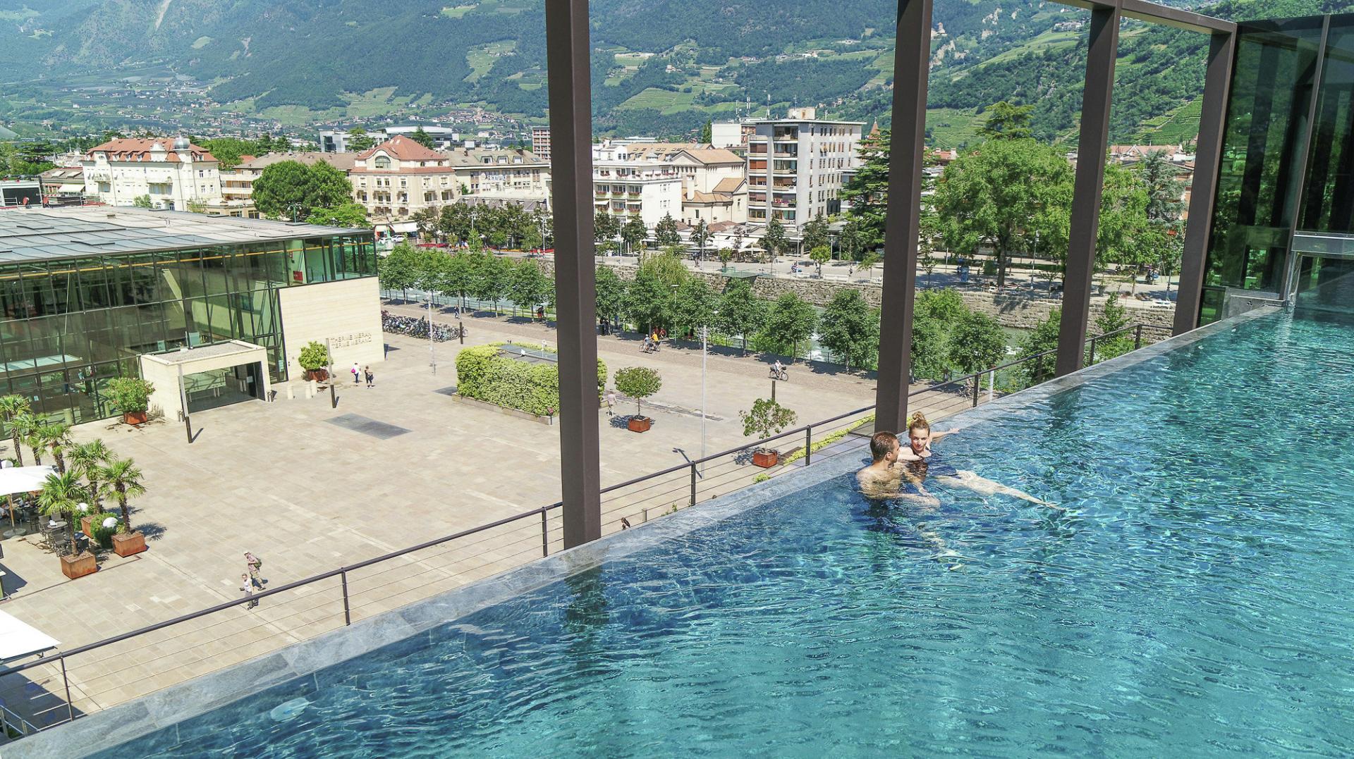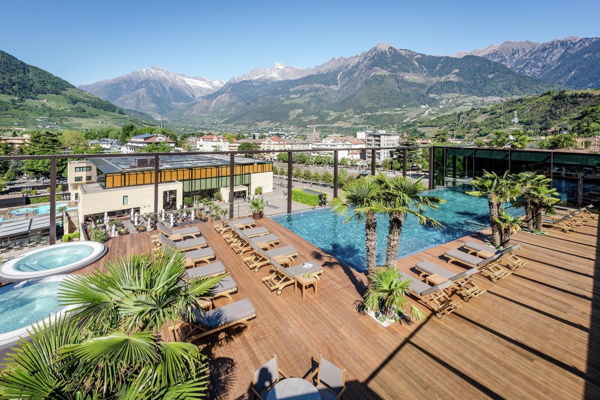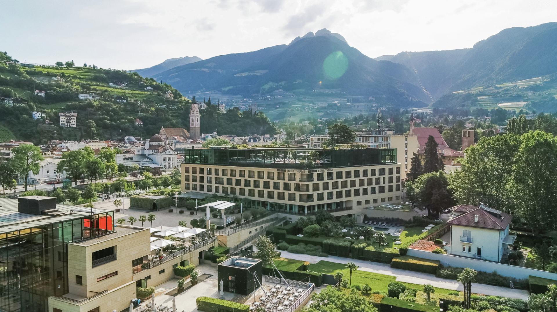 L'hotel si presenta con un innovativo design dalle linee pulite in contrasto con interni originali ricchi di dettagli abbinati a legno e pietra. Situato nel centro di Merano, gode di ampi spazi verdi e di un collegamento riservato ed esclusivo con le Terme di Merano. All’esterno l’Hotel Terme Merano è lineare e in perfetta armonia con l’architettura del 19. secolo che lo circonda. Varcata la soglia si entra in un mondo nobile e raffinato. Accessori dai colori vivaci abbinati a legno e pietra. Tappeti in pelle di mucca e corna di cervo come lampade, si sposano con l’oro, il bordeaux e il verde mela. La struttura dispone di 115 camere e di 24 suite e tre ampi aree spa. La „Sky Spa“ di 3.200 mq è un vero paradiso del benessere con una varietà di trattamenti, infinitypool, saune, bagno turco e sala relax con vista di 360 gradi sulle montagne. La "Garden Spa" é dotata di aree relax, piscina esterna ed interna, sauna dress-on e un ampio giardino per rilassarsi sotto le palme. Dalla "Garden Spa" è possibile raggiungere le piscine delle Terme Merano attraversando comodamente in accappatoio il tunnel che le collega. In più aspetta il ristorante “Olivi” con raffinati menu di cena, il Bistro “La Piazza” e la "Palm Lounge” con terrazza esterna per gli amanti dei cocktail.