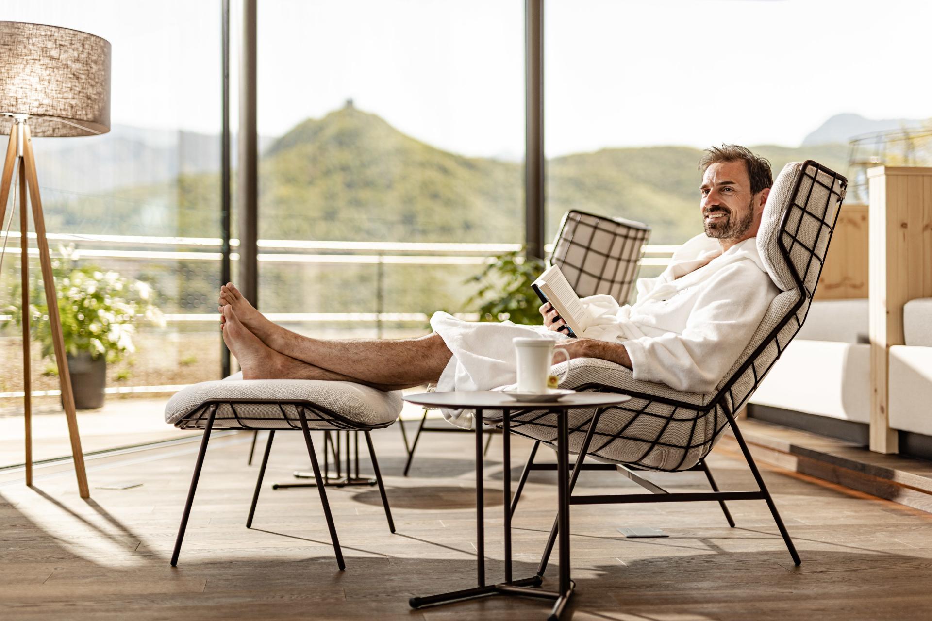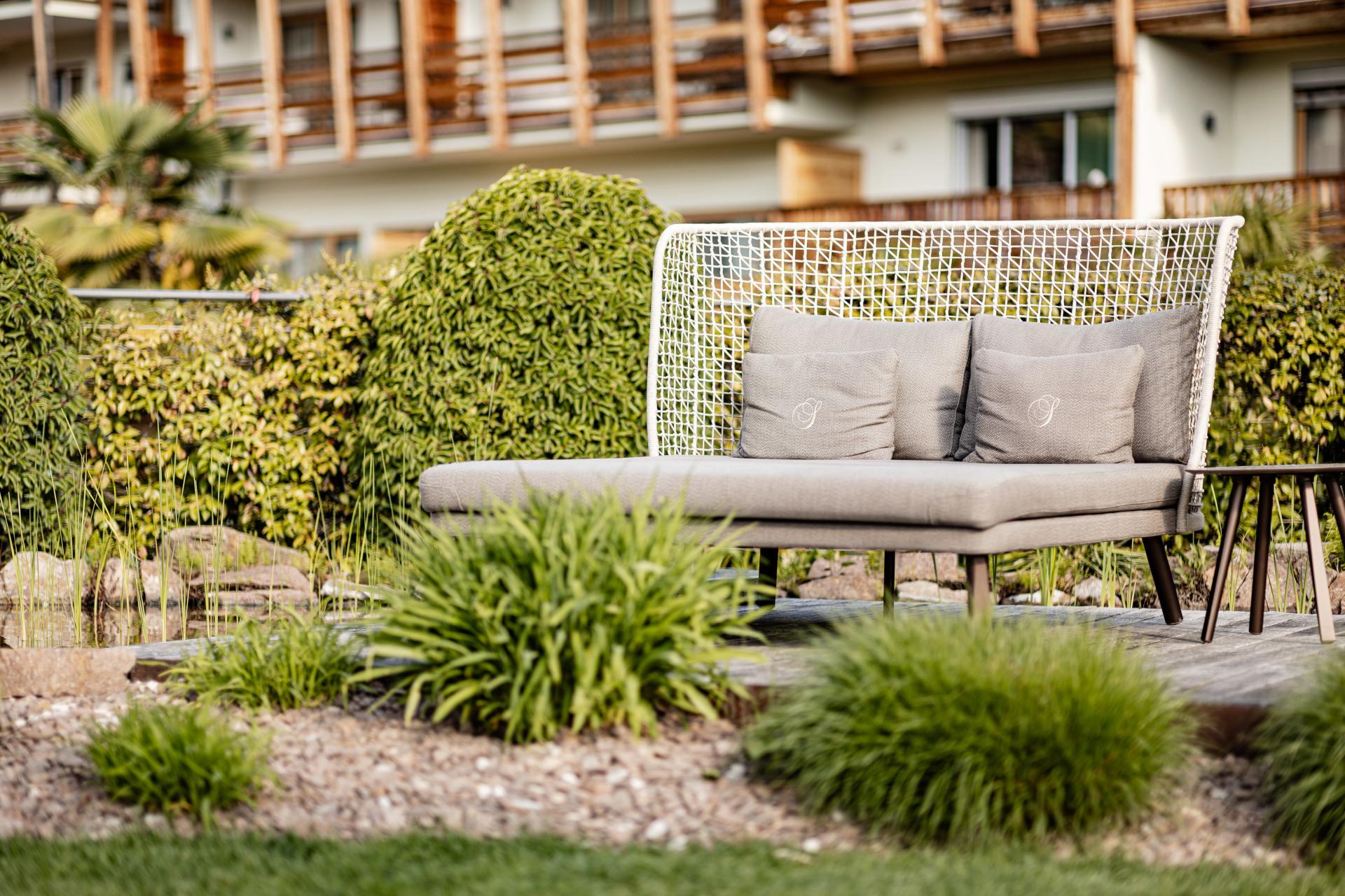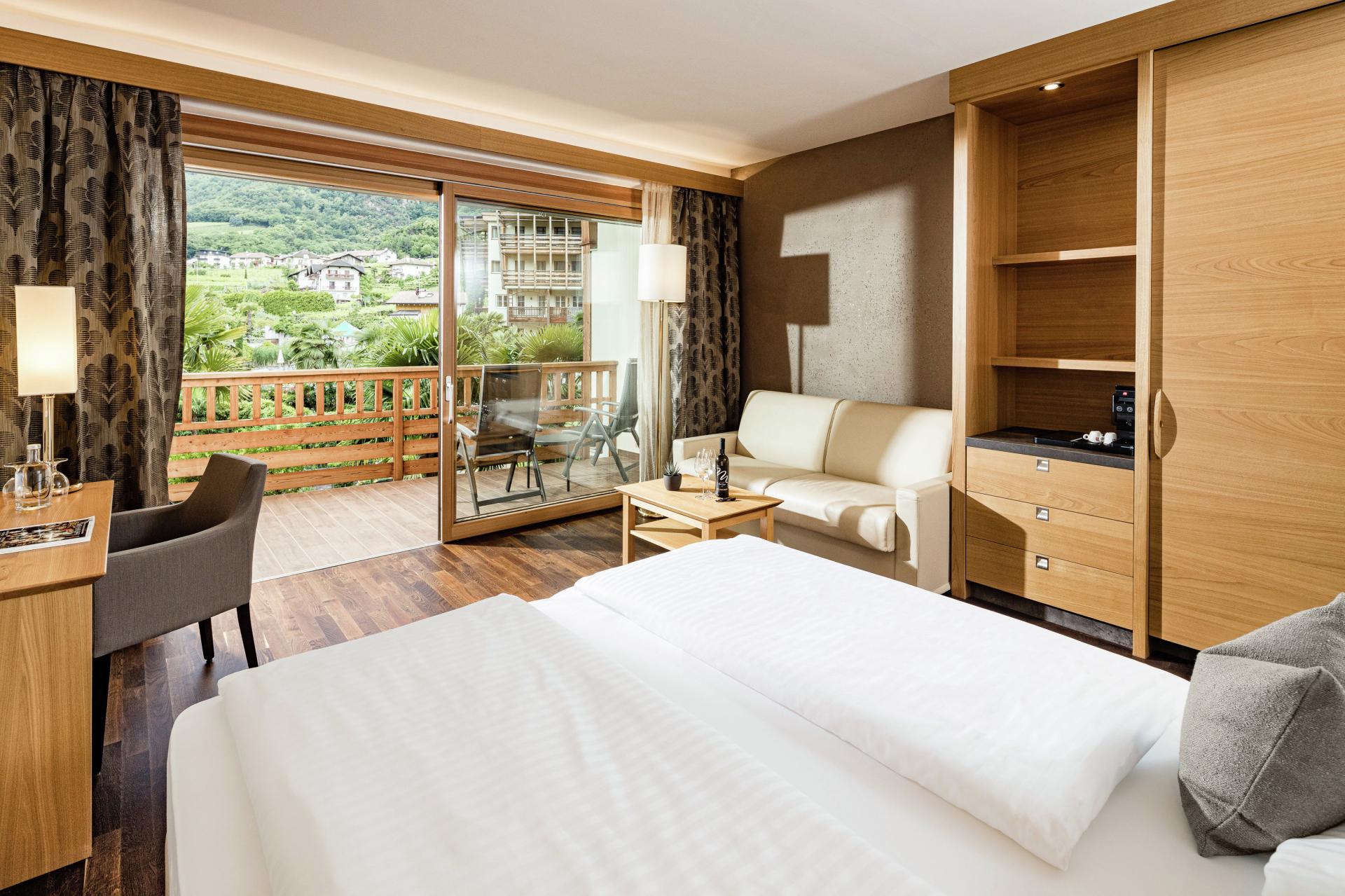 La Junior Suite Lacus è esposta a sud, ovest o sud-est e offre circa 36 m² di confortevole spazio abitativo. Il balcone, arredato con sedute di design, si affaccia sul giardino mediterraneo, in direzione del Lago di Caldaro o sui vigneti circostanti.