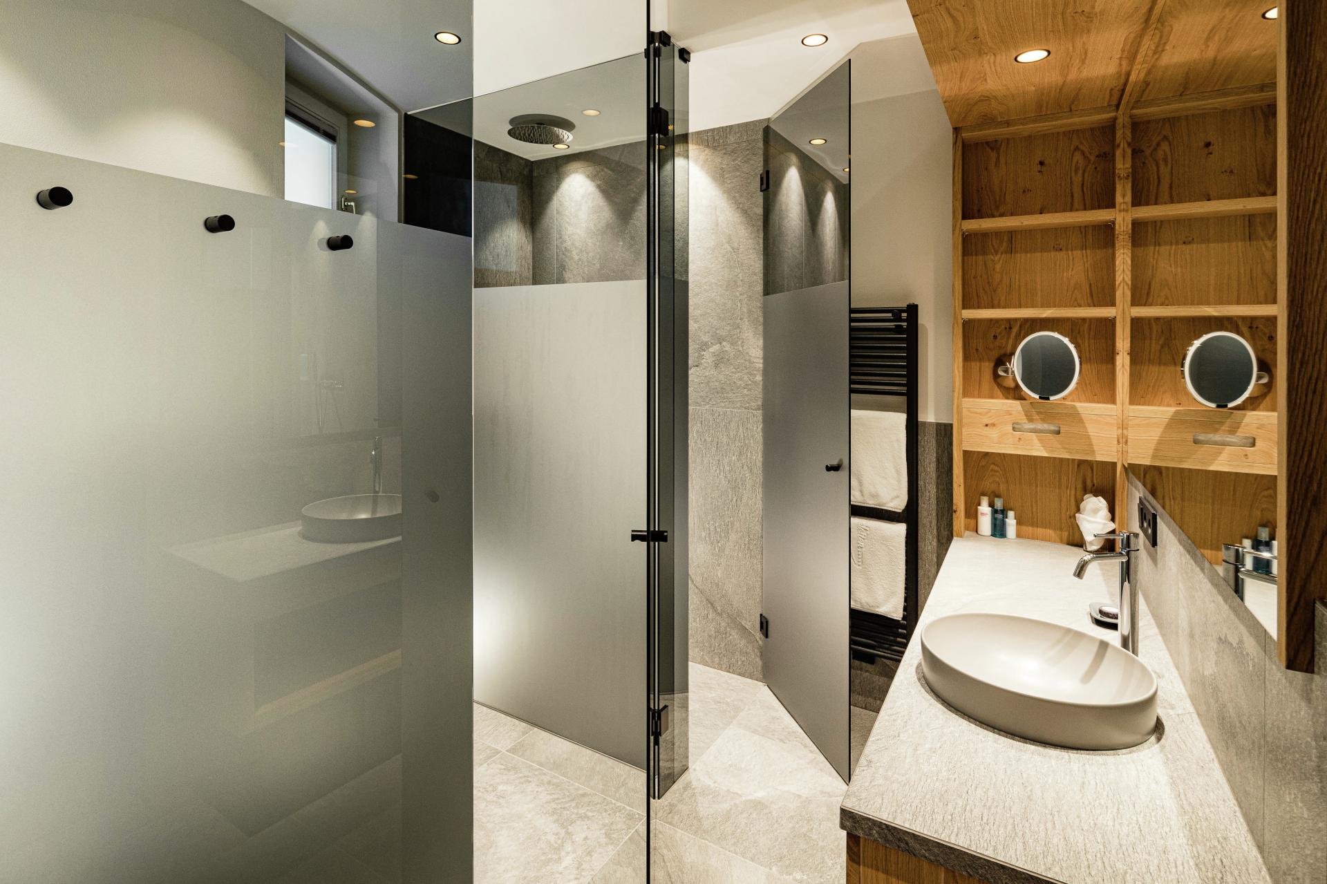 La suite è arredata con mobili su misura in legno di rovere, un caldo pavimento in legno e una chaise longue di design con tavolino. Il bagno è concepito in versione open space o separabile e dispone di vasca e doccia. Il WC con bidet è separato.