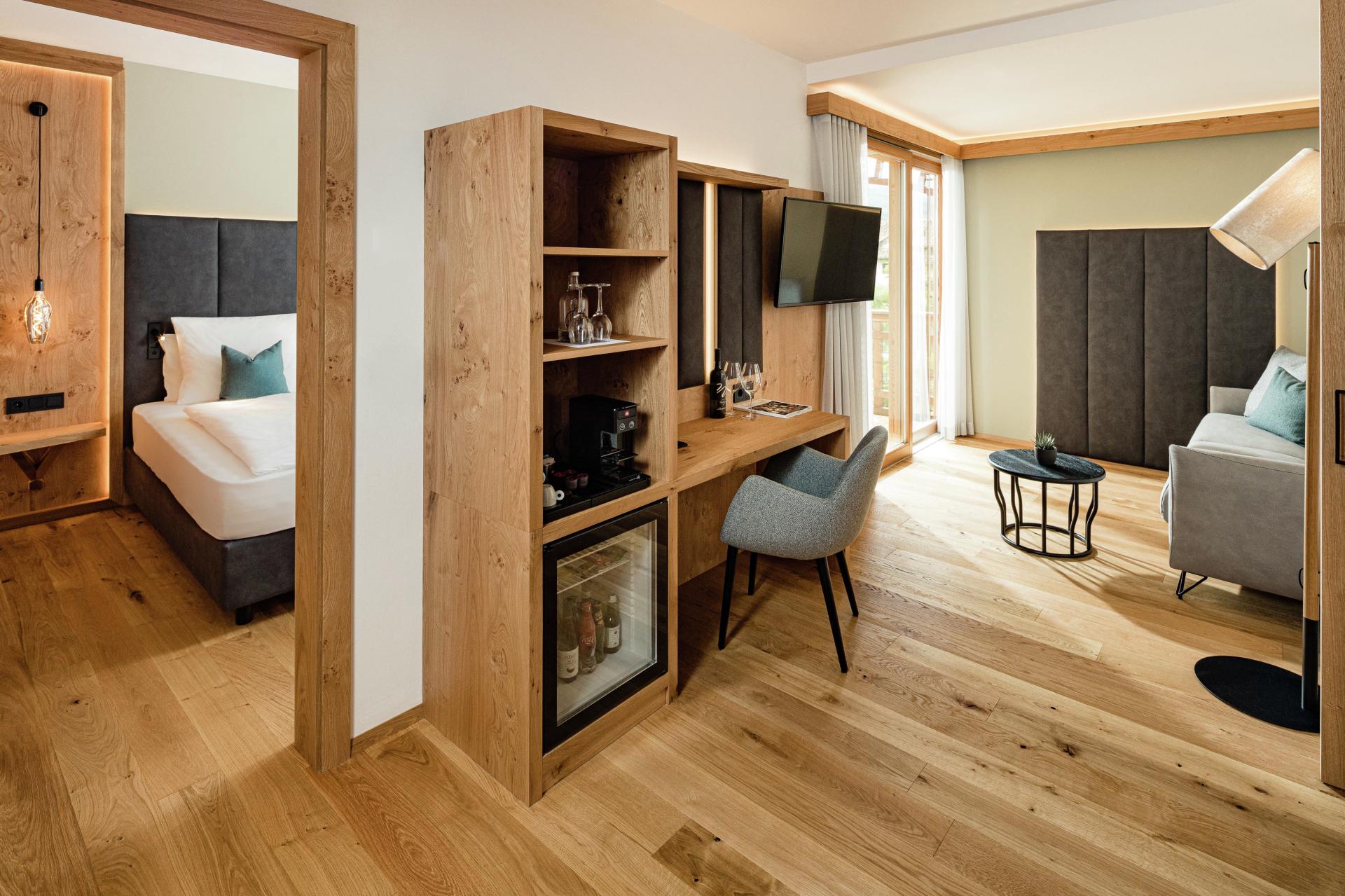 La Suite Flora è esposta a sud o sud-est e offre circa 60 m² di ampio comfort abitativo. Dispone di due camere da letto separate con letto matrimoniale e letto singolo, oltre a una zona giorno indipendente.