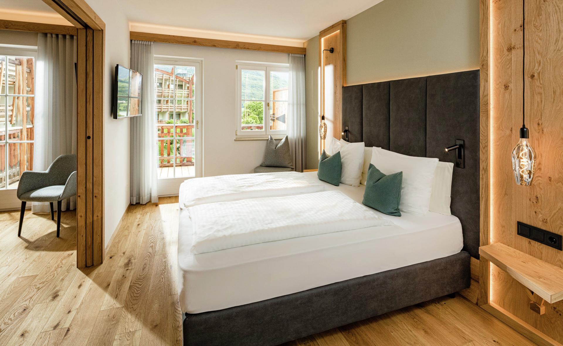 La Junior Suite Attico, situata all’ultimo piano, offre circa 36 m² di ampio comfort abitativo ed è progettata in modo accessibile e adatta a persone con allergie. Il balcone esposto a sud regala una splendida vista sul giardino e sul Lago di Caldaro.