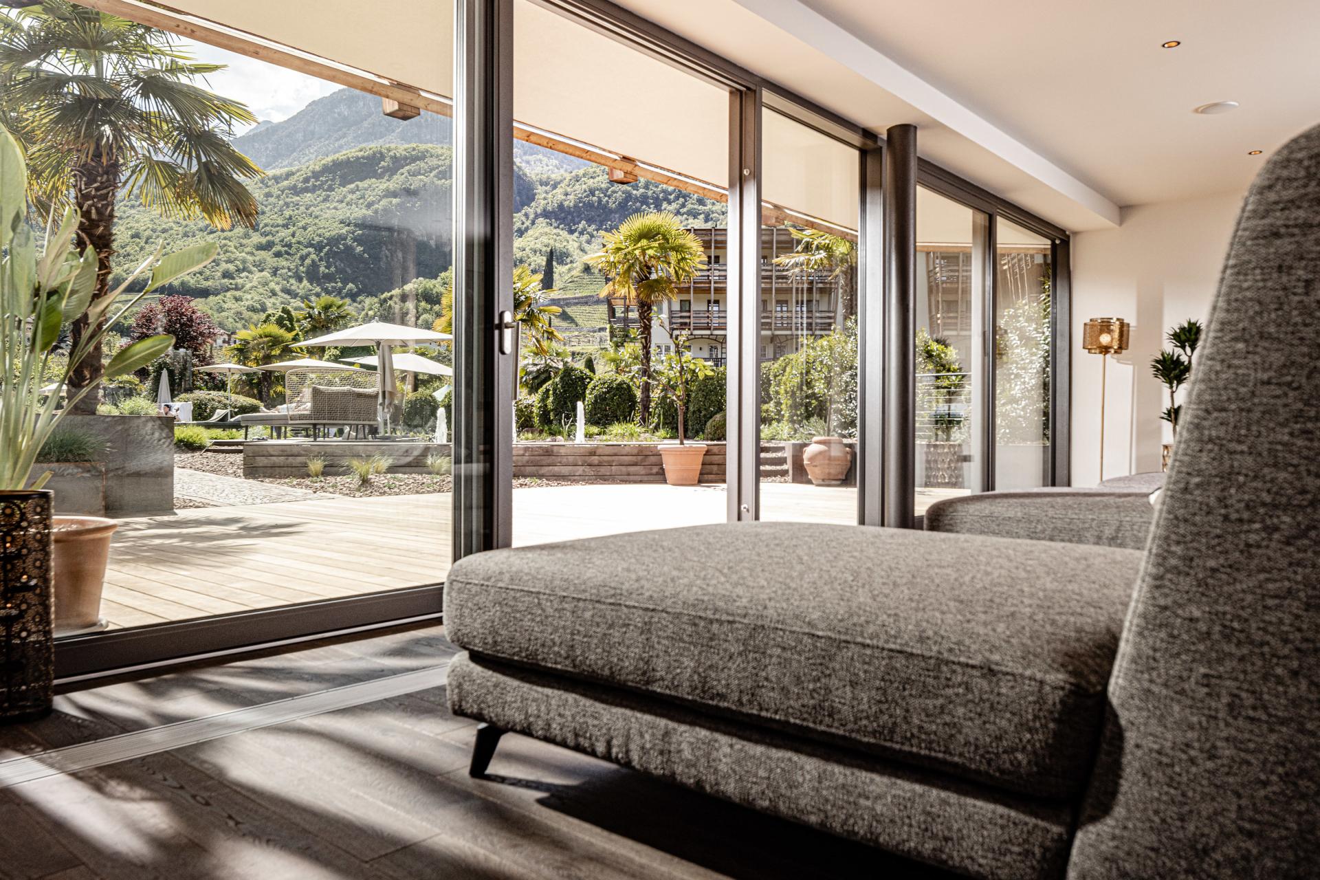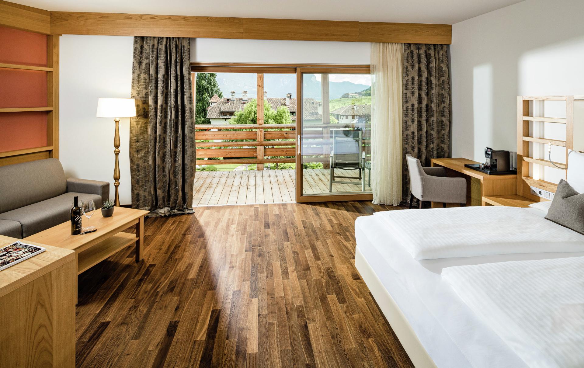 A seconda della suite, sono disponibili un balcone o un’ampia terrazza. La vista si estende sul giardino o verso il Lago di Caldaro.